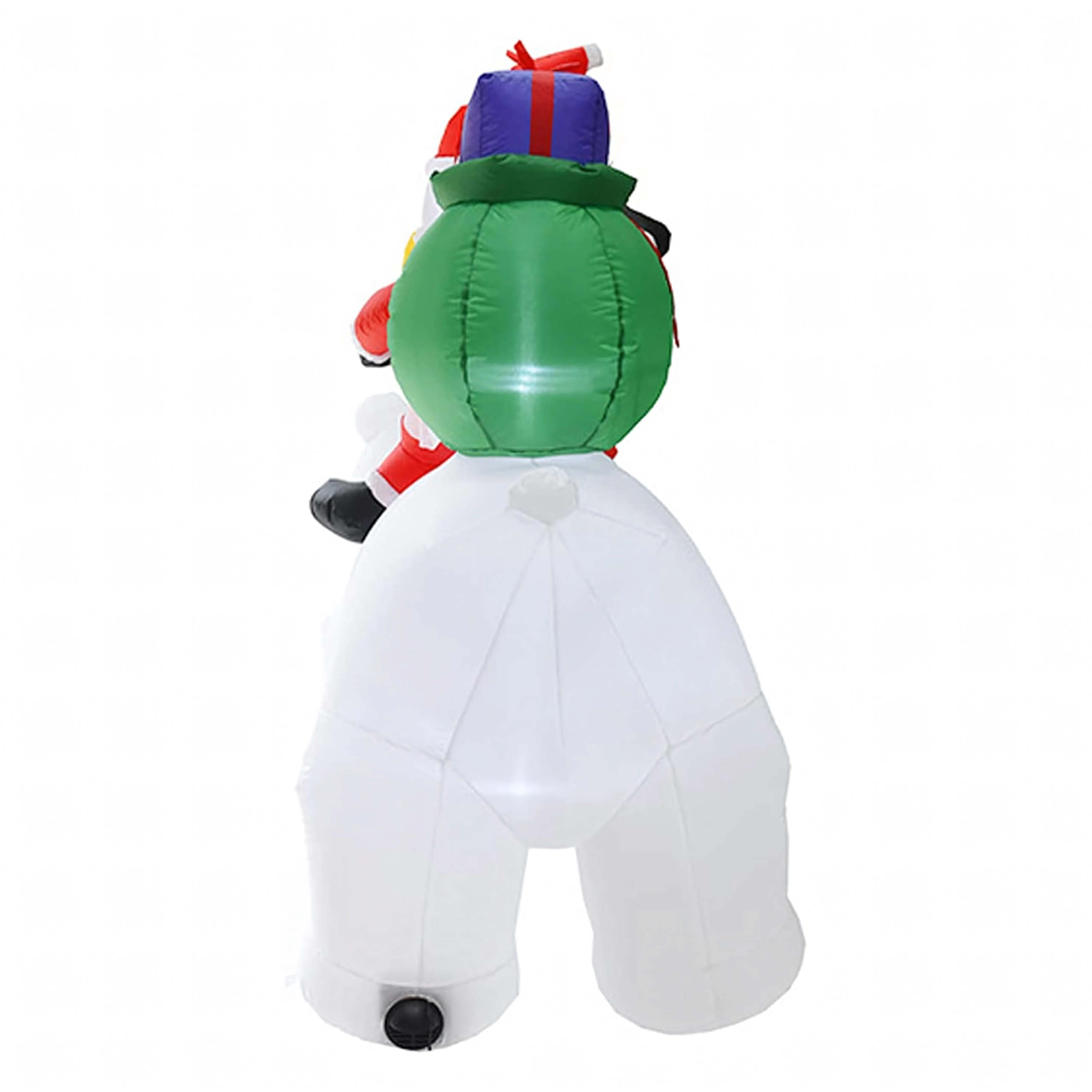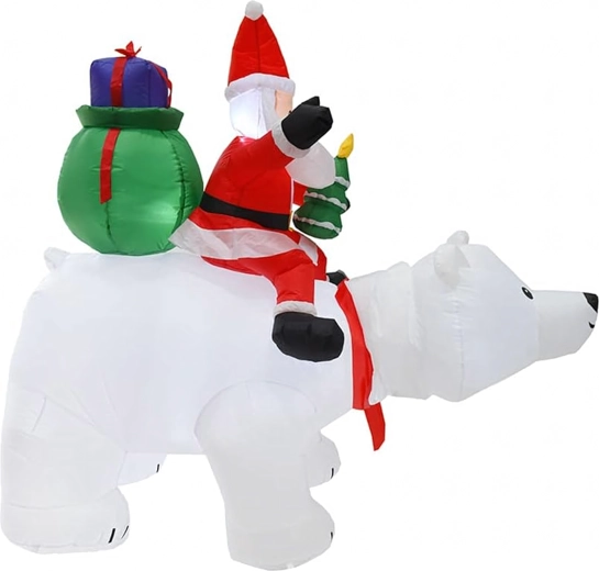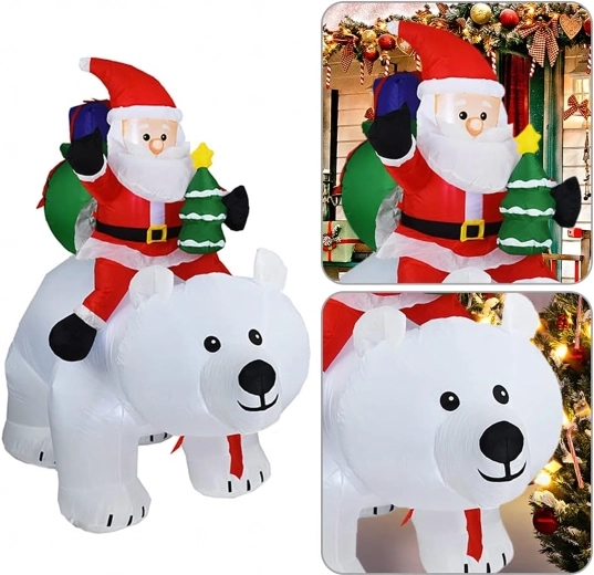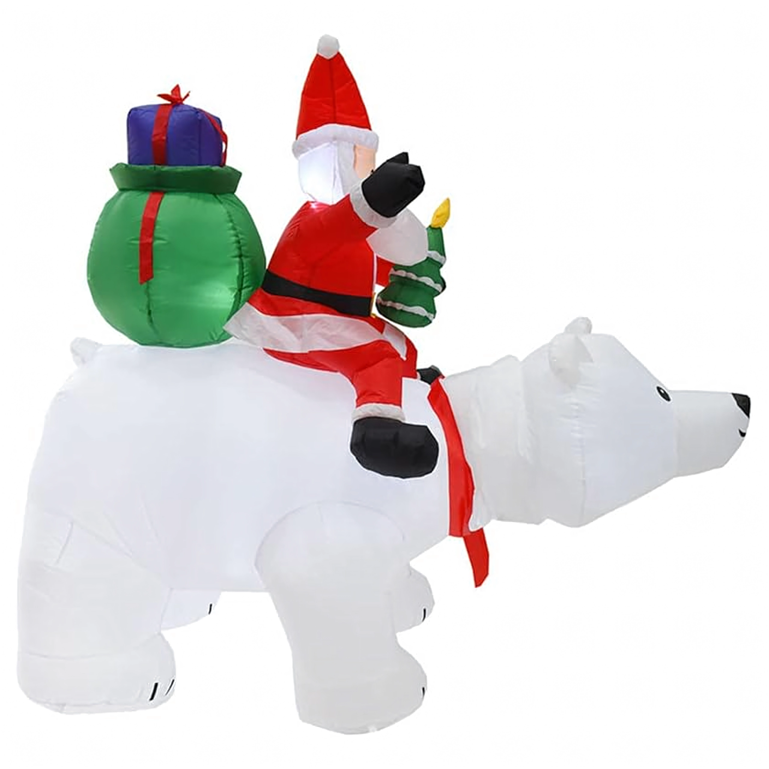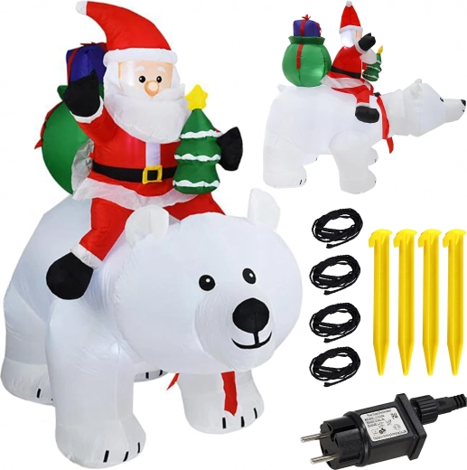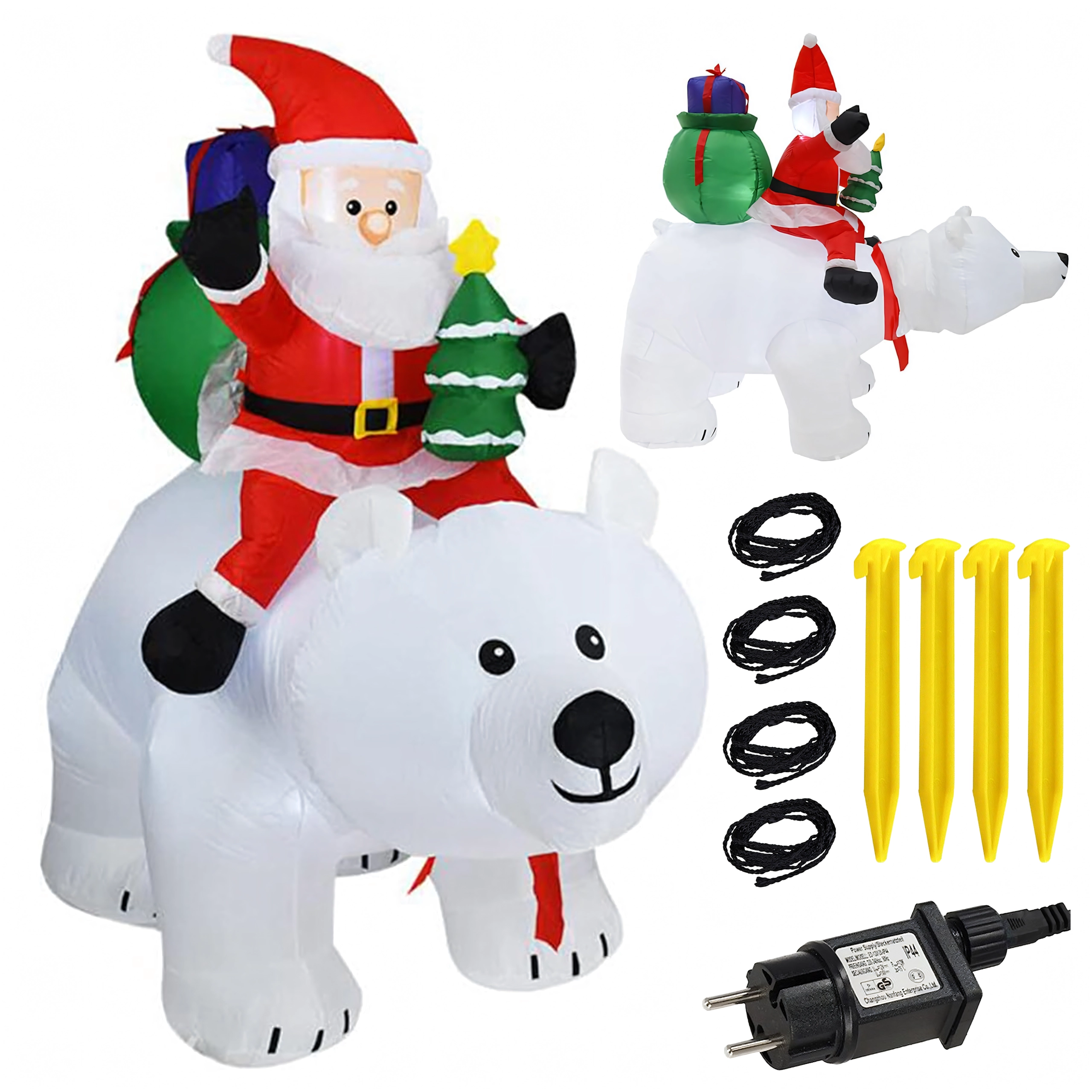 Storslået XXL juledekoration med Sankt Nikolaj på en bjørn, der oplyser dit hjem og din have. Integreret LED-belysning skaber en varm atmosfære, og den stille, hurtige blæser puster dekorationen op på ingen tid. Vandtæt og stabil udførelse egner sig til udendørs og indendørs brug og holder i mange sæsoner.