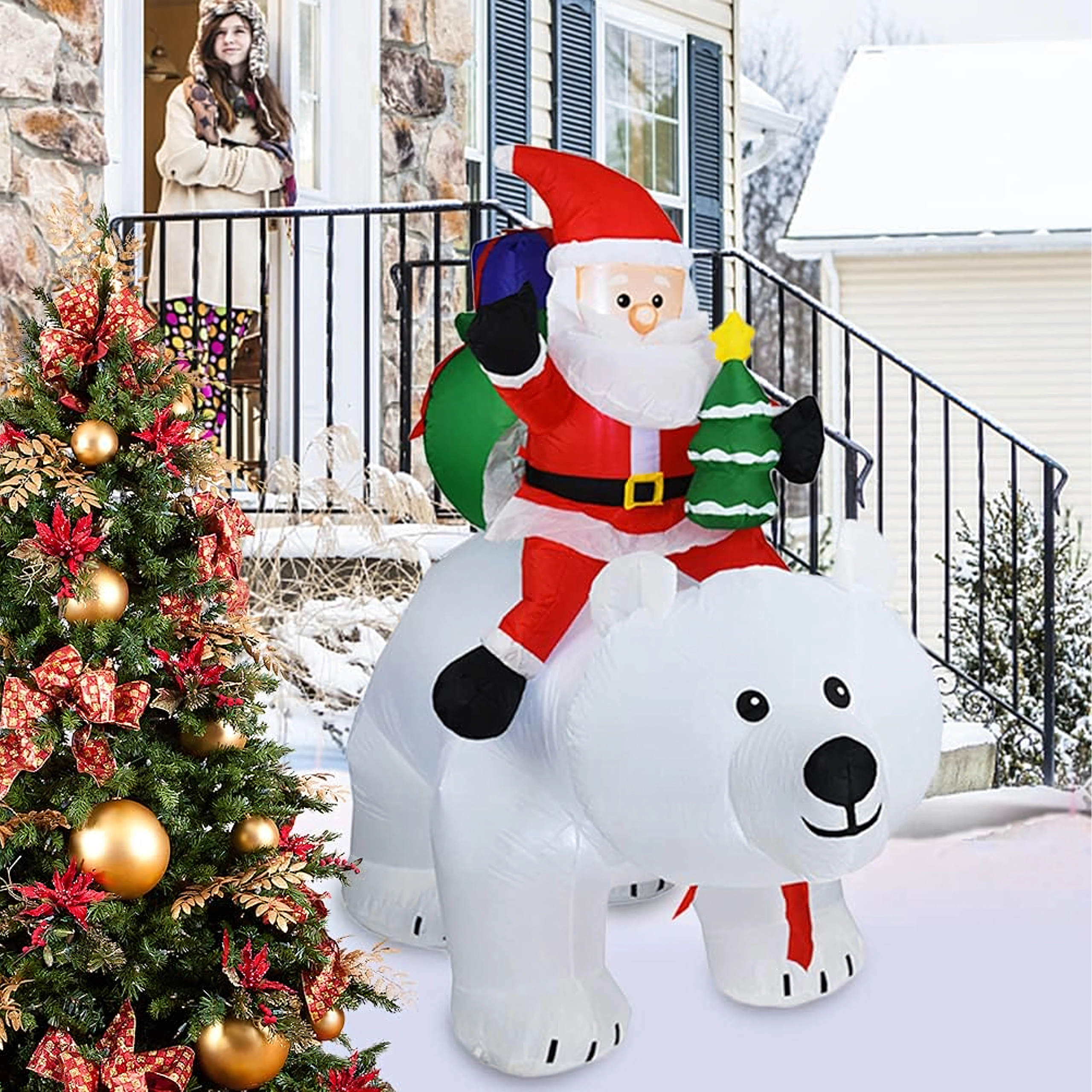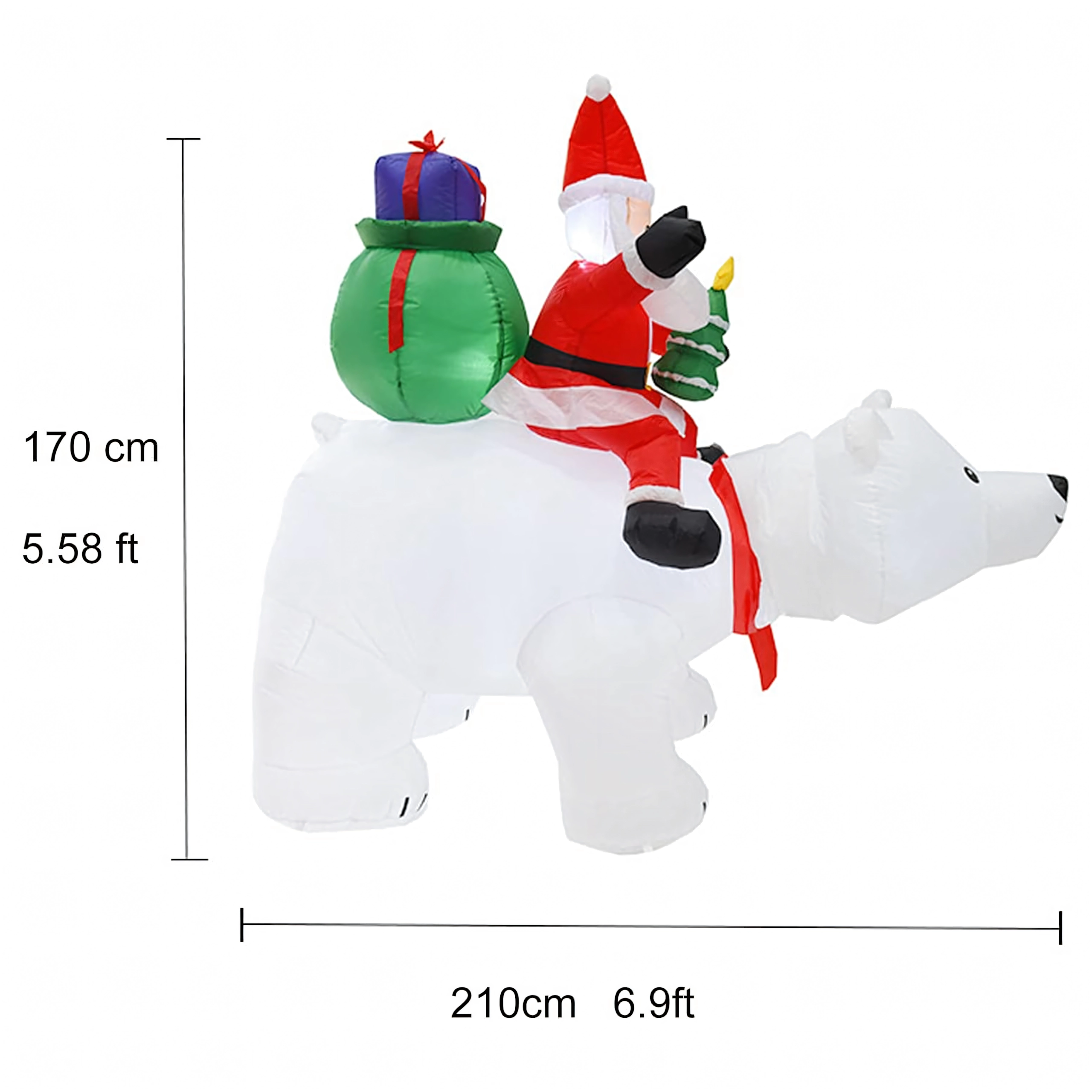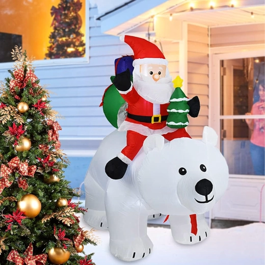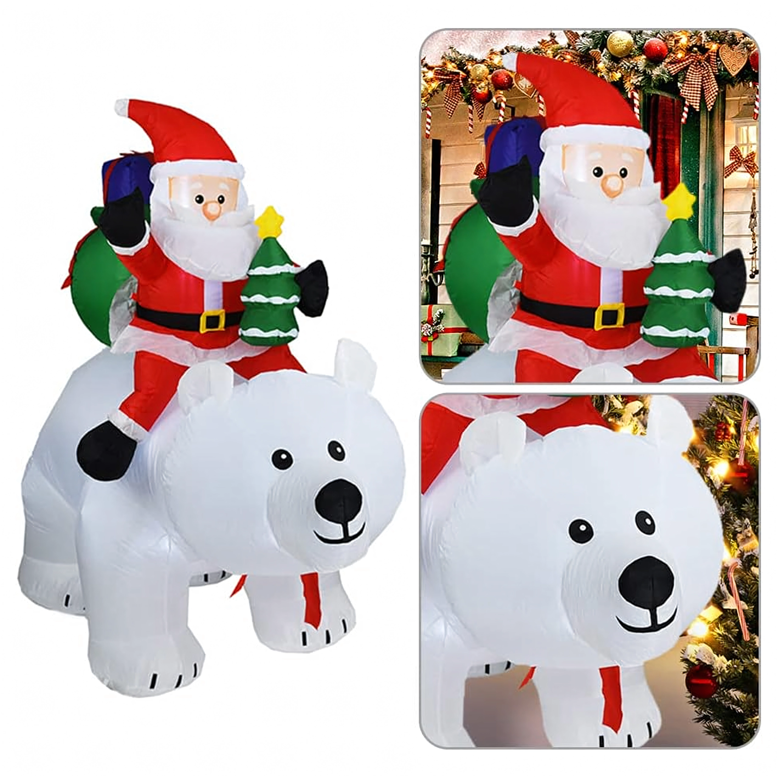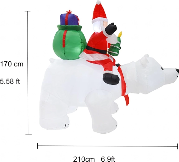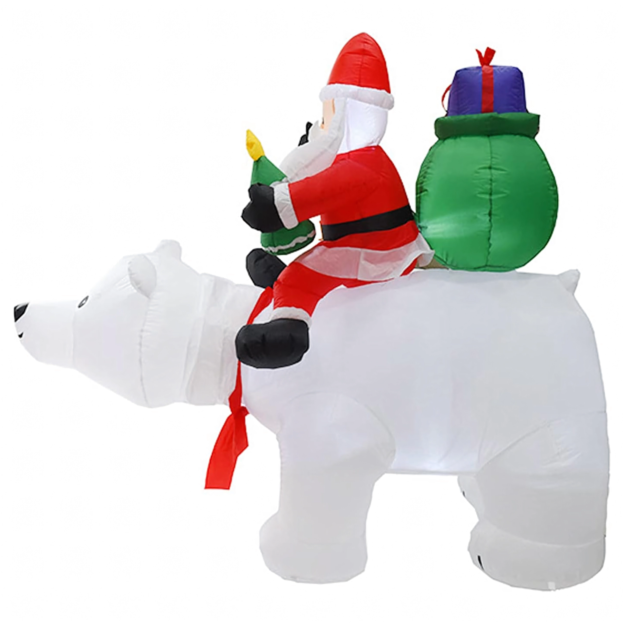 Storslået XXL juledekoration med Sankt Nikolaj på en bjørn, der oplyser dit hjem og din have. Integreret LED-belysning skaber en varm atmosfære, og den stille, hurtige blæser puster dekorationen op på ingen tid. Vandtæt og stabil udførelse egner sig til udendørs og indendørs brug og holder i mange sæsoner.