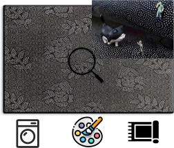 Oversiden er af et holdbart, blødt materiale for stille og jævn bevægelse af stolen. Undersiden med skridsikkert gummi forhindrer forskydning selv ved dynamisk siddestilling. Forstærkede syninger langs kanten holder formen og modvirker flossing. Måtten egner sig til hårde gulve – vinyl, sten, fliser, træ, laminat og beton.