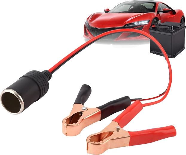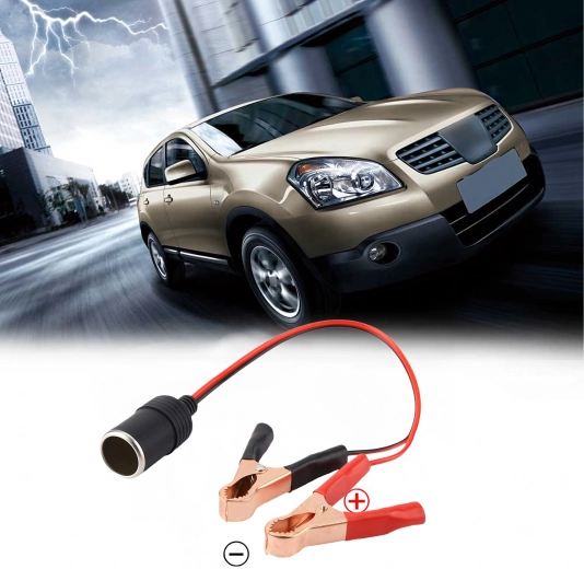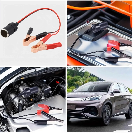 Adapteren til cigarettænderudtag med krokodilleklemmer forbinder strøm direkte fra køretøjets 12/24 V-system. Takket være de solide klemmer sikrer den hurtig tilslutning til batteriet eller enheder med bare poler og pålidelig energioverførsel uden kompliceret installation.