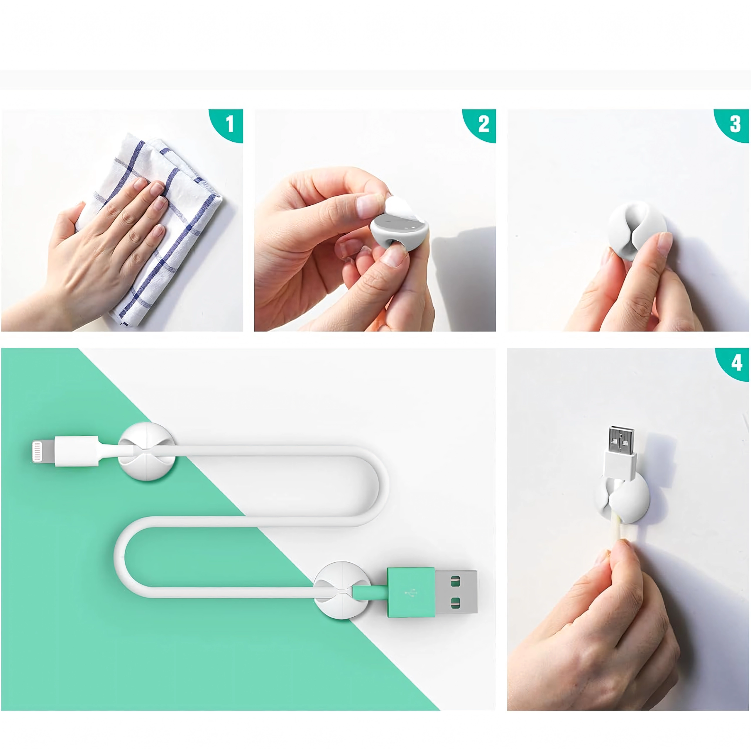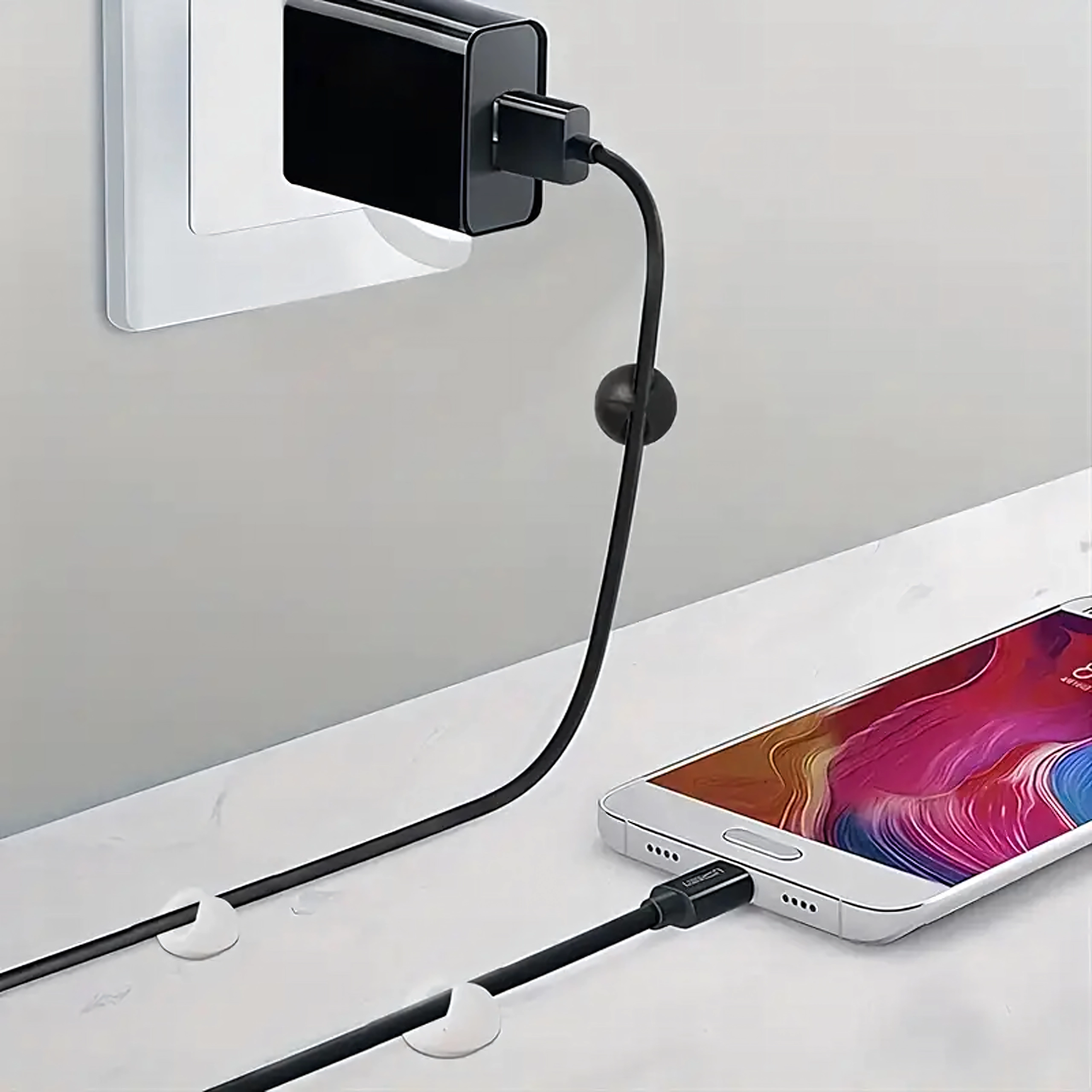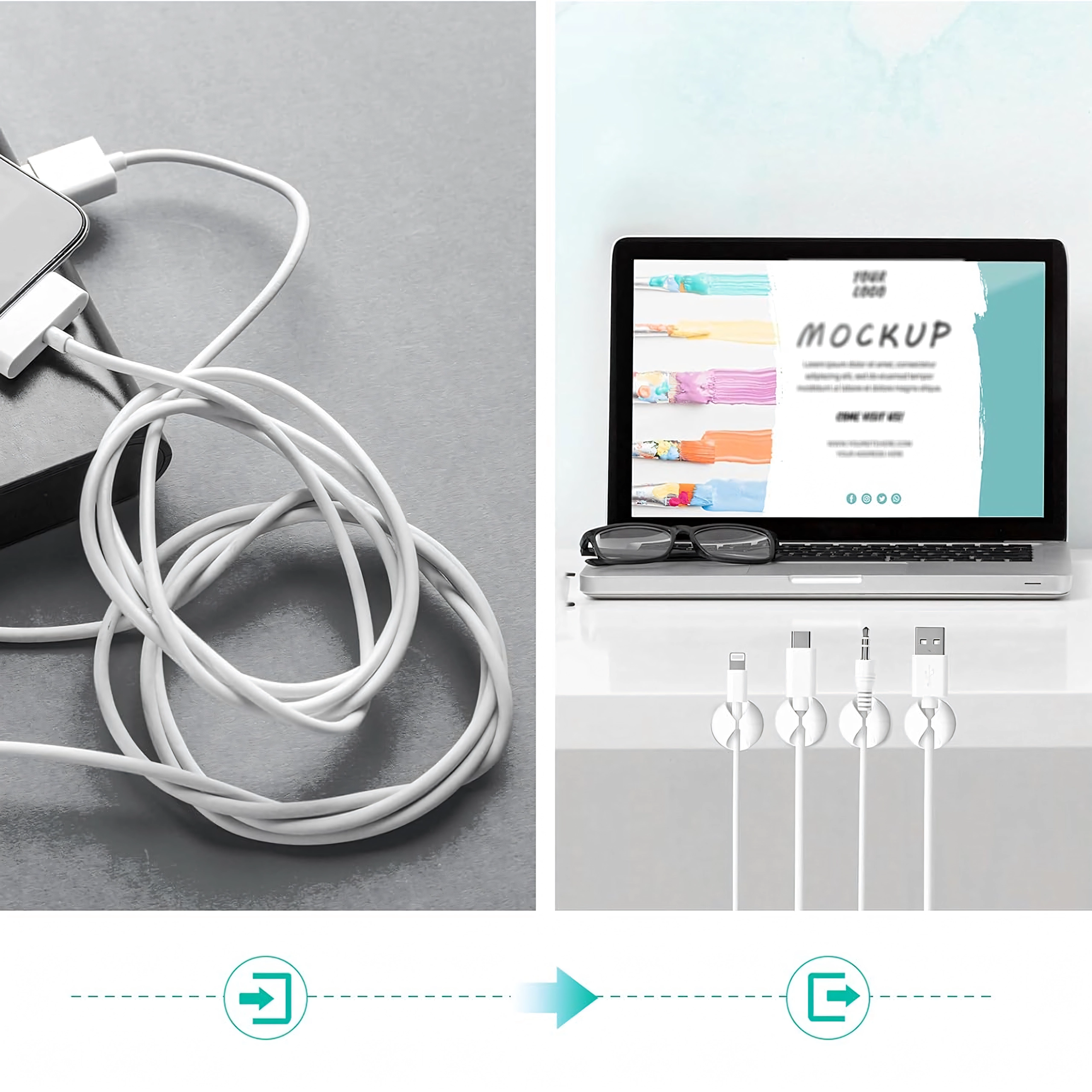 Brug dem til lade- og datakabler, høretelefoner samt små genstande som blyanter eller dekorationer. Den enkle installation uden værktøj sparer tid og holder området rent og overskueligt.
