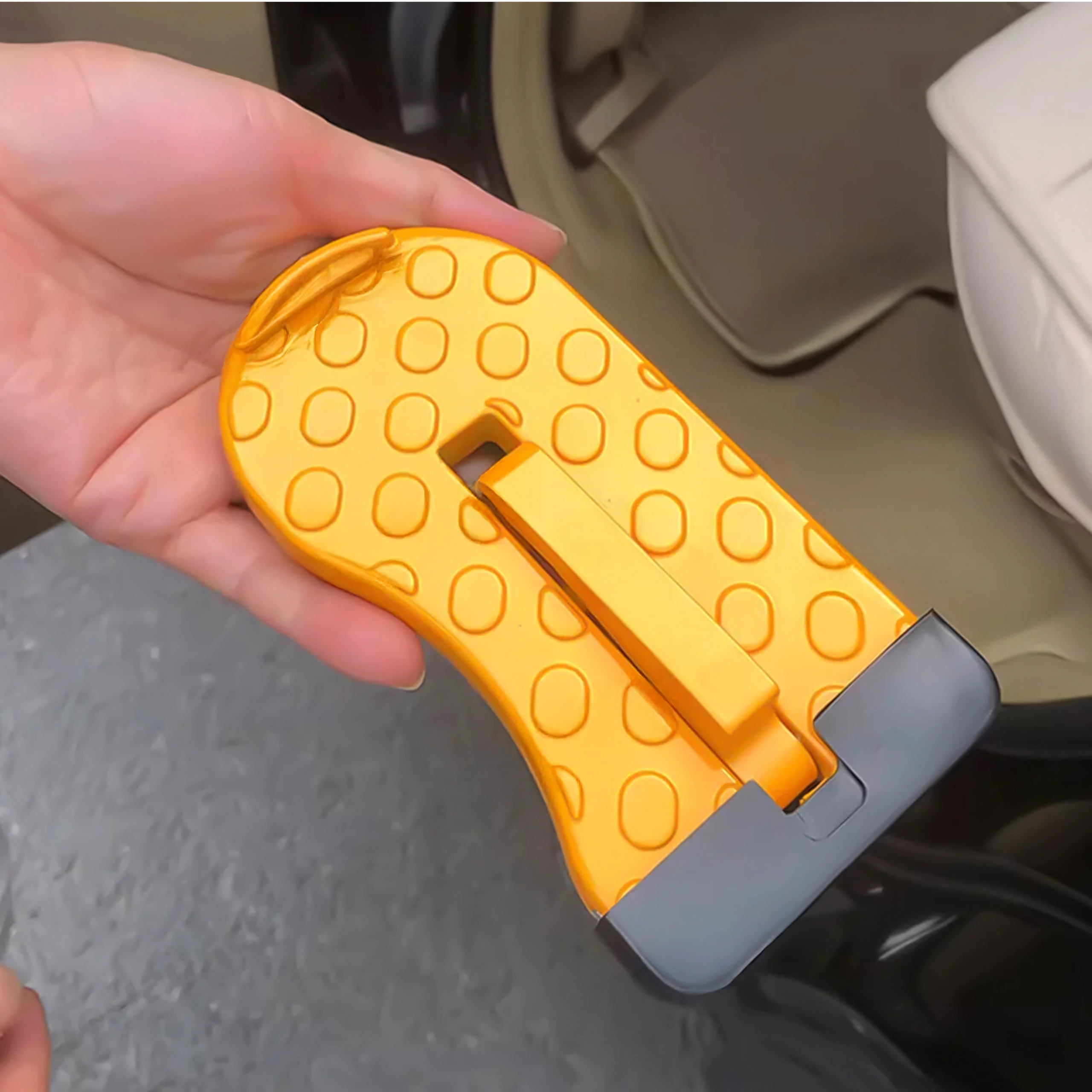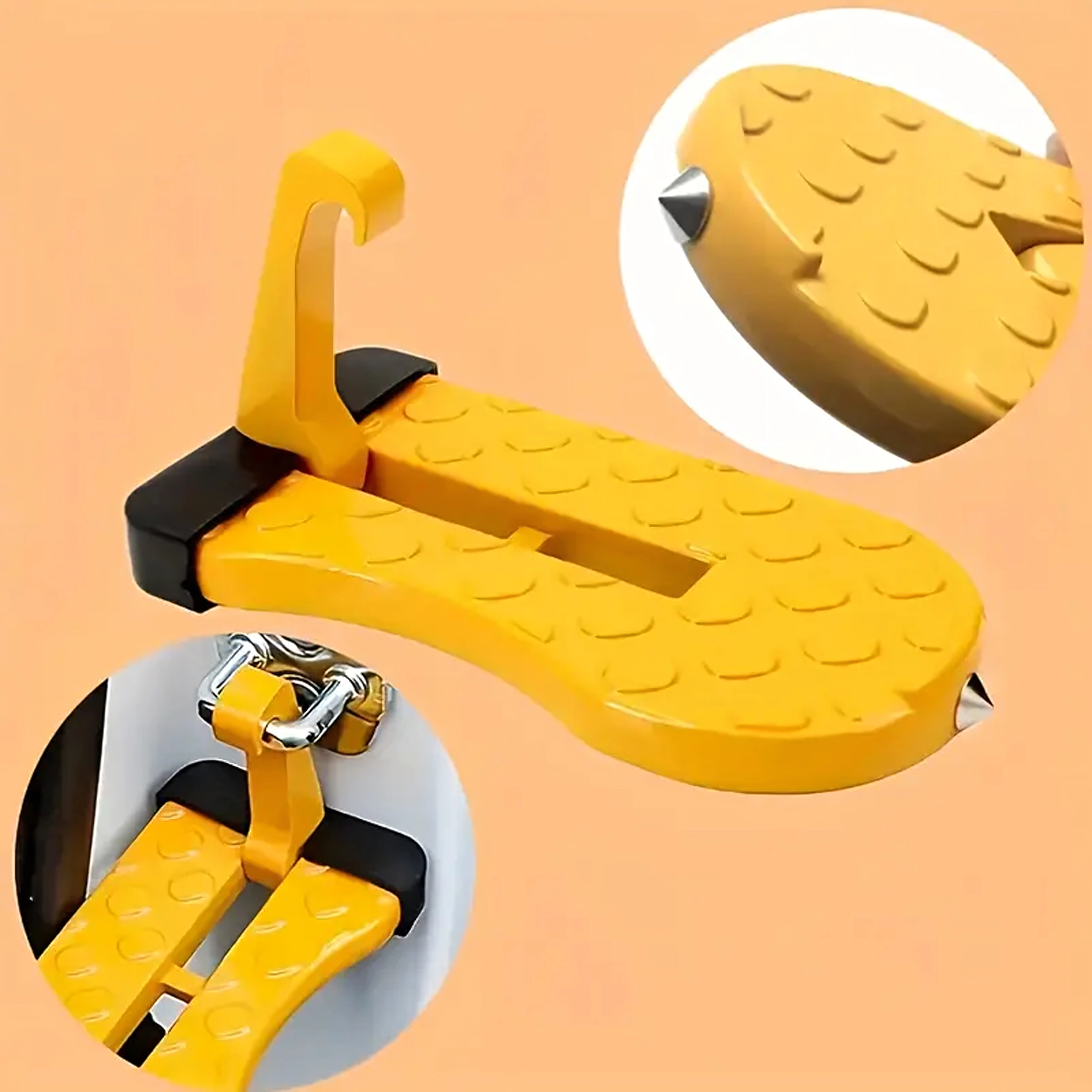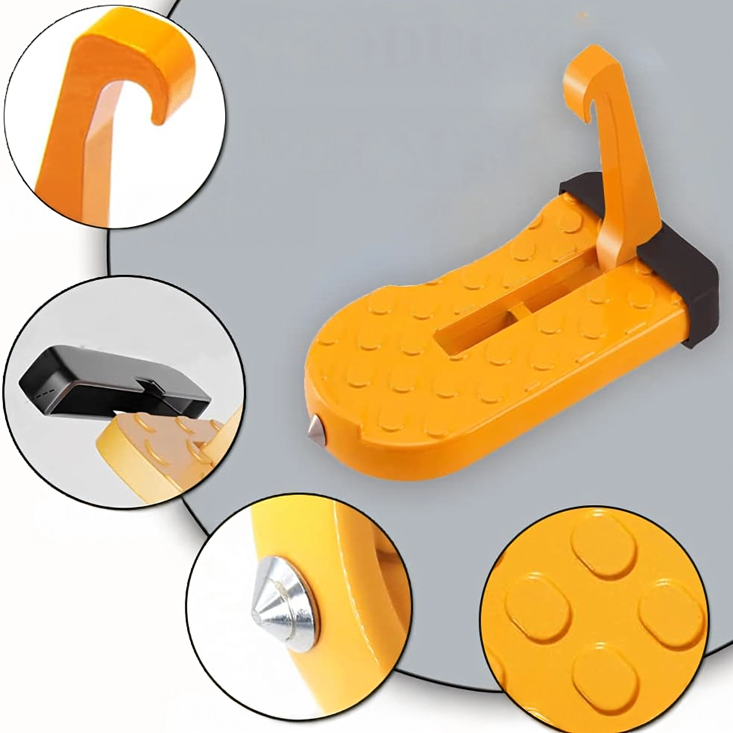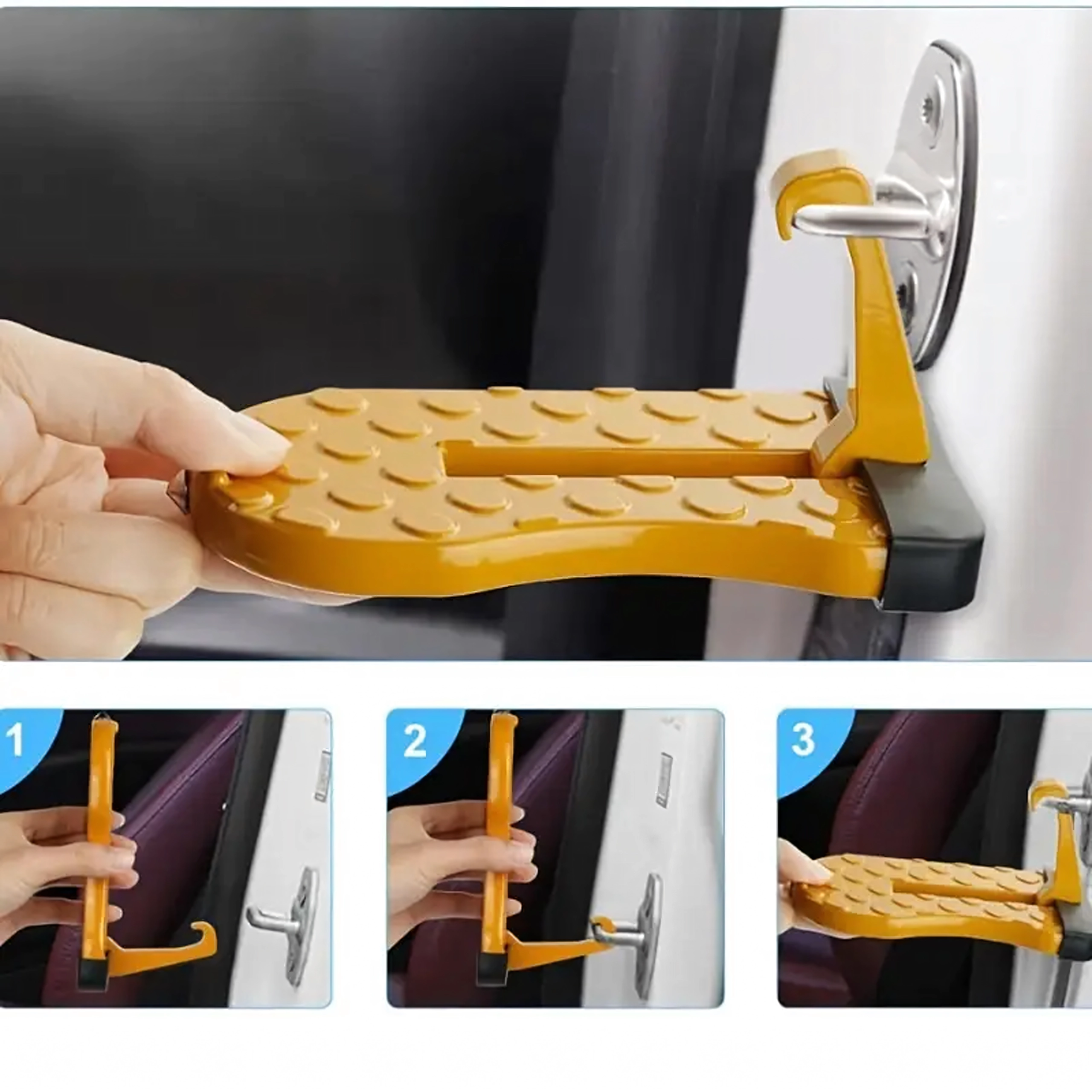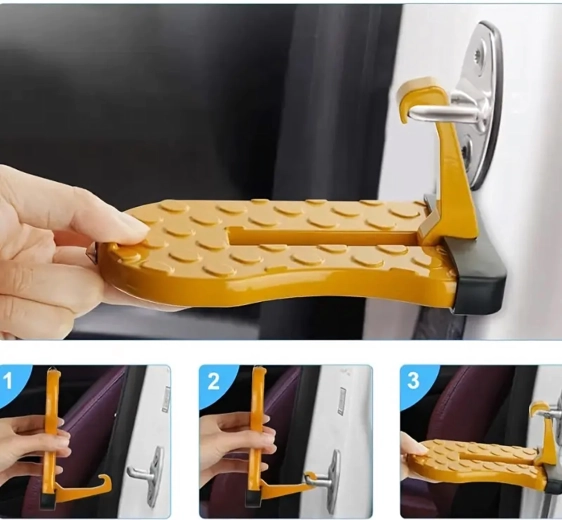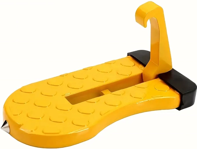 Praktisk og holdbart fodtrin til bildøre, som gør det nemt at komme op på bilens tag – ideelt til tagbokse, holdere og bilvask. Det er let, sammenklappeligt, af aluminium og skridsikkert, og kan desuden fungere som et nødhammer.