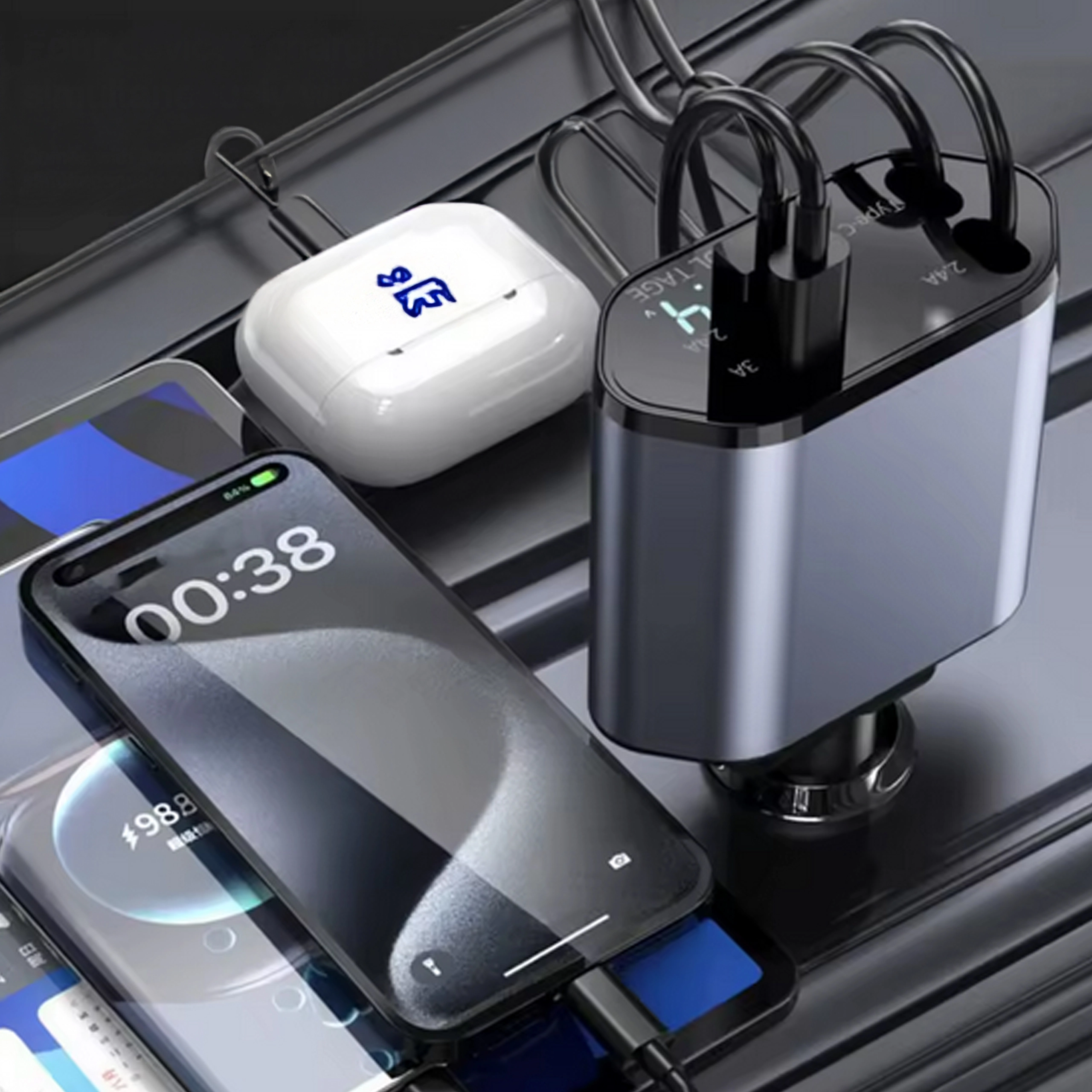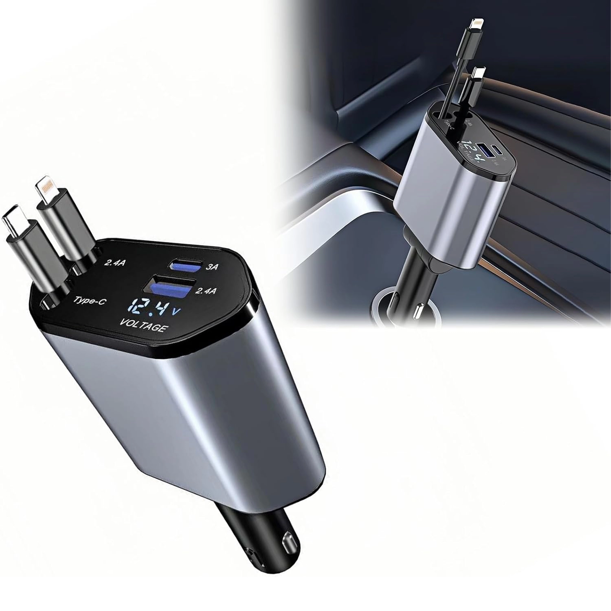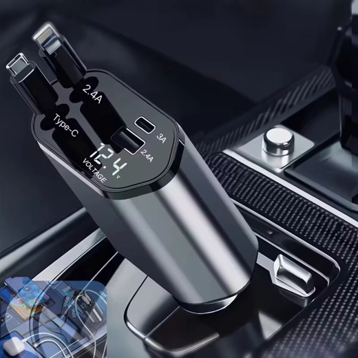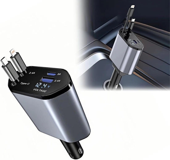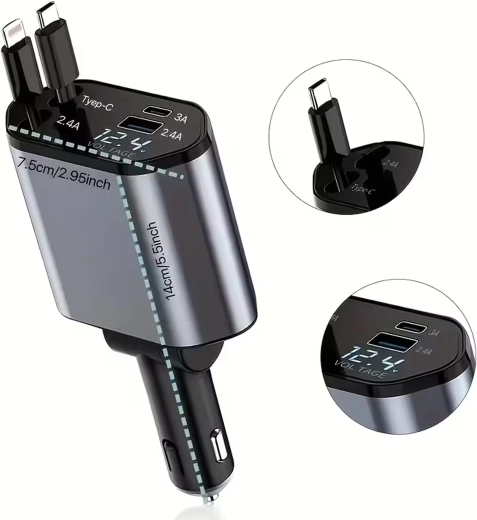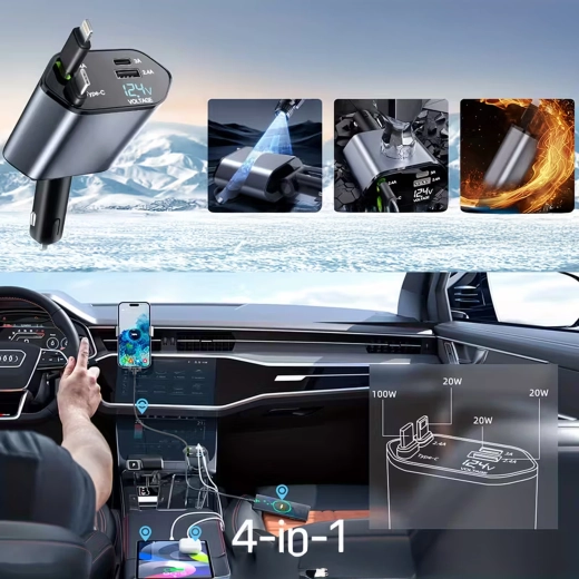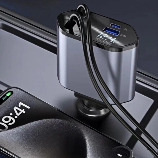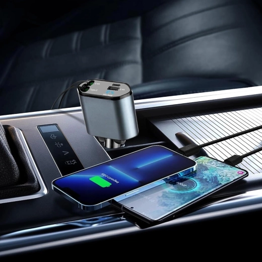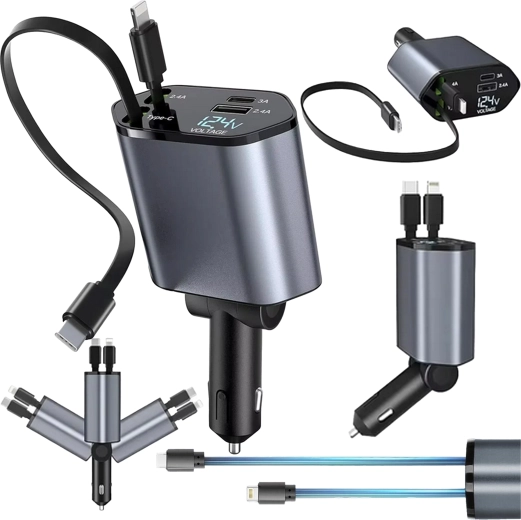 Denne moderne 4‑i‑1 biloplader kombinerer høj ydeevne og praktisk anvendelighed. 100 W hurtigopladning leverer strøm selv til krævende enheder, mens den intelligente chip beskytter mod overspænding, overophedning og kortslutning. Takket være de optrækkelige kabler holder du bilens interiør ryddeligt, og kablerne er altid i den ideelle længde.