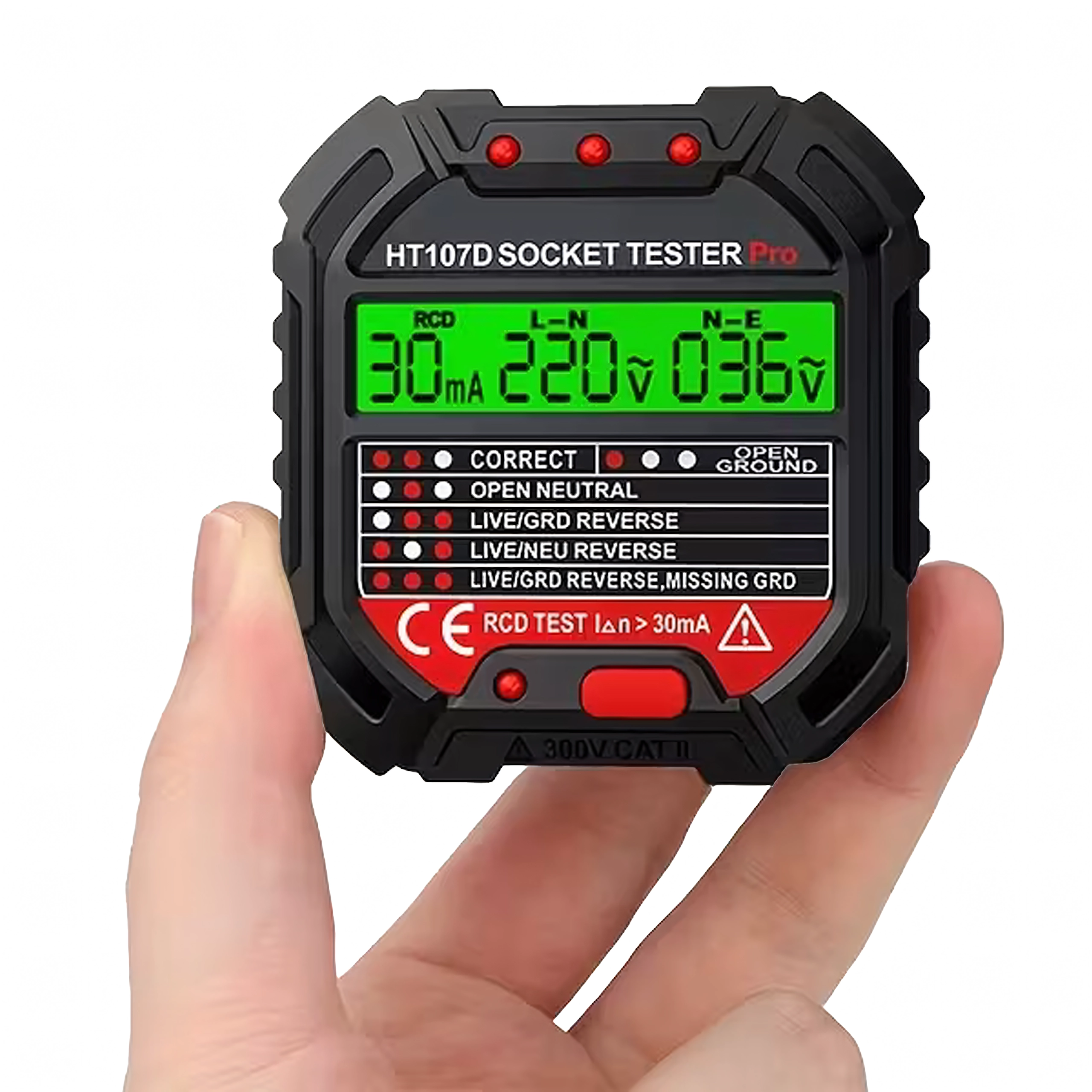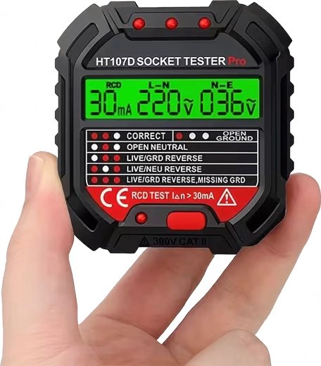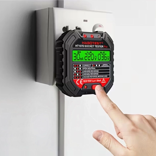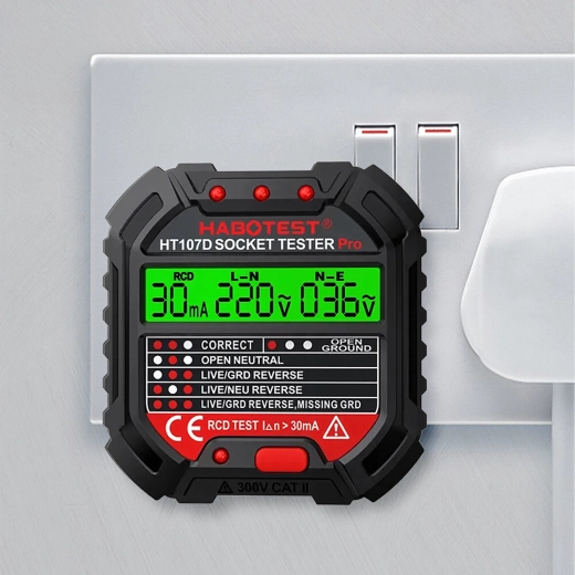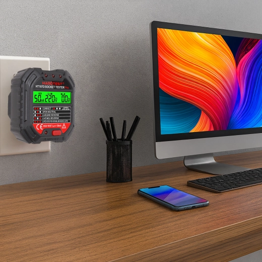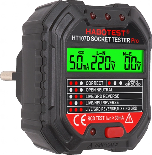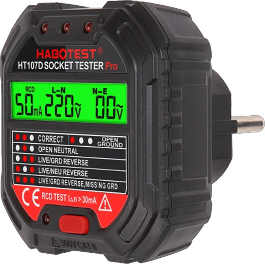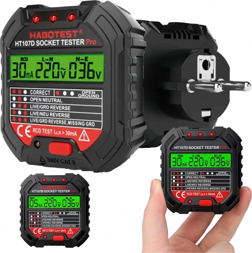 HABOTEST HT107D er et praktisk værktøj til hurtig kontrol af stikkontakter. Takket være den klare LCD-skærm giver den overskuelig information om tilslutning og spænding, så du straks kan se, om stikkontakten er sikker at bruge. Den integrerede RCD-test gør det muligt at verificere fejlstrømsafbryderens funktion og øge beskyttelsen mod elektrisk stød.