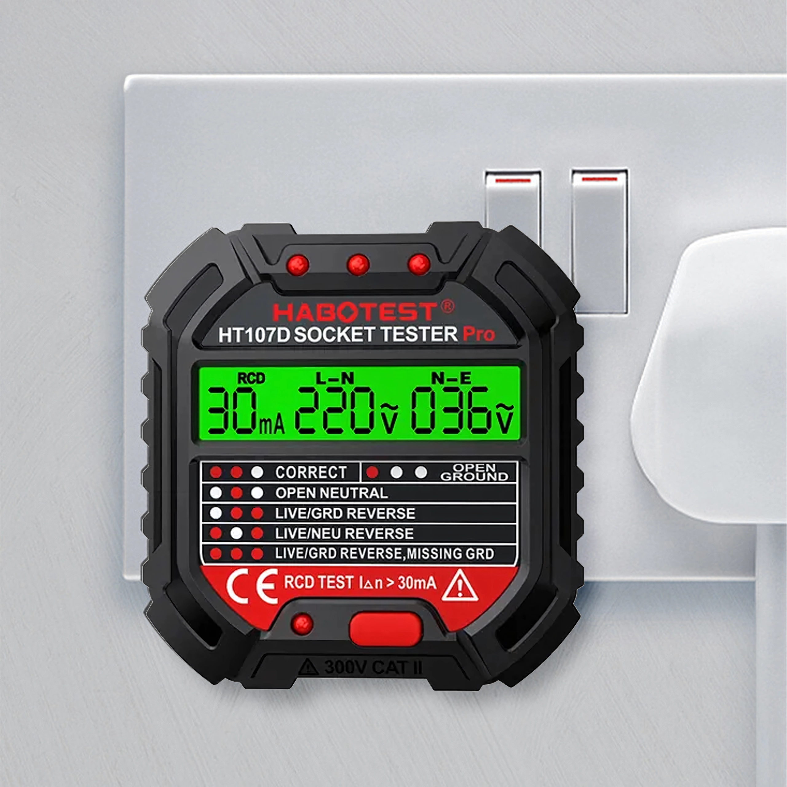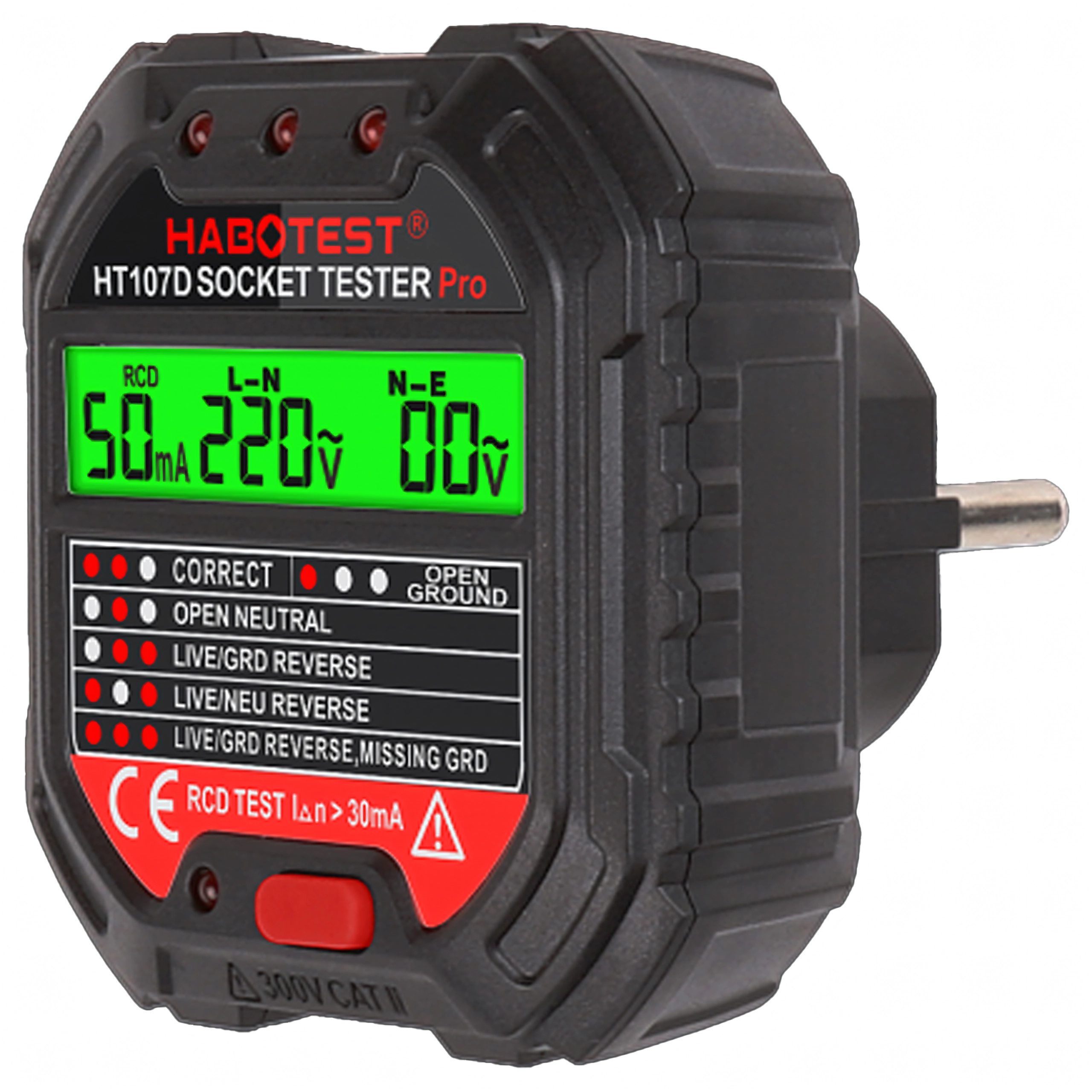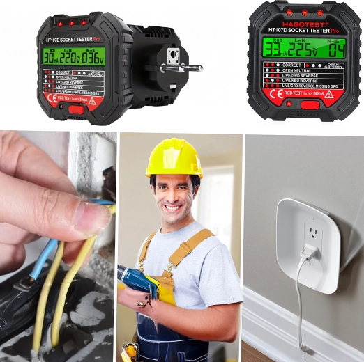 Stikkontakttester med spænding, LCD og RCD-test HABOTEST HT107D