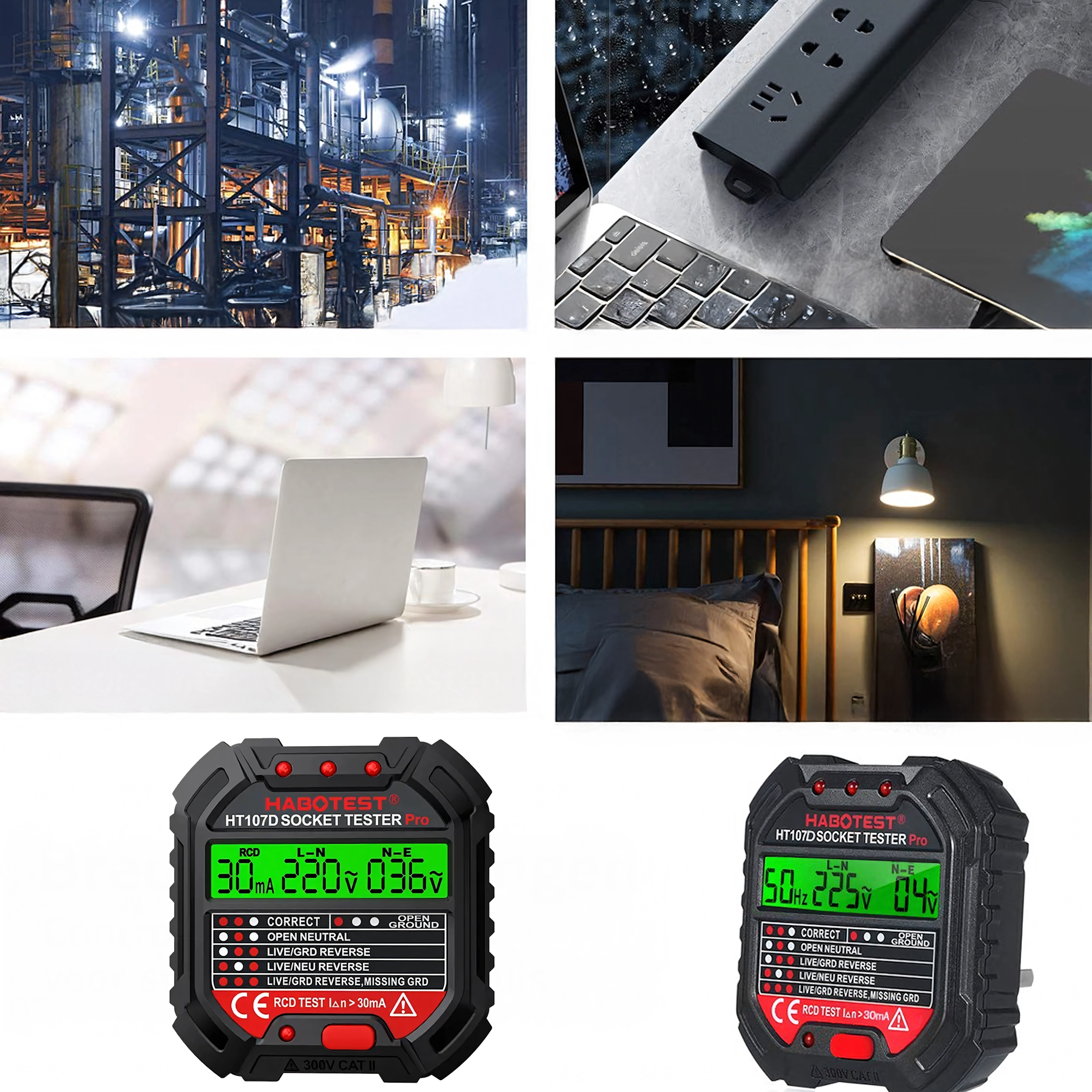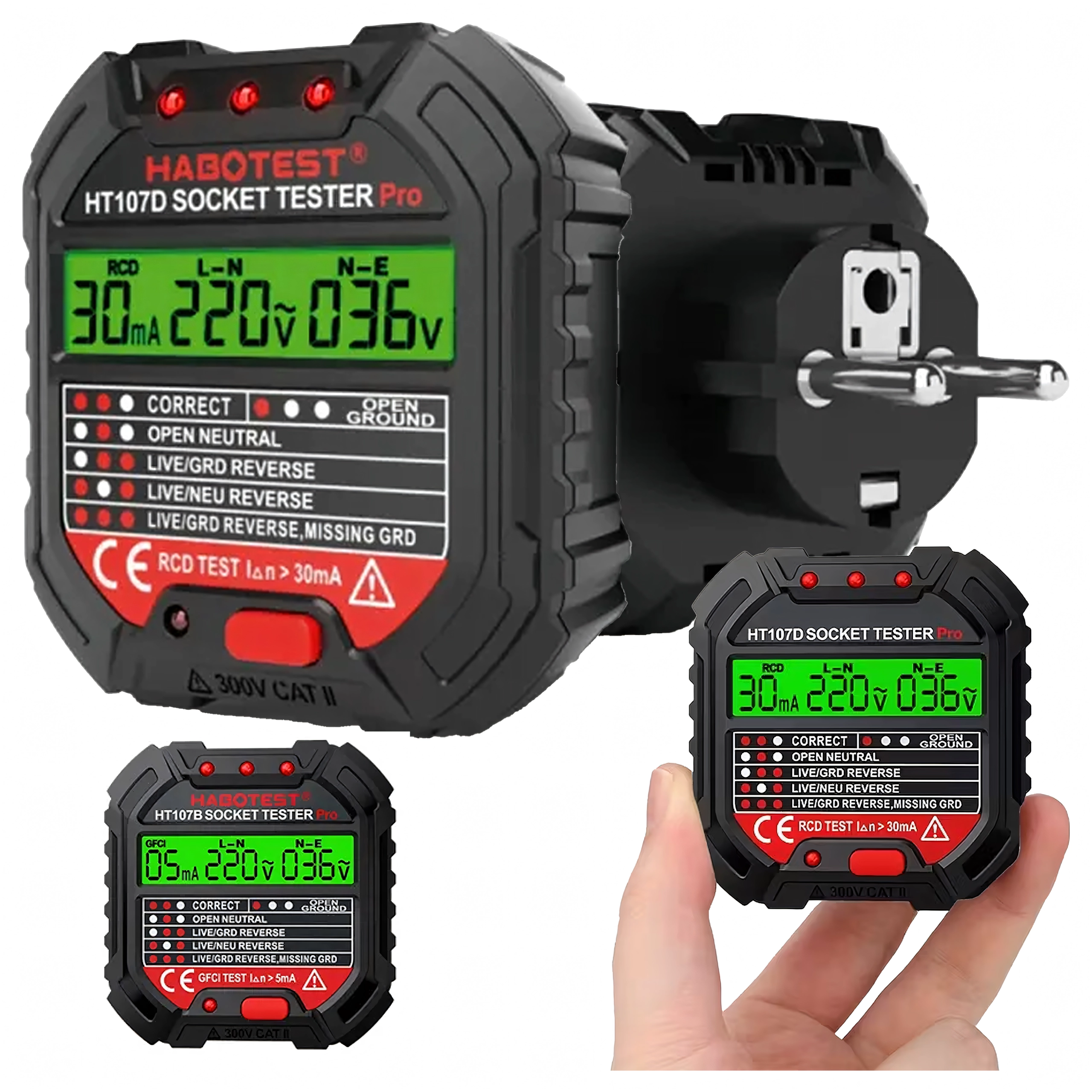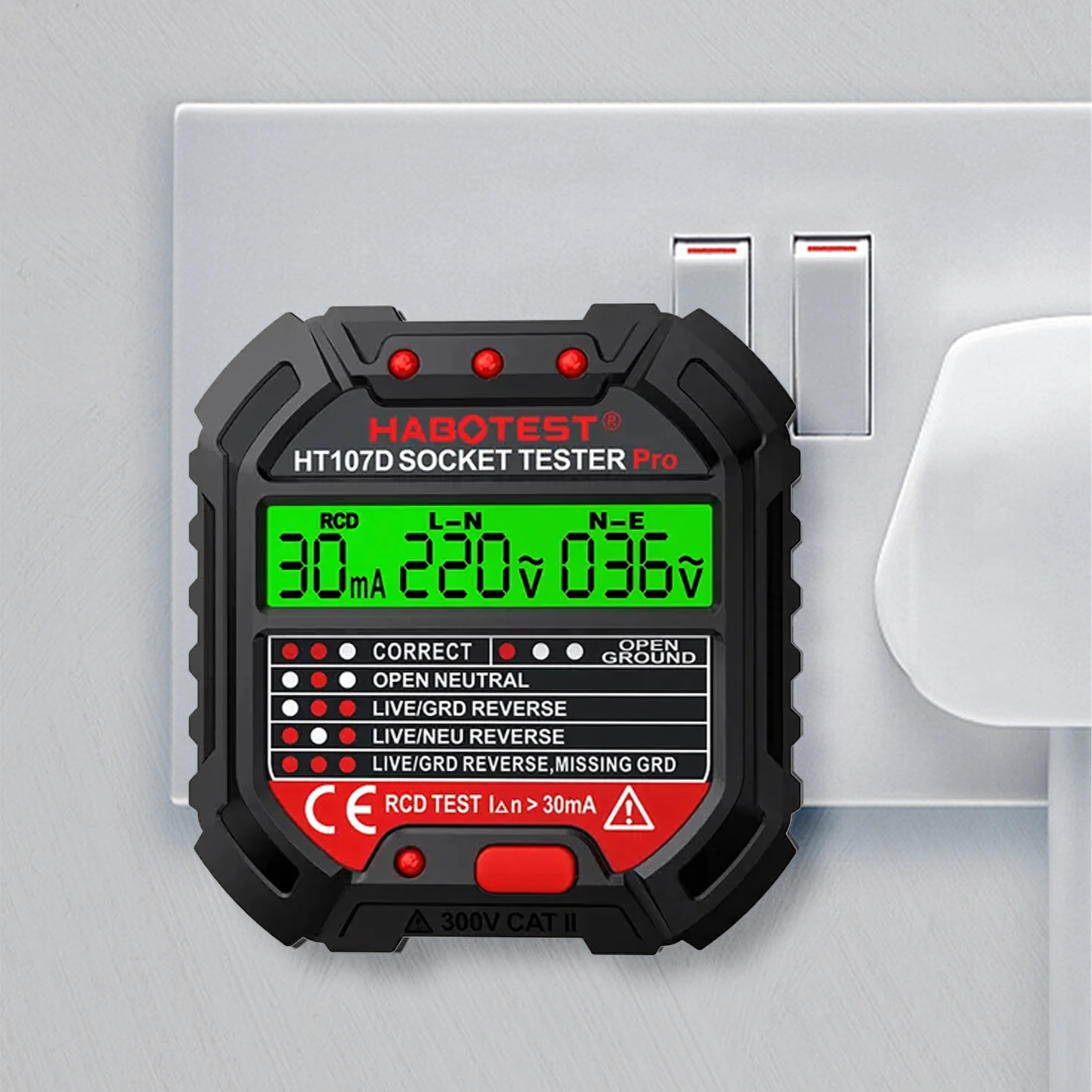 Stikkontakttester med spænding, LCD og RCD-test HABOTEST HT107D