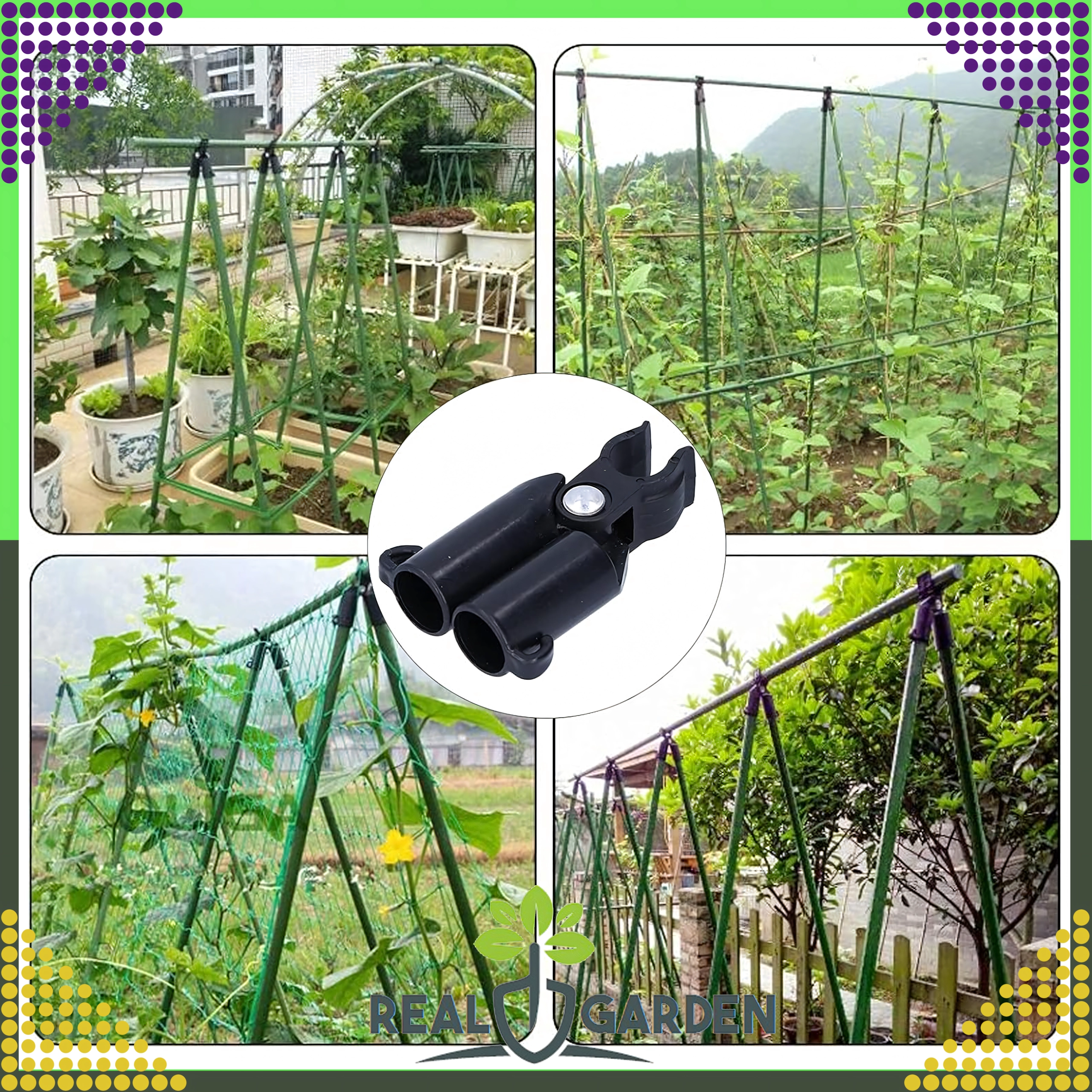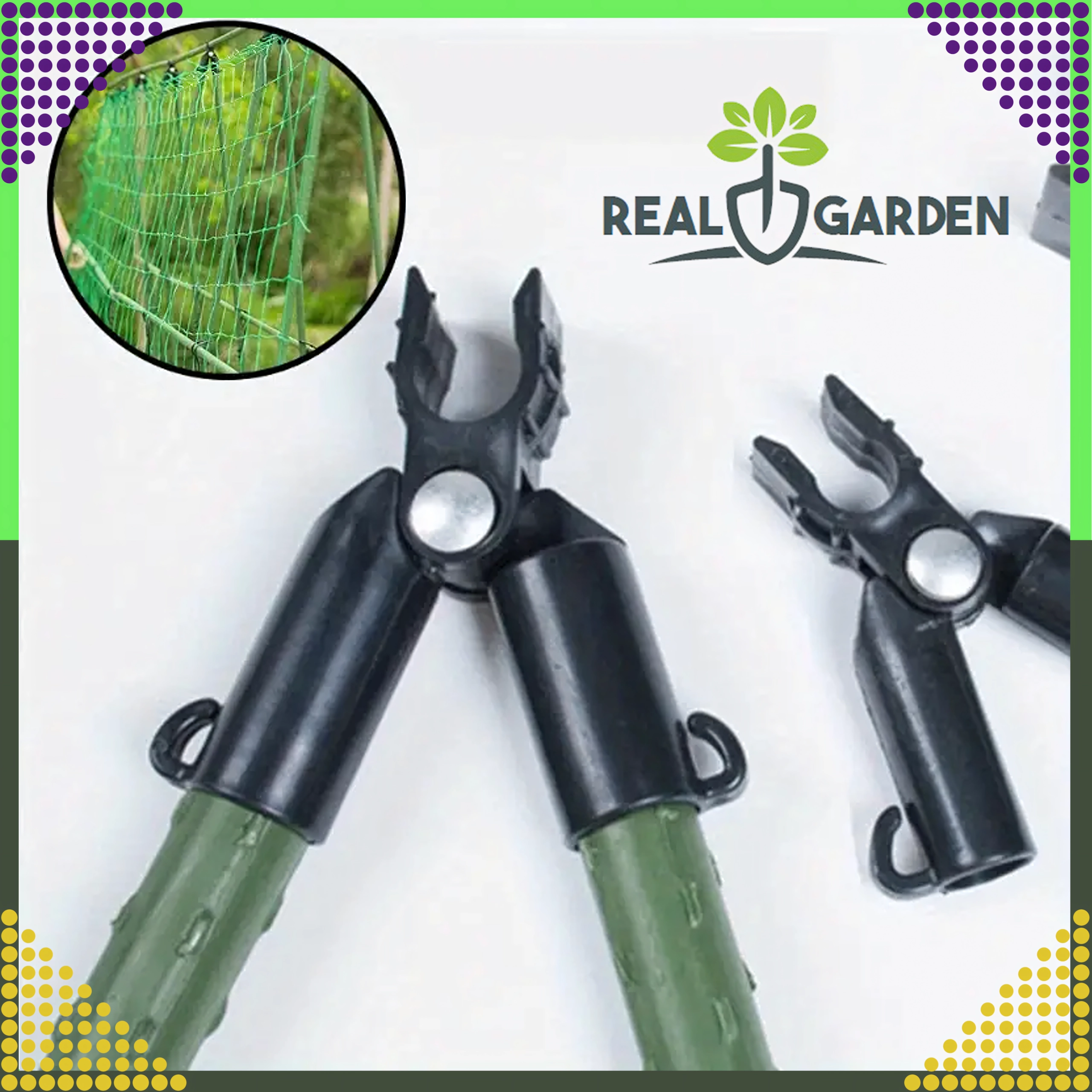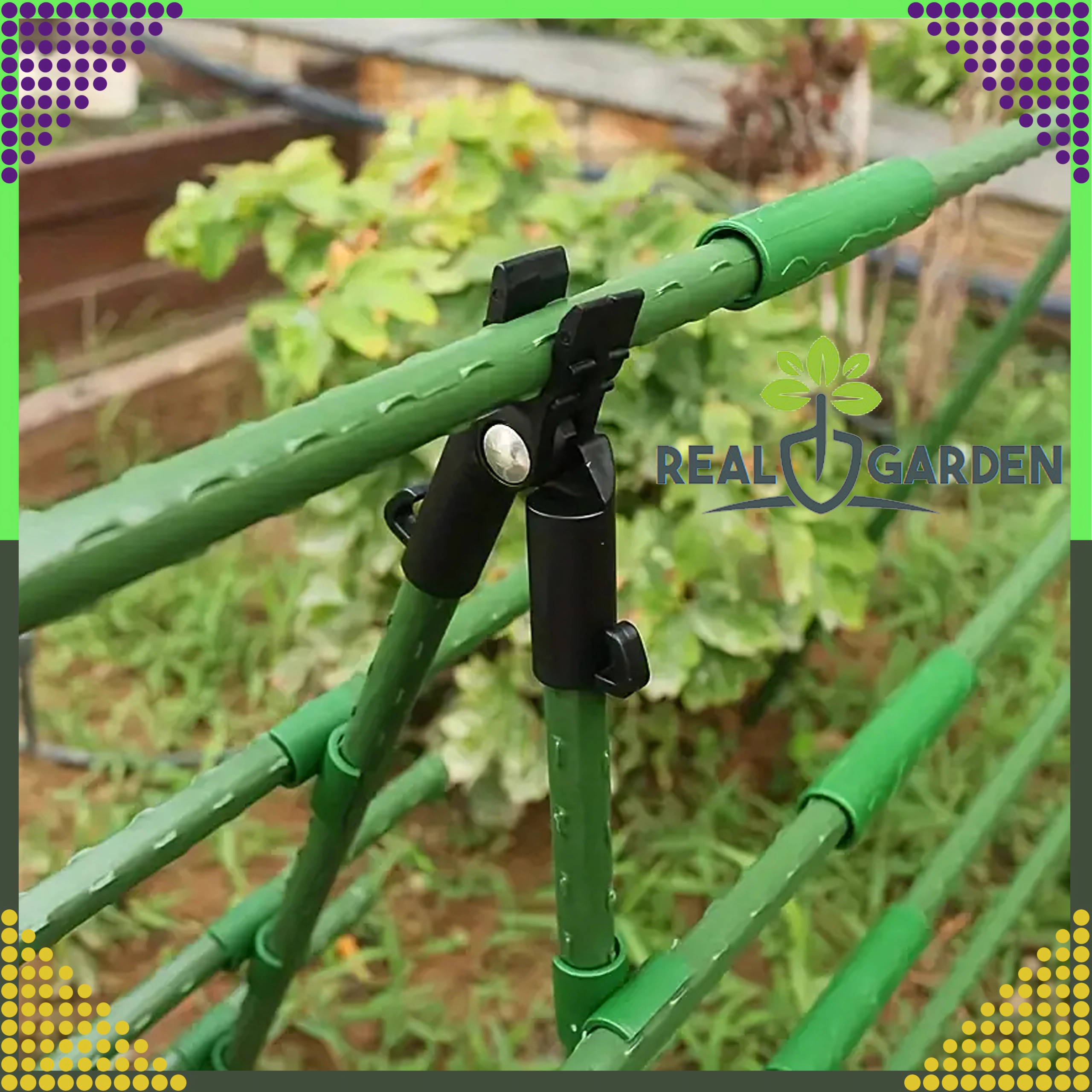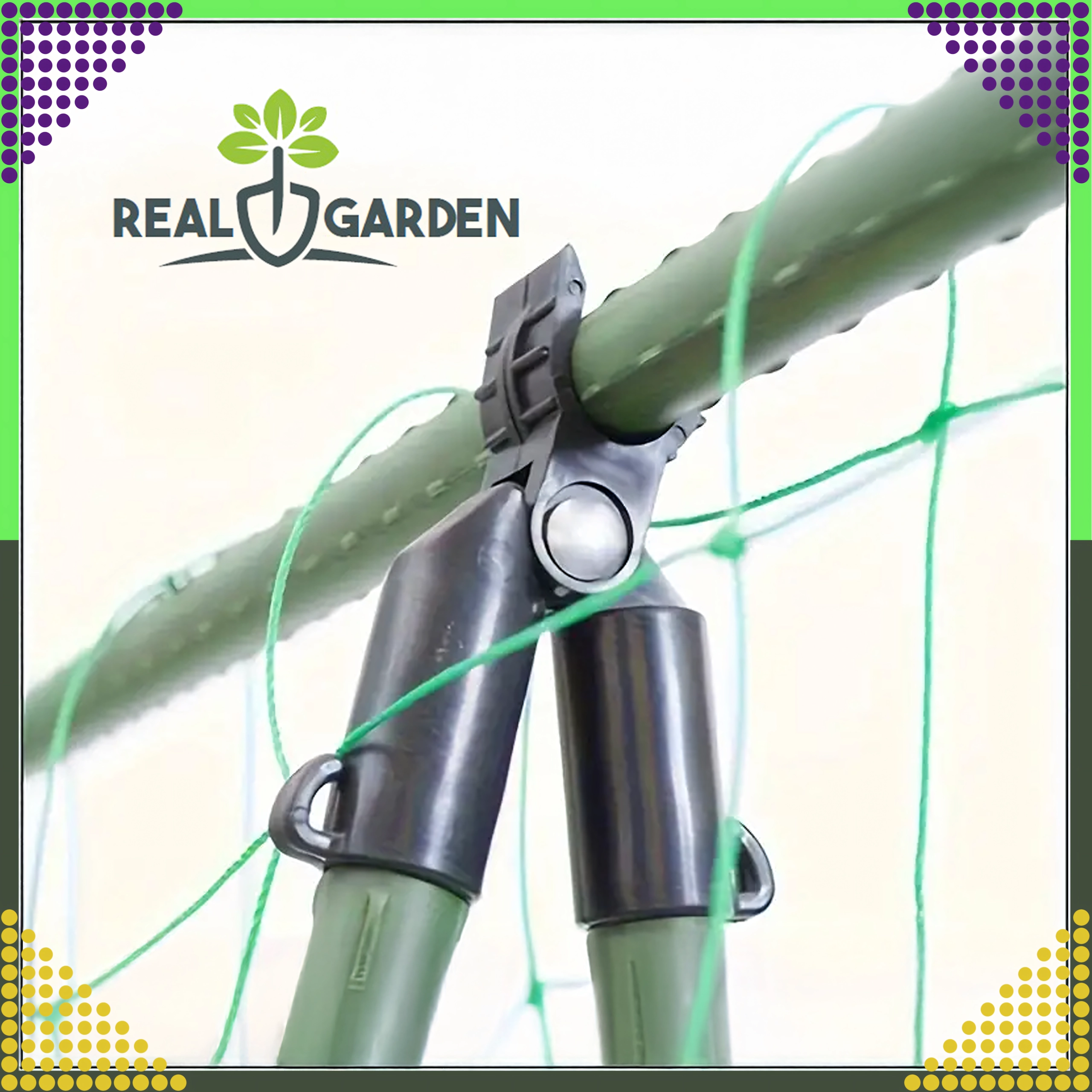 Top-leddet T-samling Real Garden gør det nemt at bygge rammer, A-konstruktioner og støtter til tomater, bønner eller agurker. Takket være kombinationen af solid plast og metaldele sikrer den en stabil forbindelse af havestænger med en diameter på 9 mm og klarer også langvarig udendørs brug.