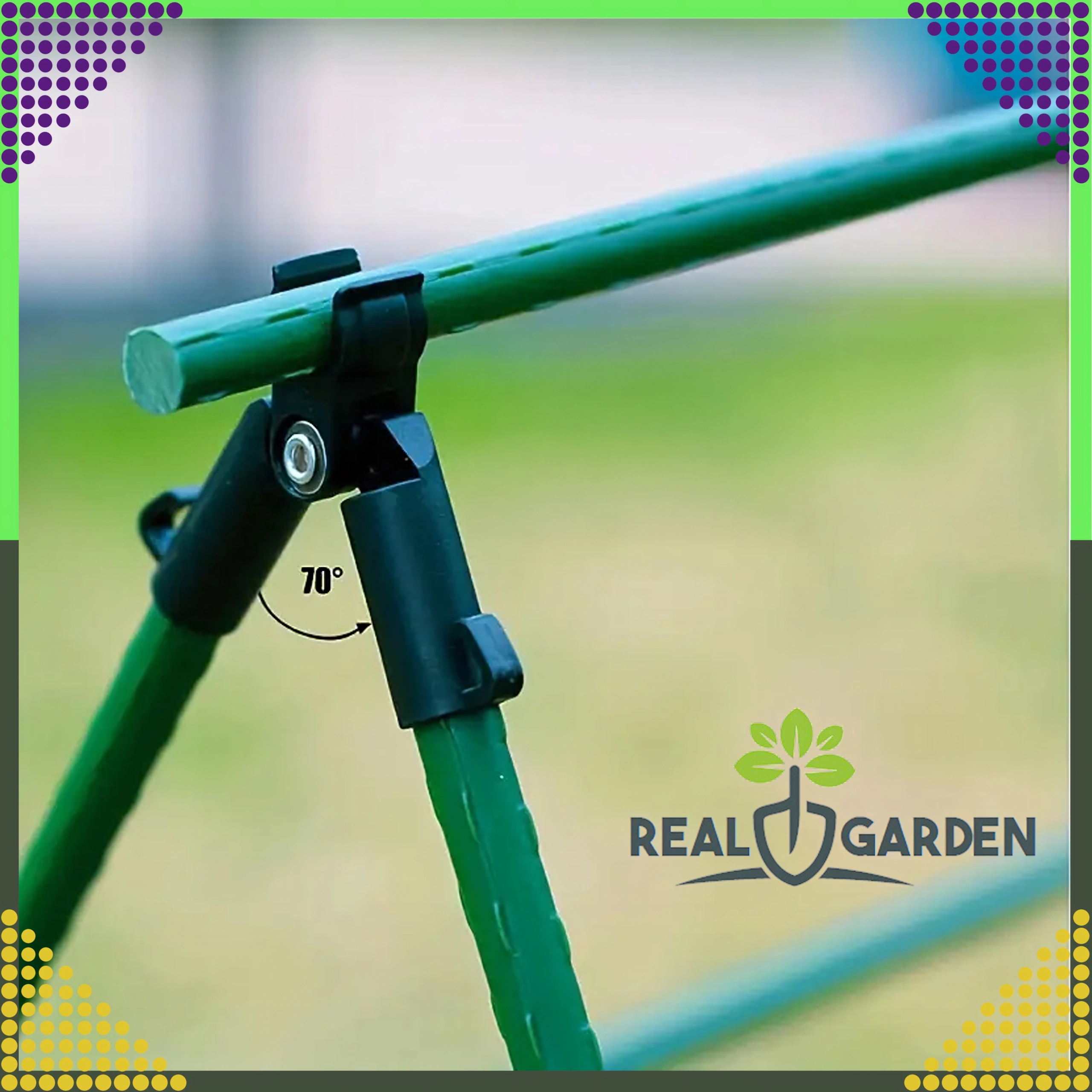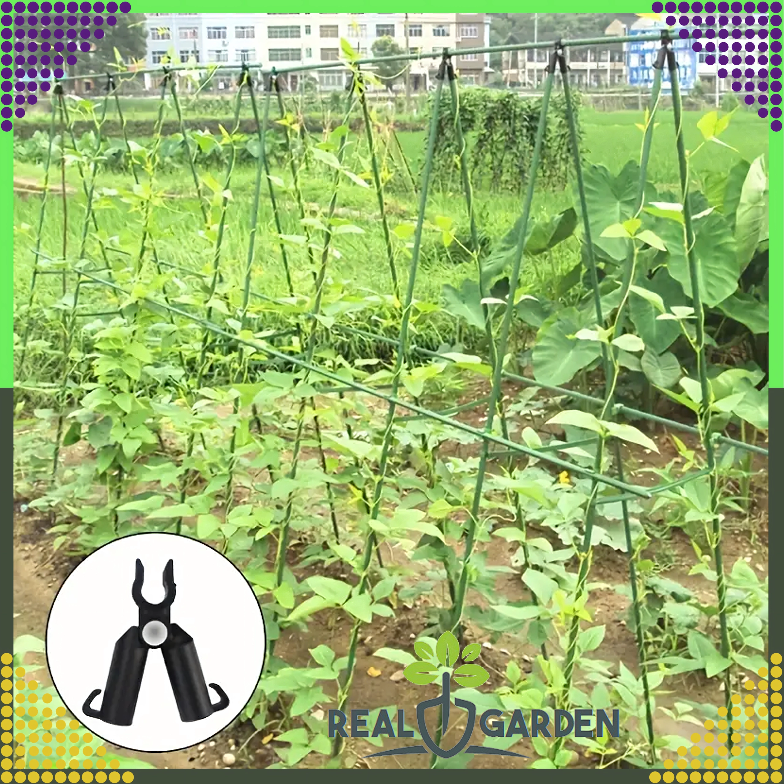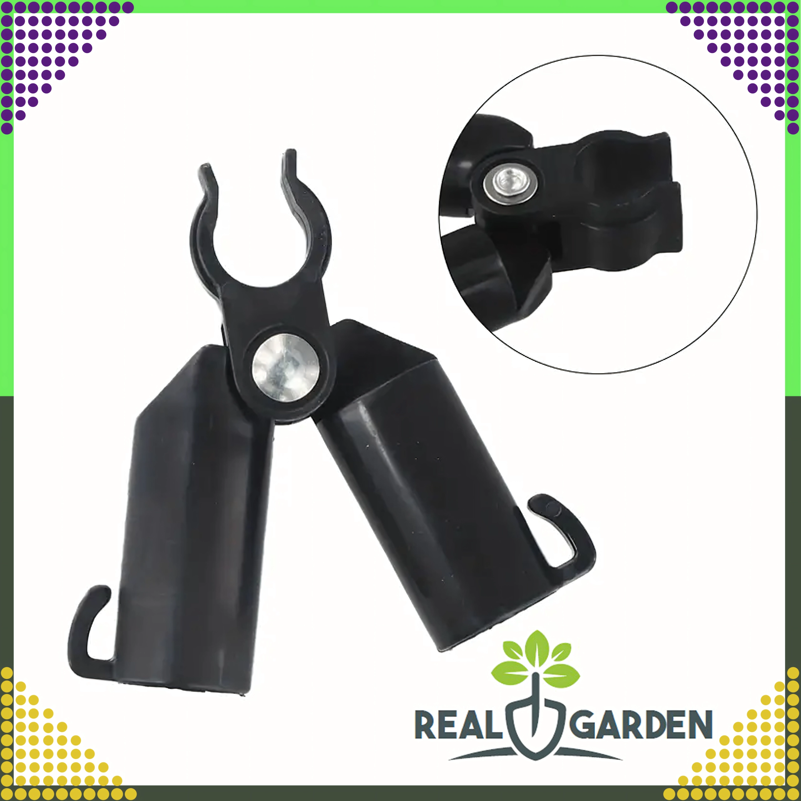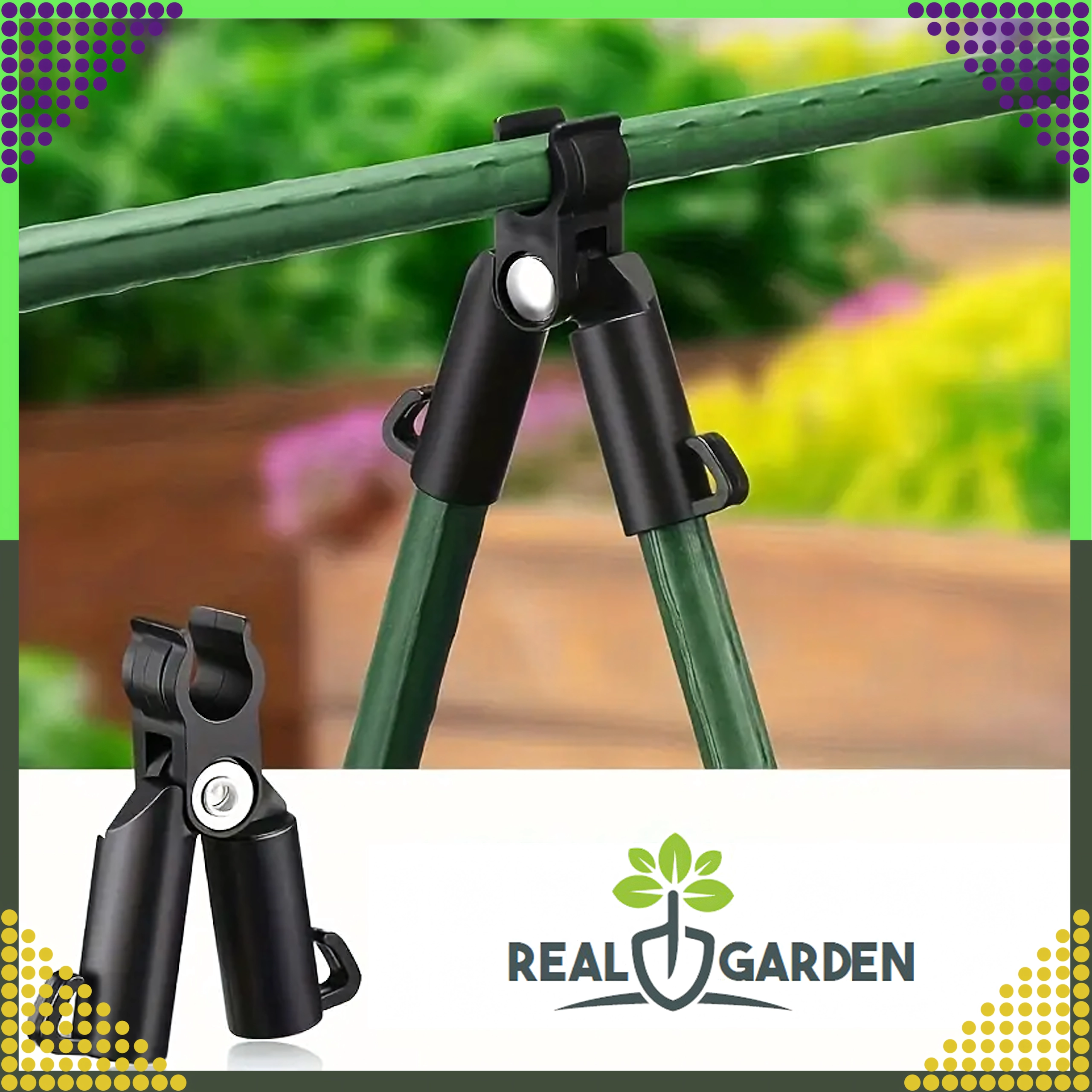 Top-leddet T-samling Real Garden gør det nemt at bygge rammer, A-konstruktioner og støtter til tomater, bønner eller agurker. Takket være kombinationen af solid plast og metaldele sikrer den en stabil forbindelse af havestænger med en diameter på 9 mm og klarer også langvarig udendørs brug.