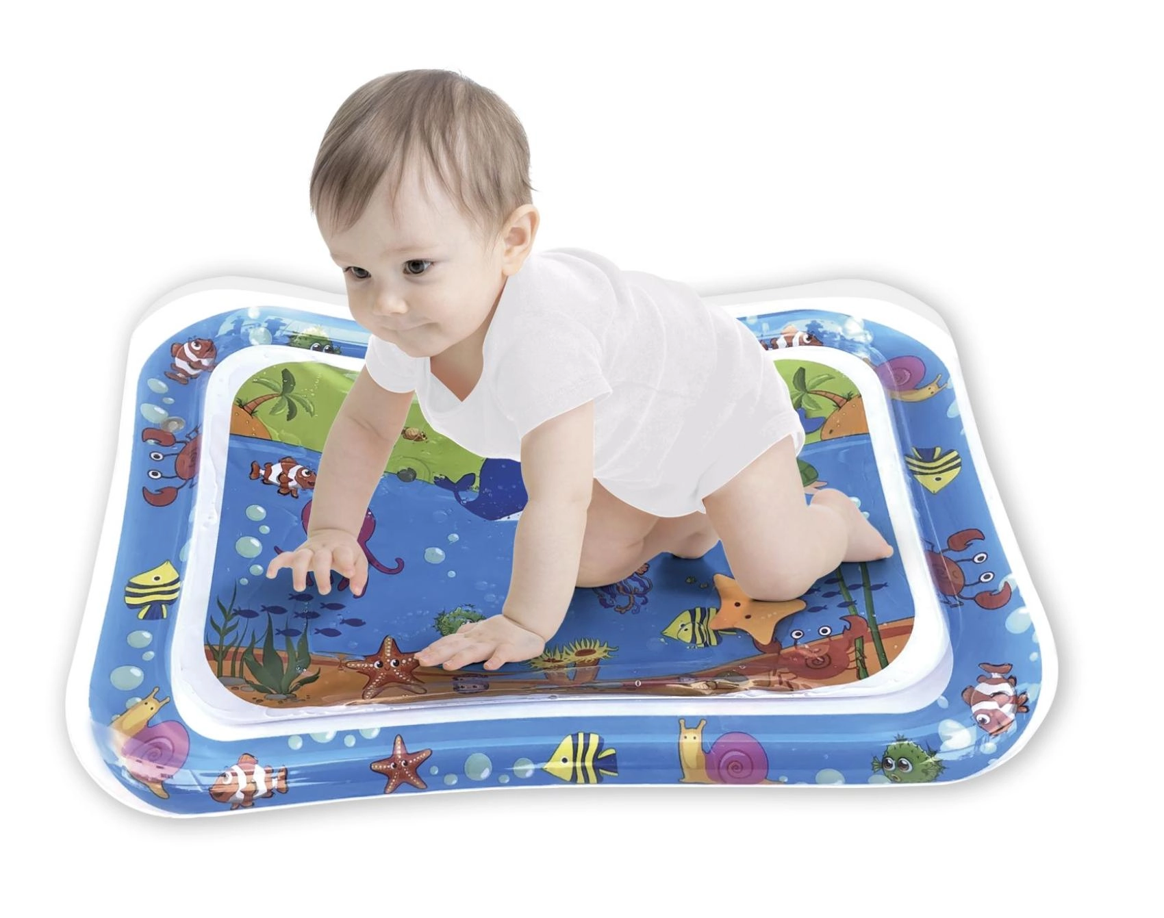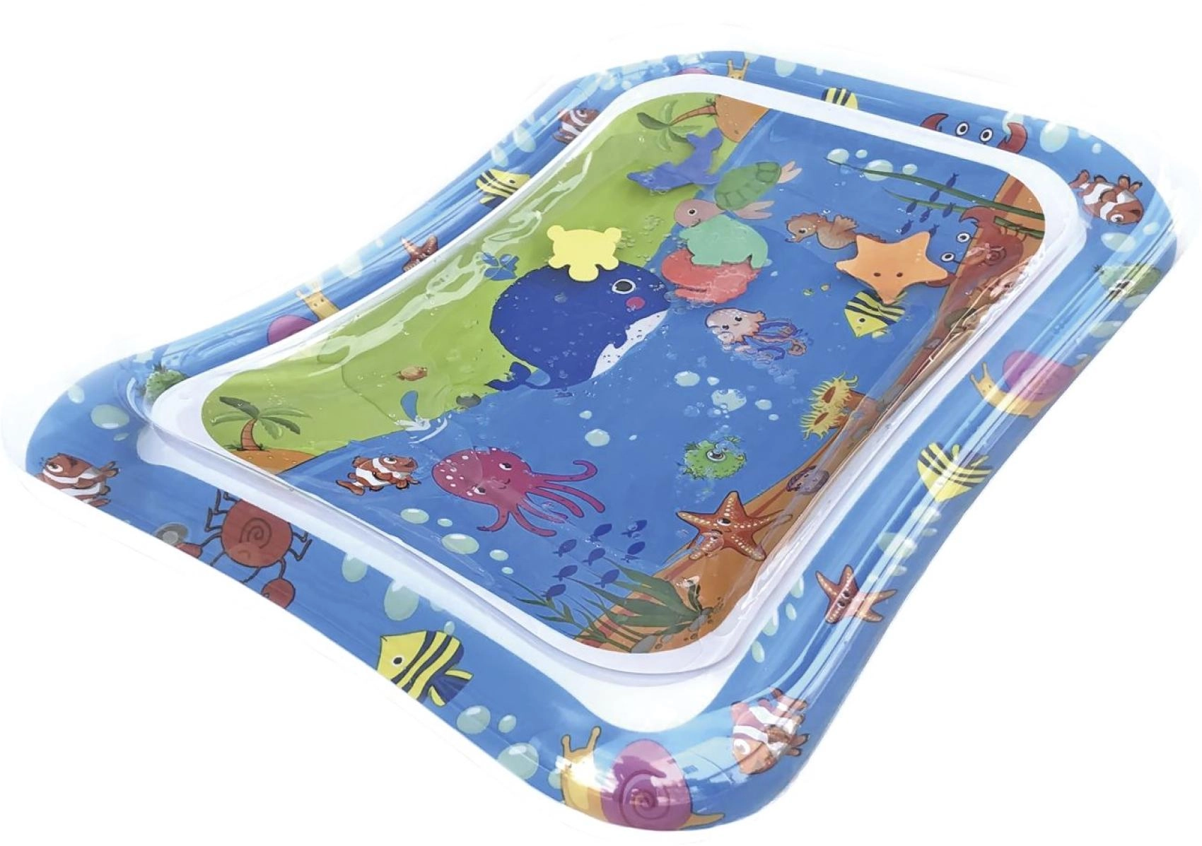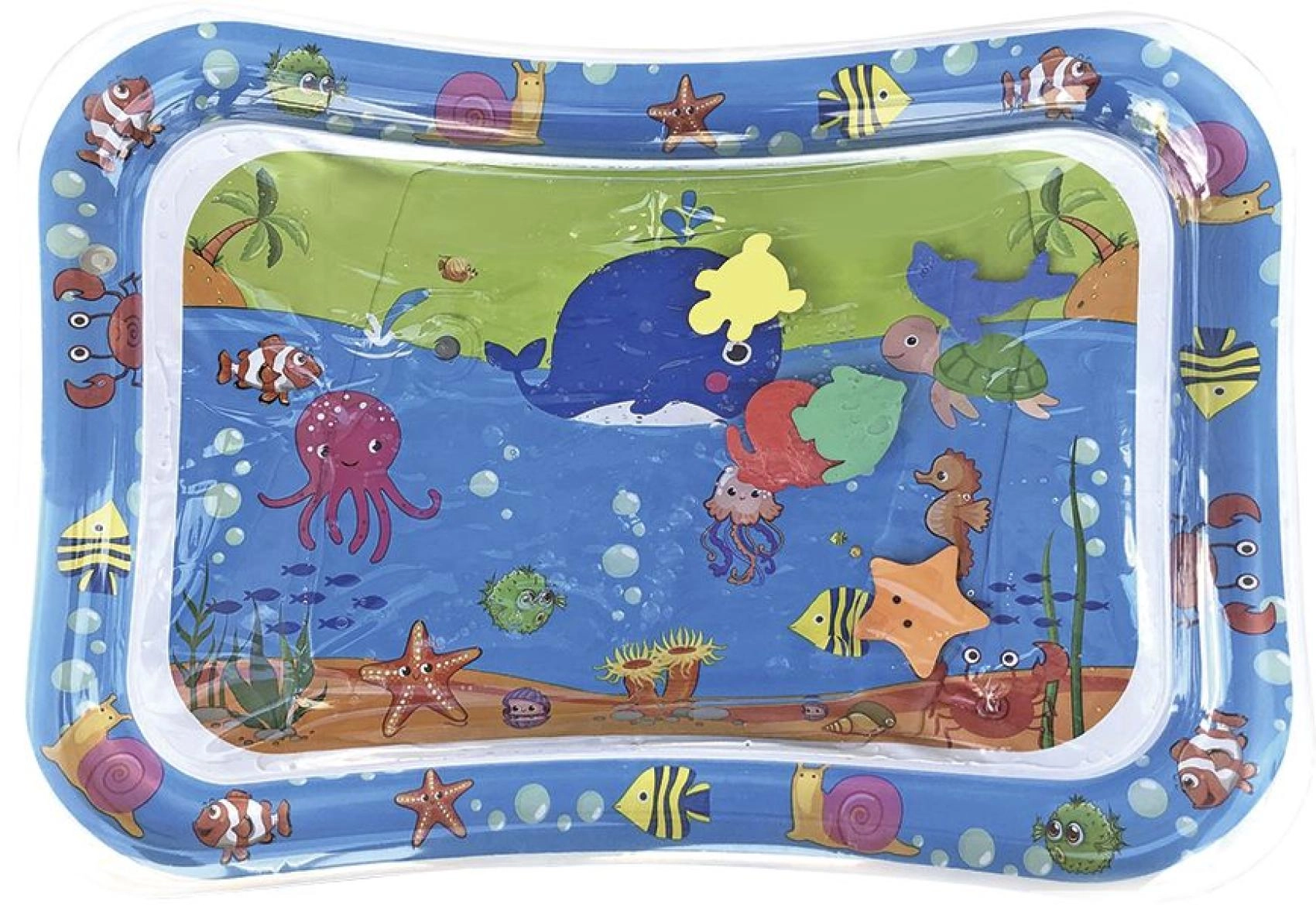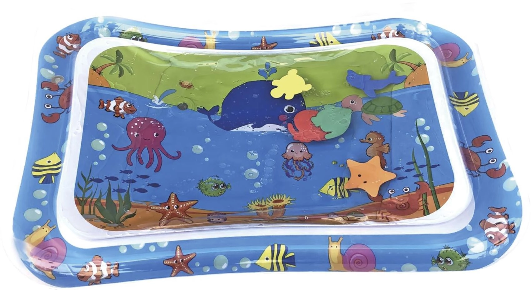 Denne oppustelige vandmåtte med oceanmotiv giver børn et sikkert og sjovt miljø til mavelege og de første løft af hovedet. Vandkammeret med flydende figurer skaber en bevægelseseffekt, der naturligt stimulerer syn, berøring og hånd-øje-koordination.
