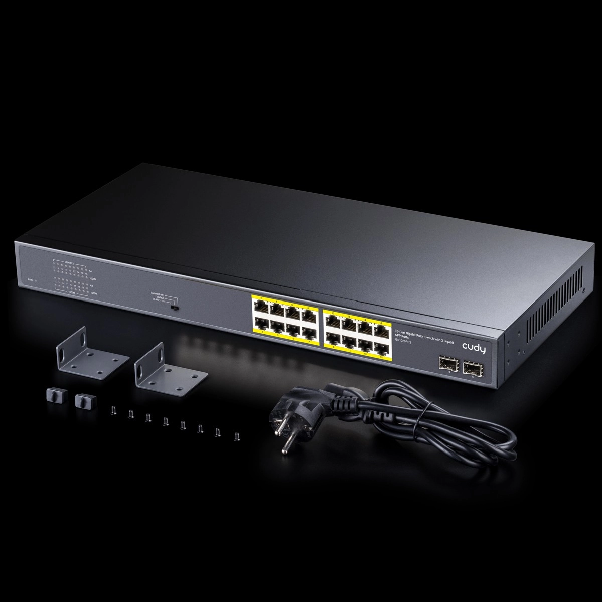 Kraftig 16‑ports gigabit-switch med PoE+‑understøttelse, samlet PoE‑budget på 200 W og to gigabit SFP-porte. Tilbyder CCTV‑tilstand op til 250 m for både strøm og data, VLAN‑portisolering for højere sikkerhed, tydelige LED‑indikatorer og et robust 19" metalchassis med intern strømforsyning.