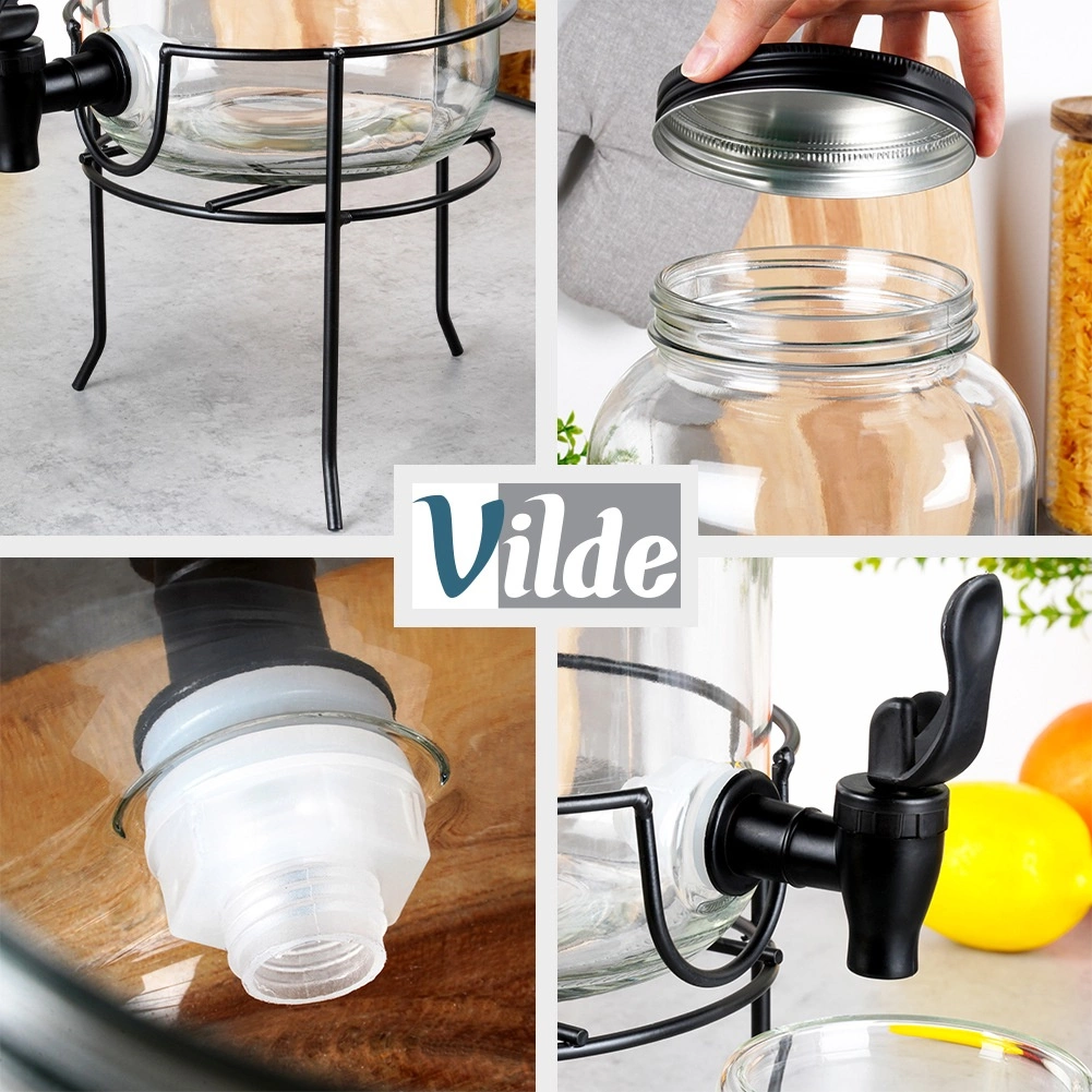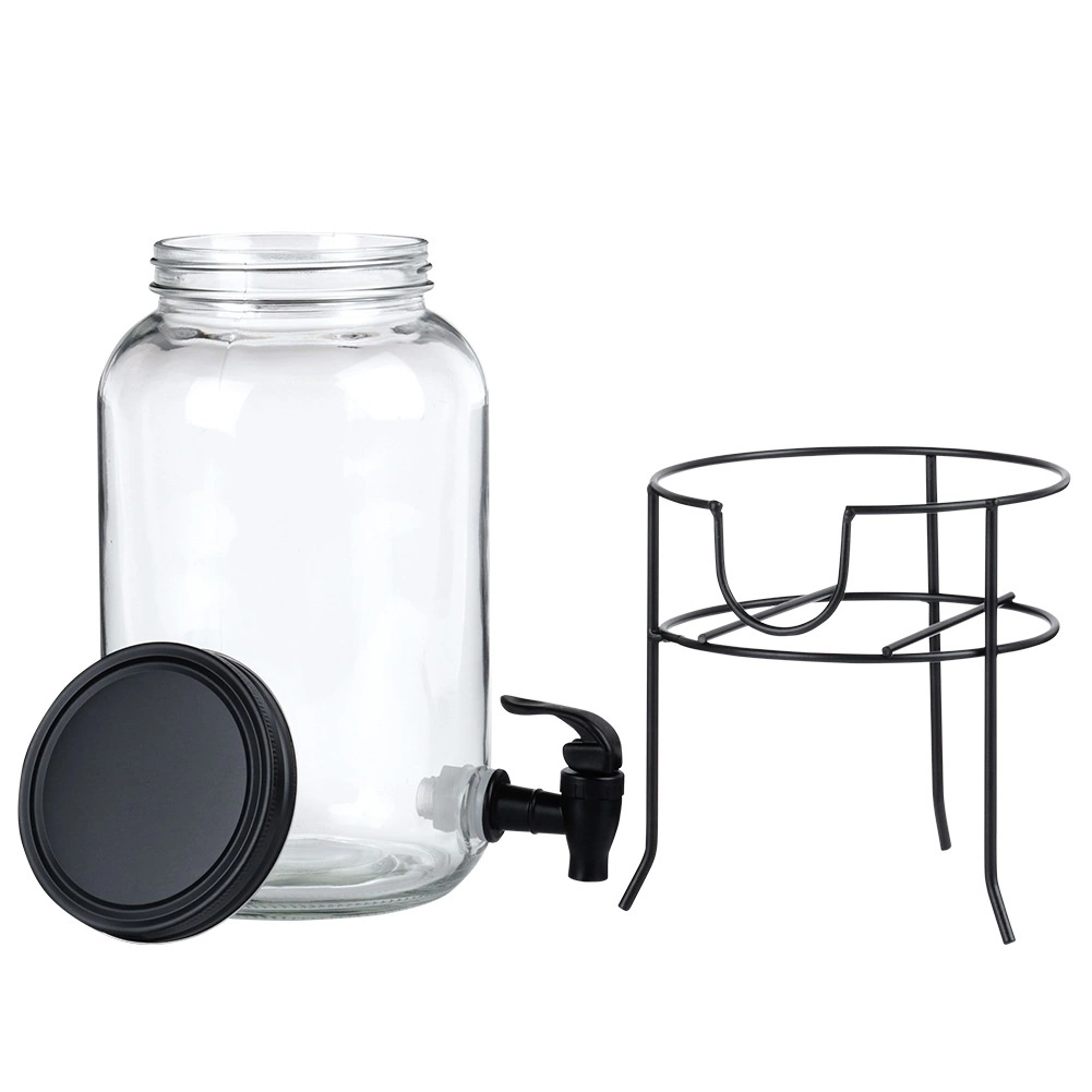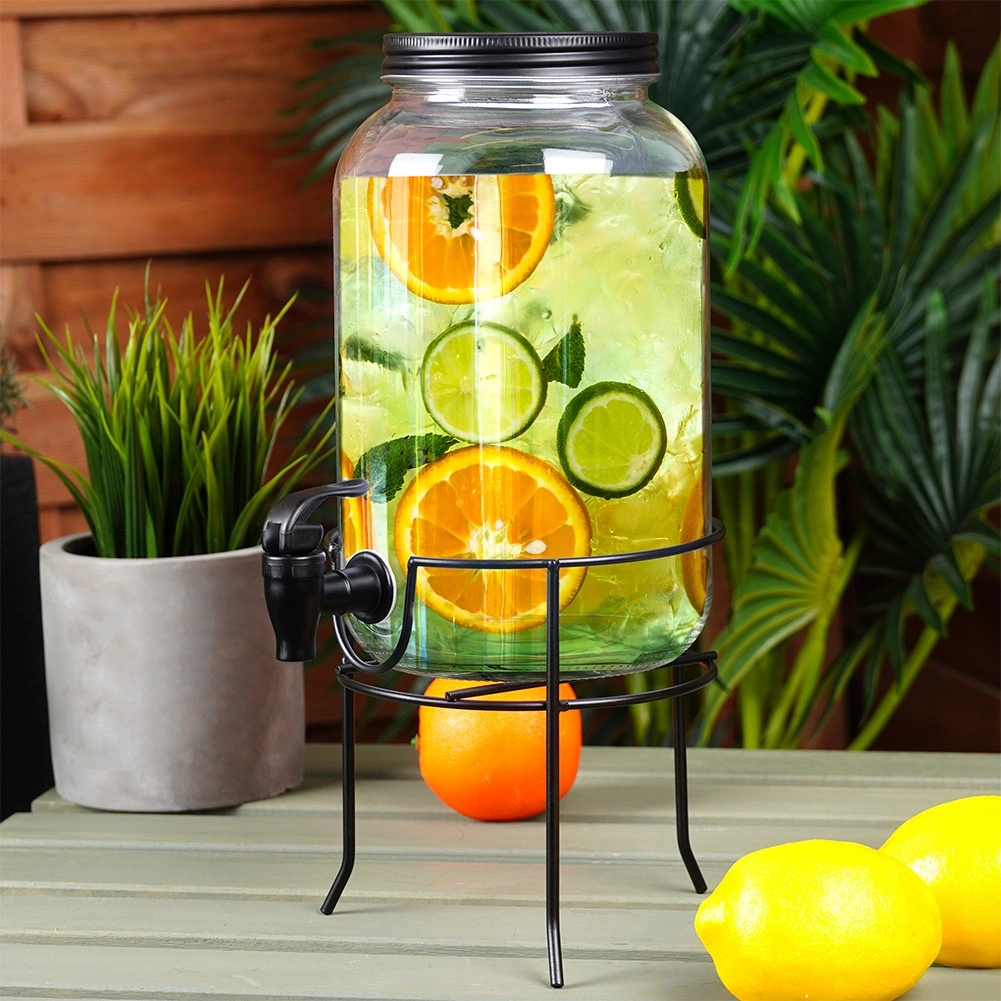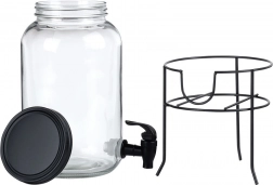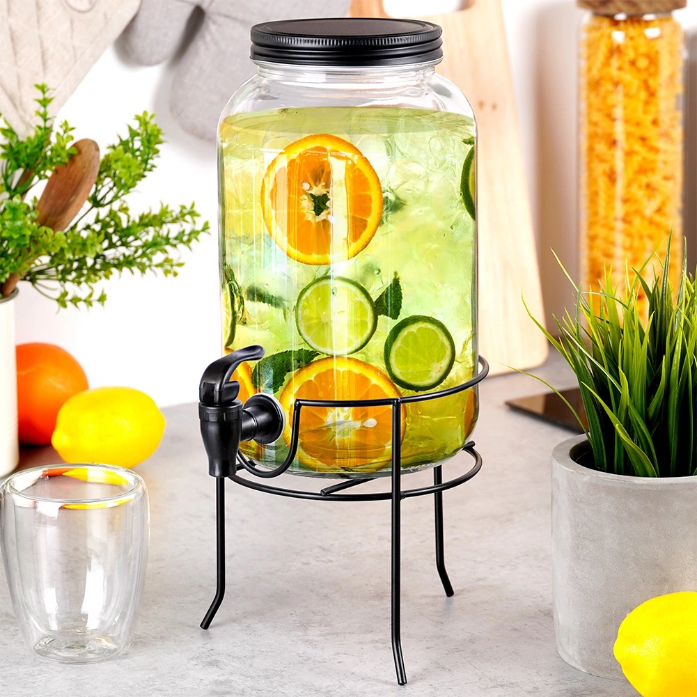 Praktisk drikkedispenser af kvalitetskraftigt glas med sort hane og mat sort lågå holder dine forfriskende drikke beskyttet mod insekter og urenheder. Det stabile metalstativ løfter beholderen til den ideelle højde for glas, så serveringen er ren og bekvem.
