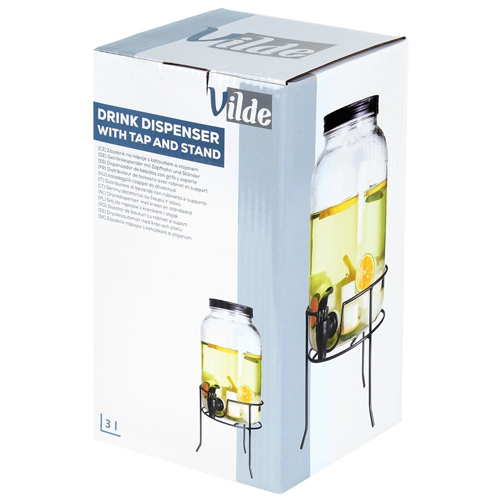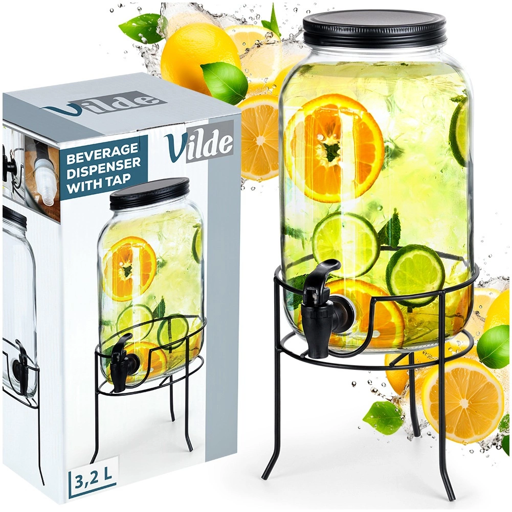 Stilfuld glasdispenser med en kapacitet på 3,2 l med skruelåg, hane og solidt metalstativ for nem påfyldning. Ideel til lemonader, punscher, isthe og vand med frugt. Det klare glas fremhæver indholdet smukt, og det stabile stativ med ben sikrer komfortabel brug derhjemme, i haven og til fester.
