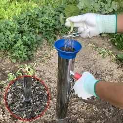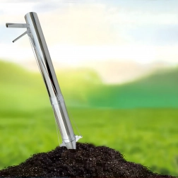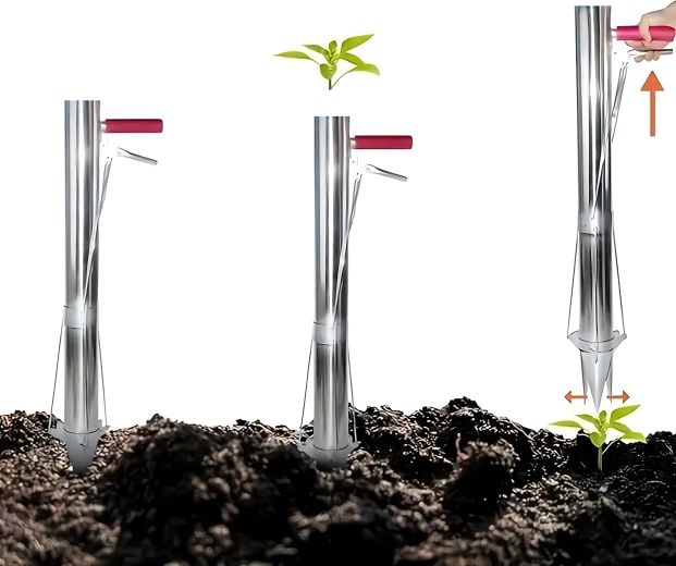 Den koniske spids og det cylindriske hus laver et rent hul med ét tryk; sæt planten i, og frigør jorden nemt igen med håndtaget.