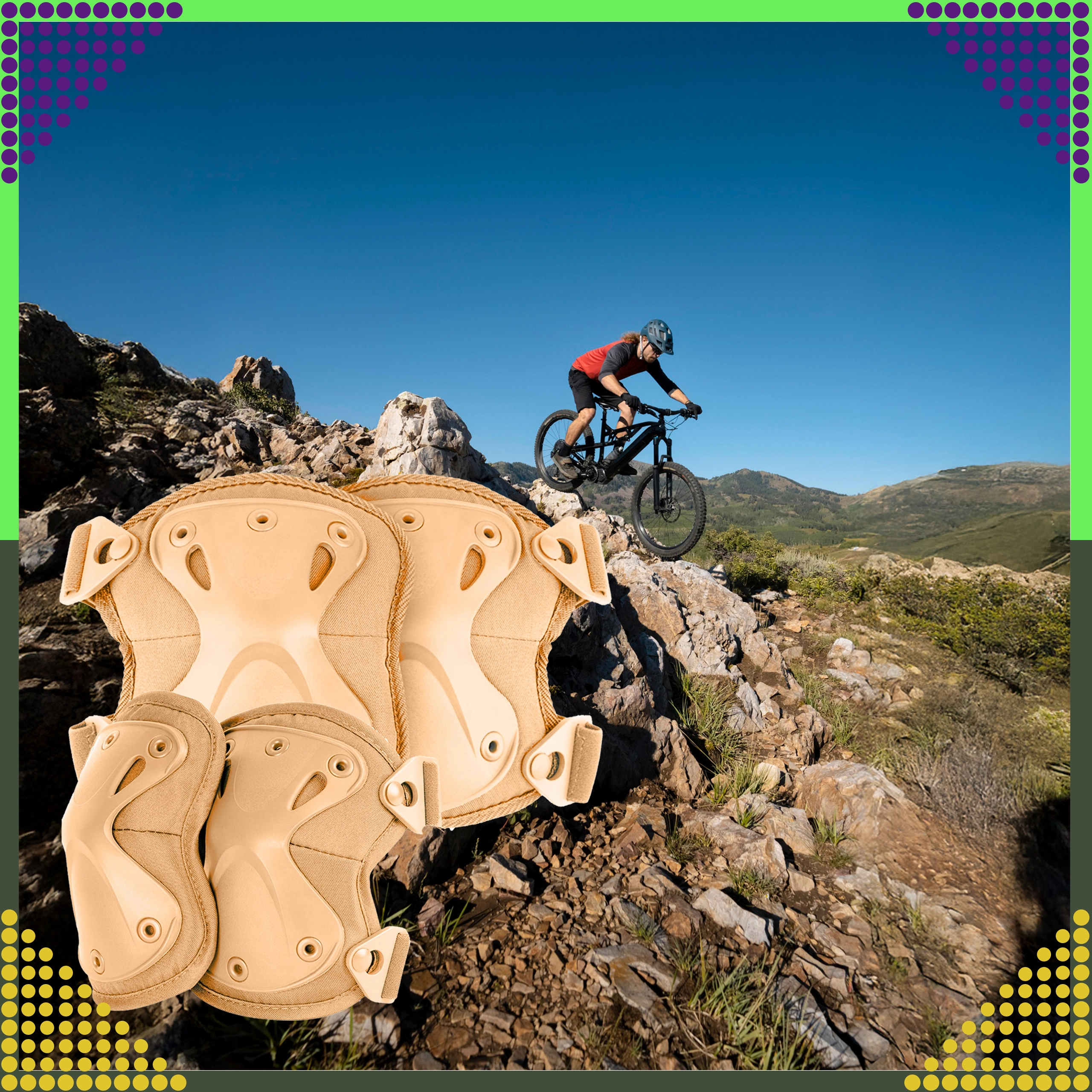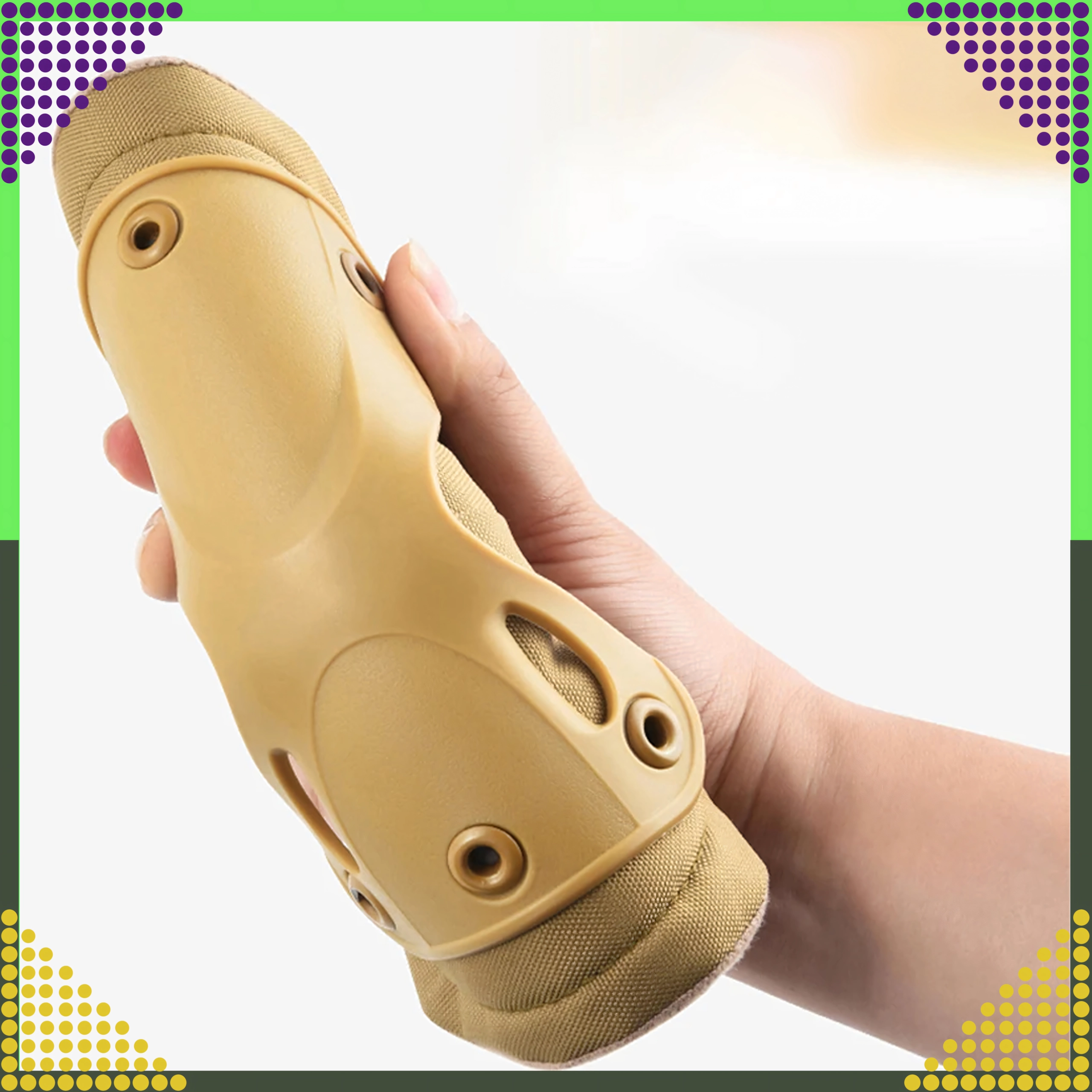 Fastgørelsen sikres af brede elastiske stropper med justerbare spænder og et hurtigudløsningssystem, som gør det muligt at tage dem af uden at ændre stroplængden. Velegnet til airsoft, paintball, skydning, motorcykler, klatring og skating. Den neutrale brune farve passer til det meste udstyr.