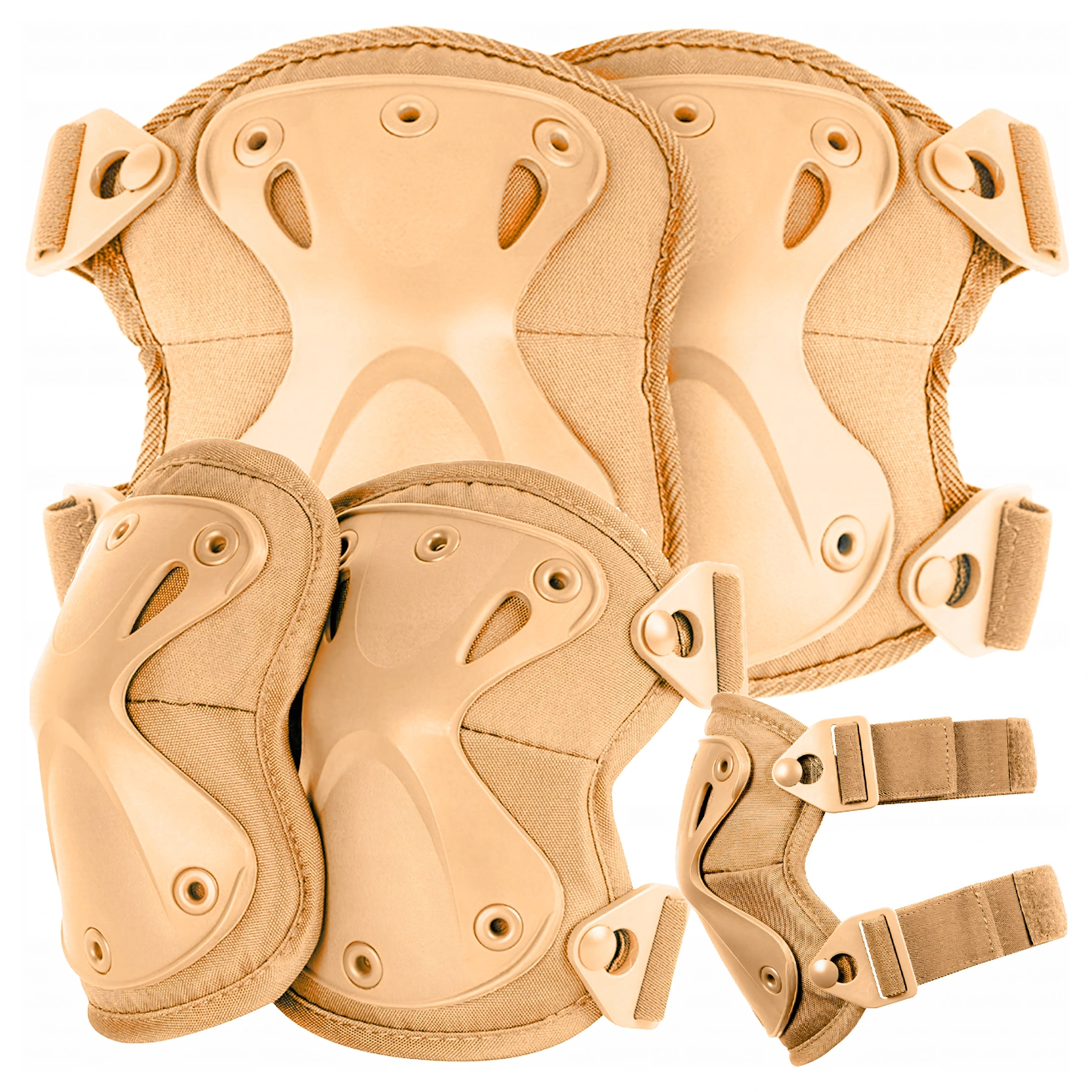 Det taktiske sæt af knæ- og albuebeskyttere kombinerer høj holdbarhed, komfort og hurtig håndtering. De robuste skaller af slidstærk plast er nittet til polstringen, så de holder godt selv ved intens bevægelse. Takket være den koniske form fordeler de slag bedre og reducerer risikoen for skader ved knælen eller fald.
