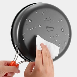 Gryde med låg, pande og kedel kan nemt stables i hinanden. Ideel størrelse og vægt til vandring og camping for to.