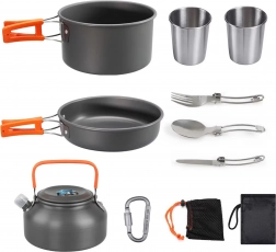 Dette alsidige camping-kogegrejssæt giver dig alt, hvad du behøver til komfortabel madlavning i naturen. Gryde med låg, pande og lille elkedel giver et pålideligt grundlag til kogning, stegning og opvarmning af vand. Takket være sammenklappelige, varmebestandige håndtag og et smart nesting-pakkesystem passer hele sættet nemt i rygsækken.