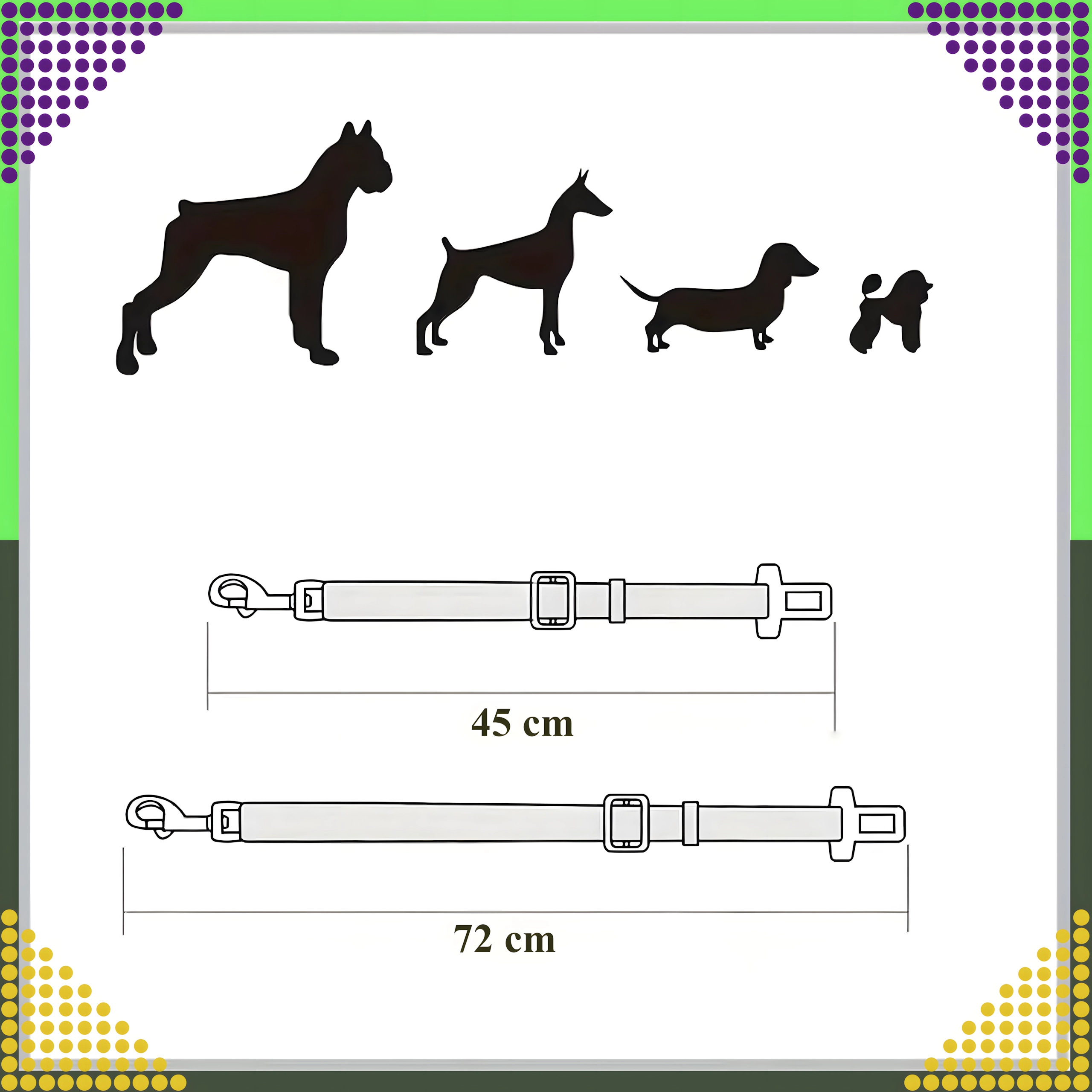 Praktisk sele til at sikre hund eller kat under bilkørsel. Du sætter den blot i den standard sikkerhedssele-udtag og fastgør den anden ende med en roterende karabinhage til selen (anbefales frem for halsbånd). Justerbar længde 45–72 cm lader kæledyret sidde eller ligge, men begrænser samtidig farlige bevægelser i bilen.
