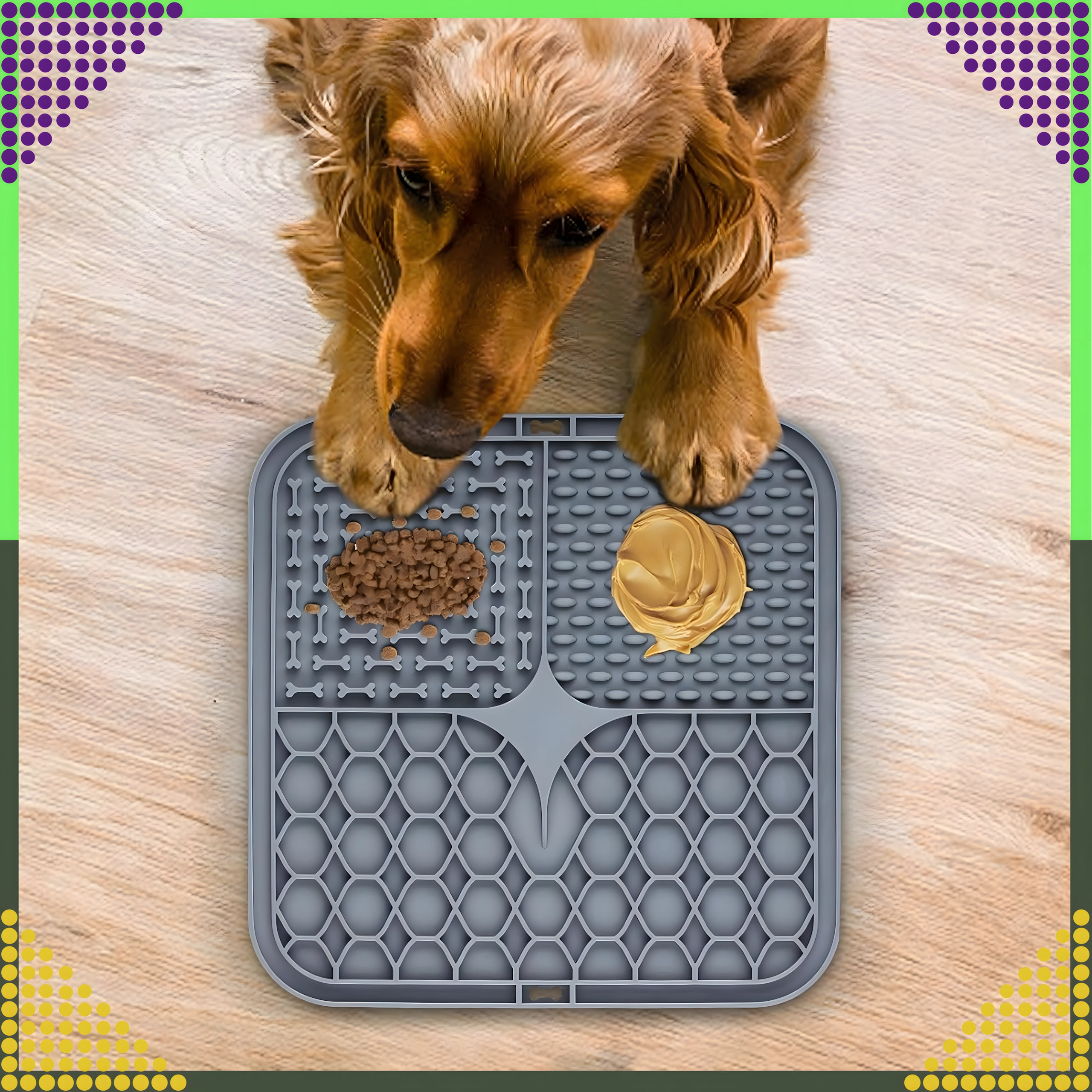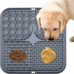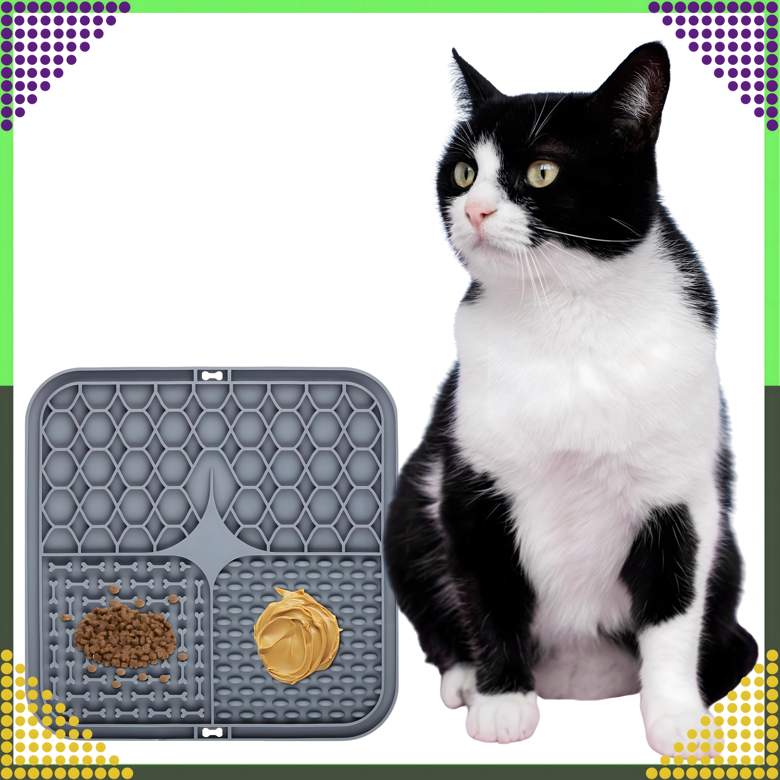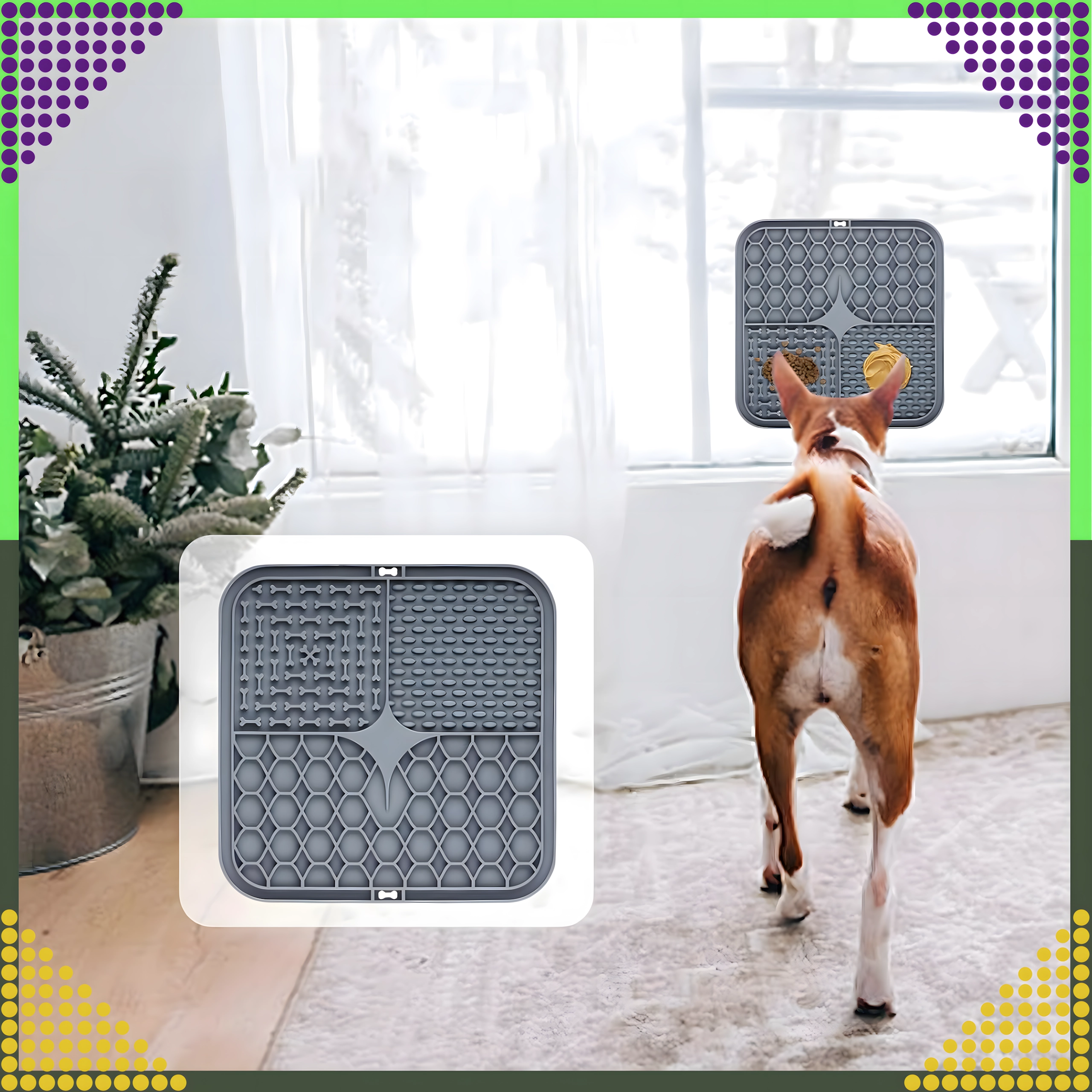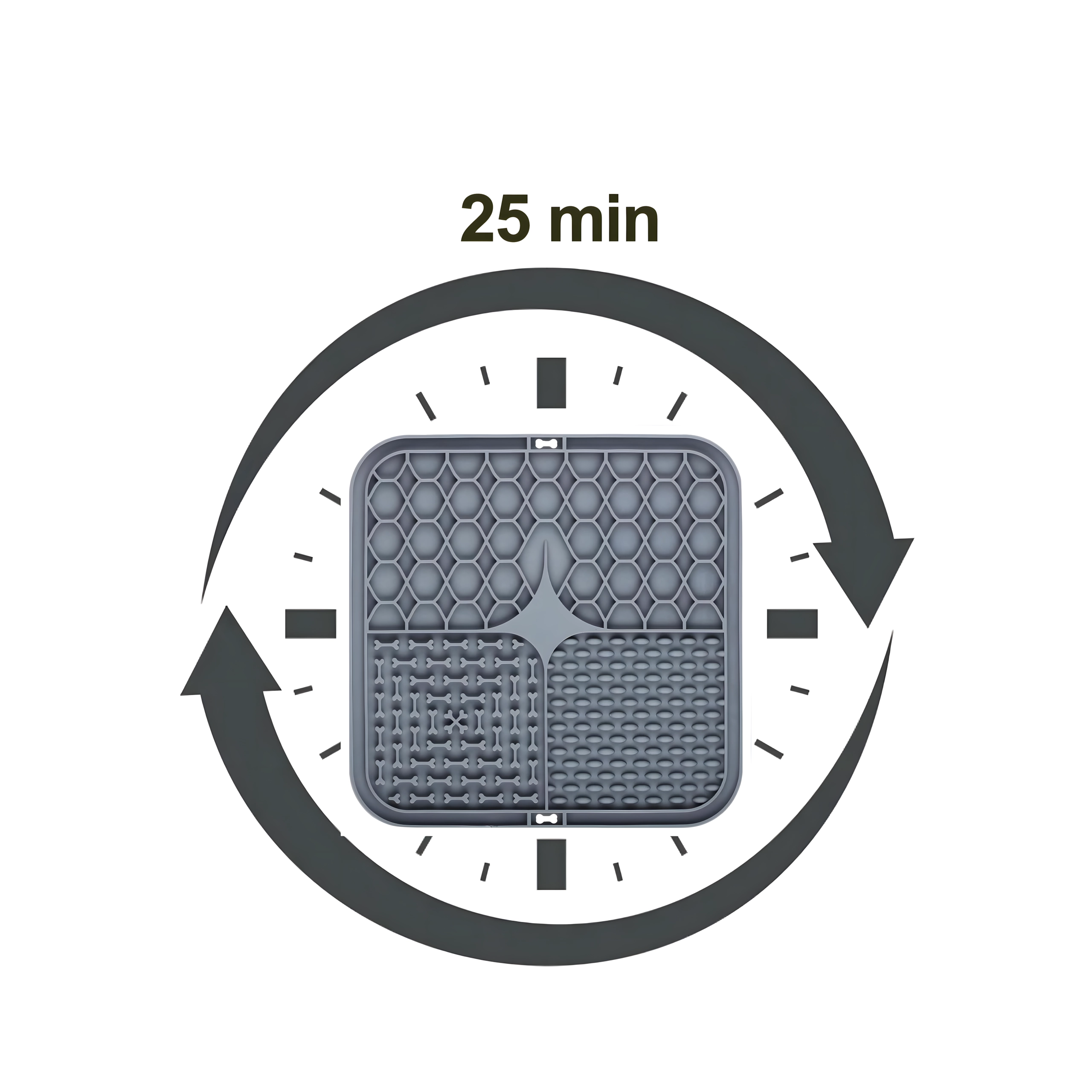 Bagsiden med skridsikre sugekopper holder måtten sikkert på gulvet eller på en lodret overflade (fx i badeværelset under bad). Måtten er lavet af blød, let rengørlig silikone og er ideel til at sænke spisehastigheden og som afledning under pelspleje eller ved besøg hos dyrlægen.