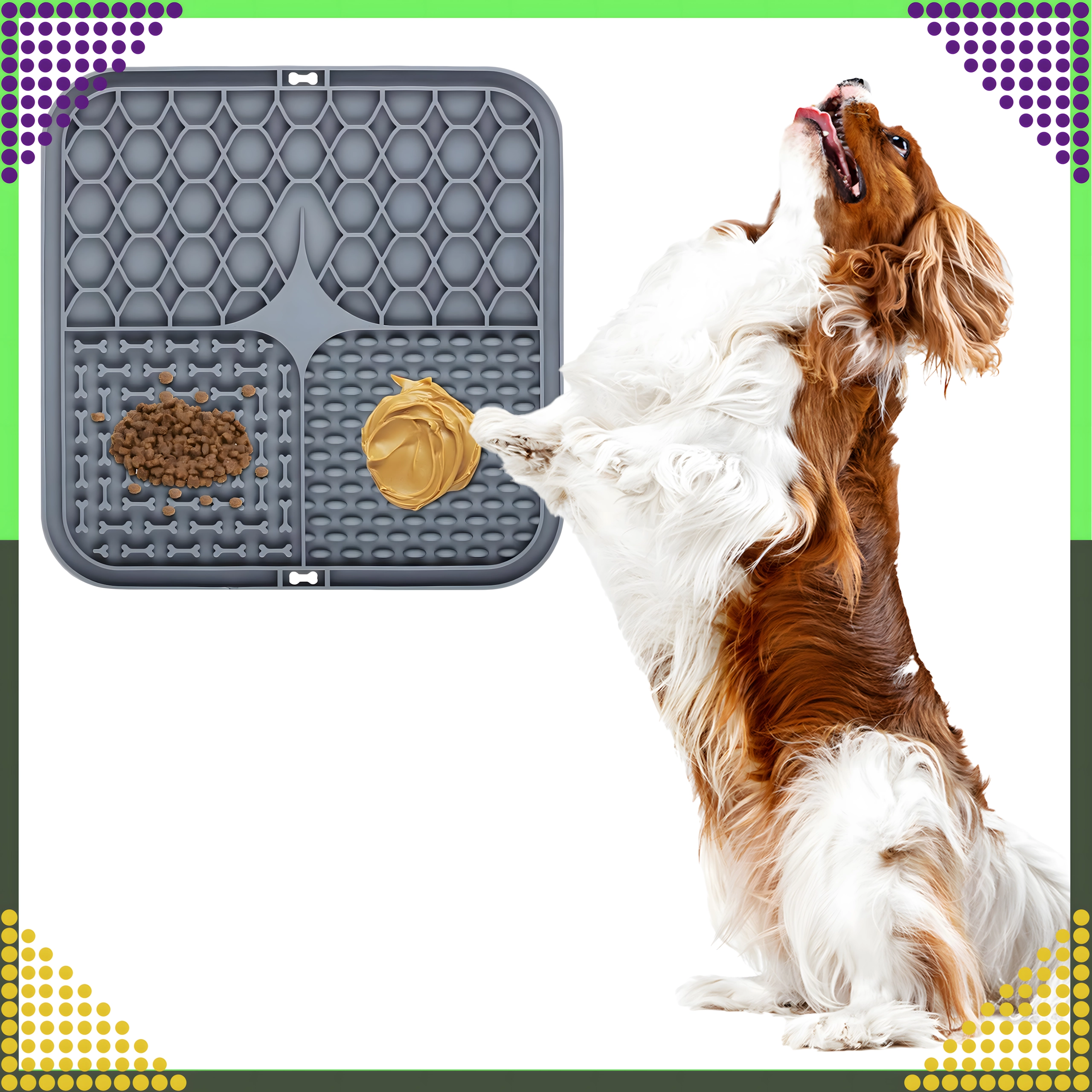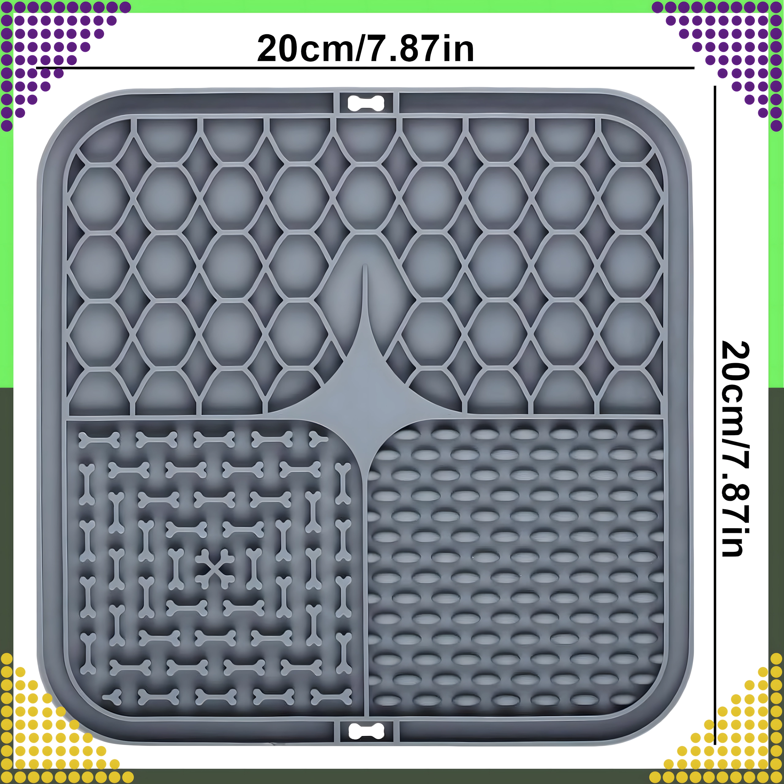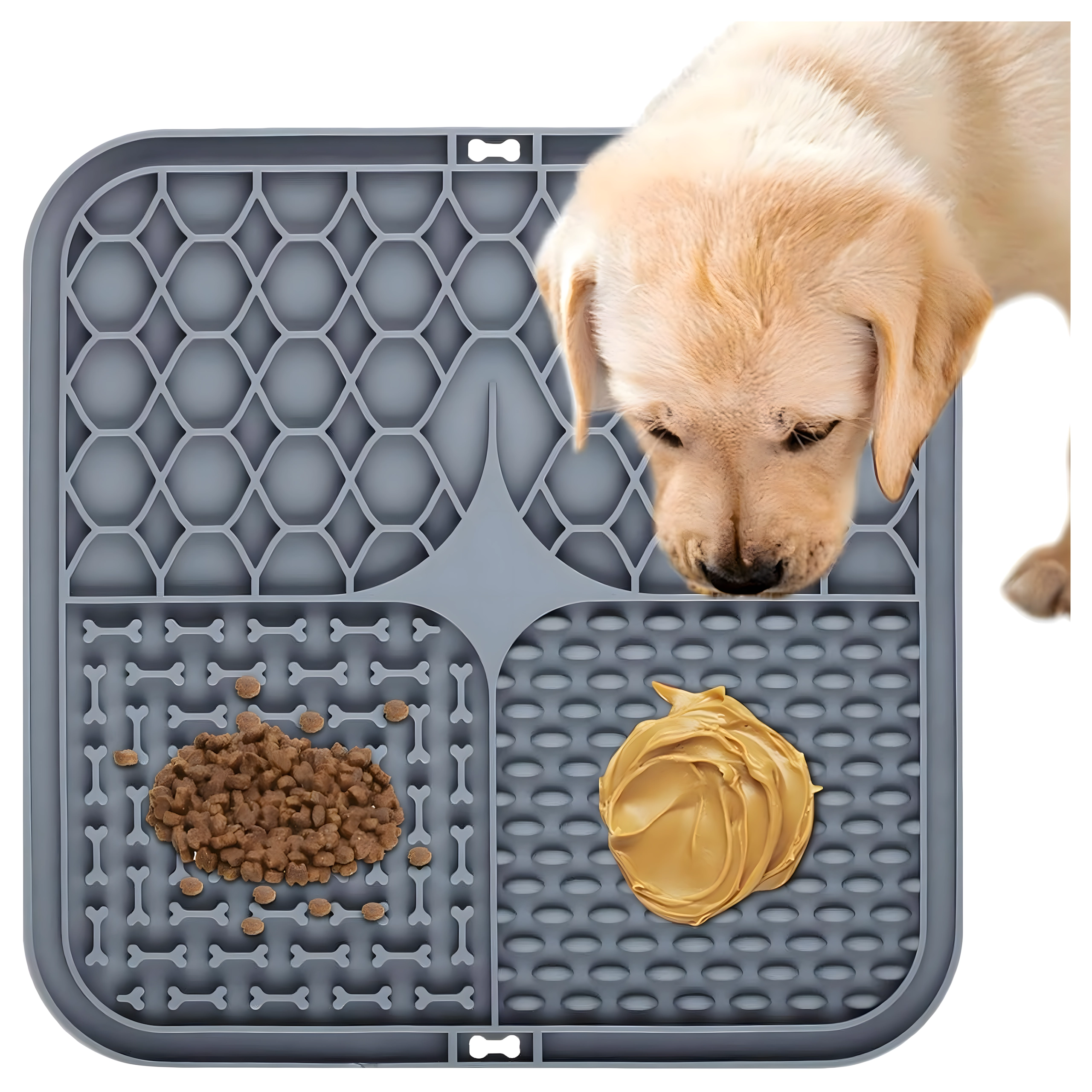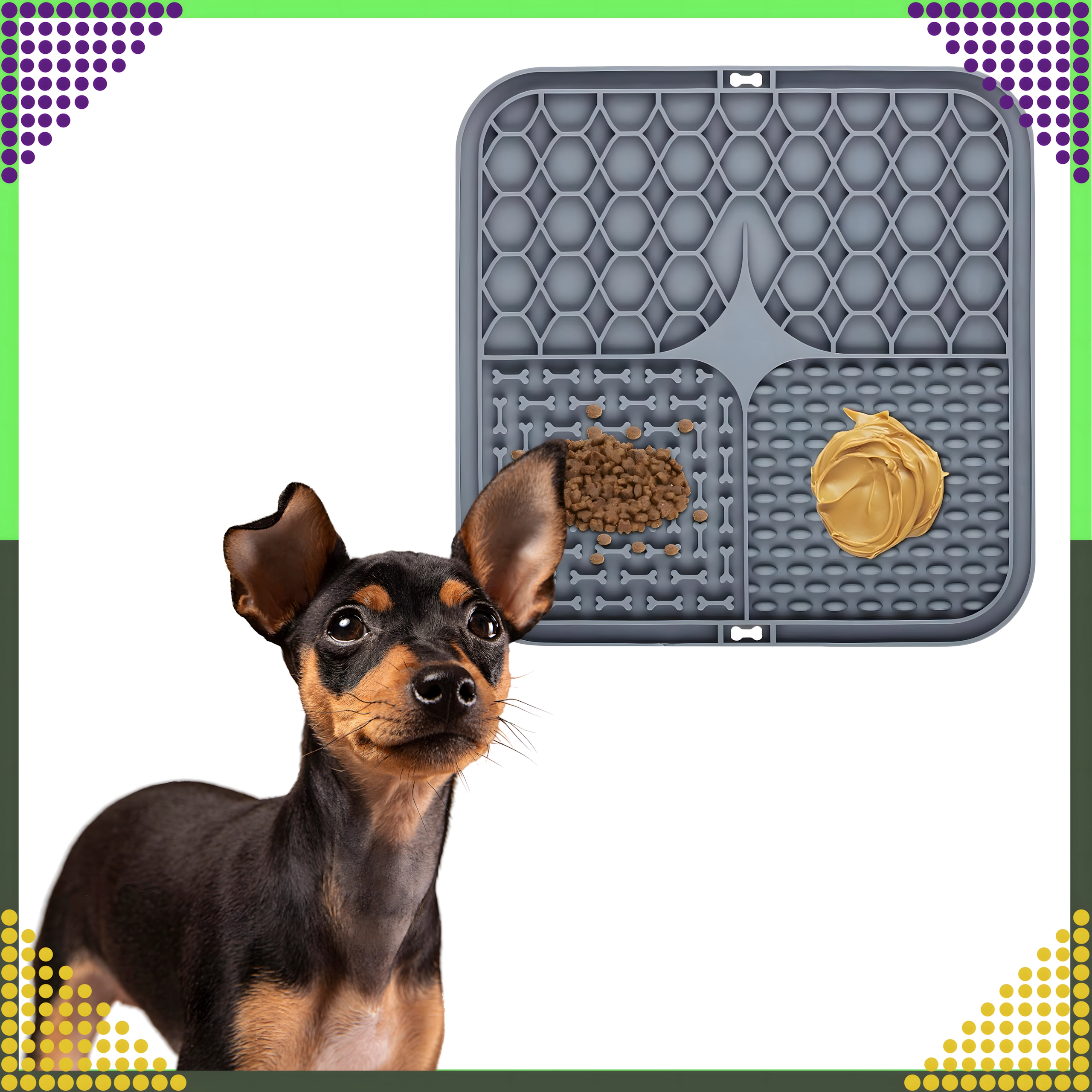 Bagsiden med skridsikre sugekopper holder måtten sikkert på gulvet eller på en lodret overflade (fx i badeværelset under bad). Måtten er lavet af blød, let rengørlig silikone og er ideel til at sænke spisehastigheden og som afledning under pelspleje eller ved besøg hos dyrlægen.
