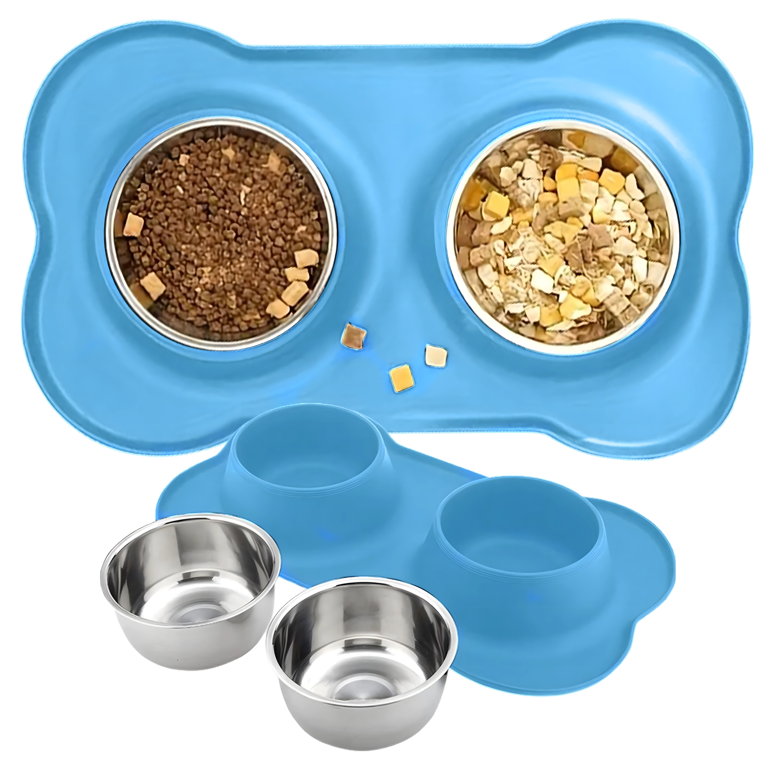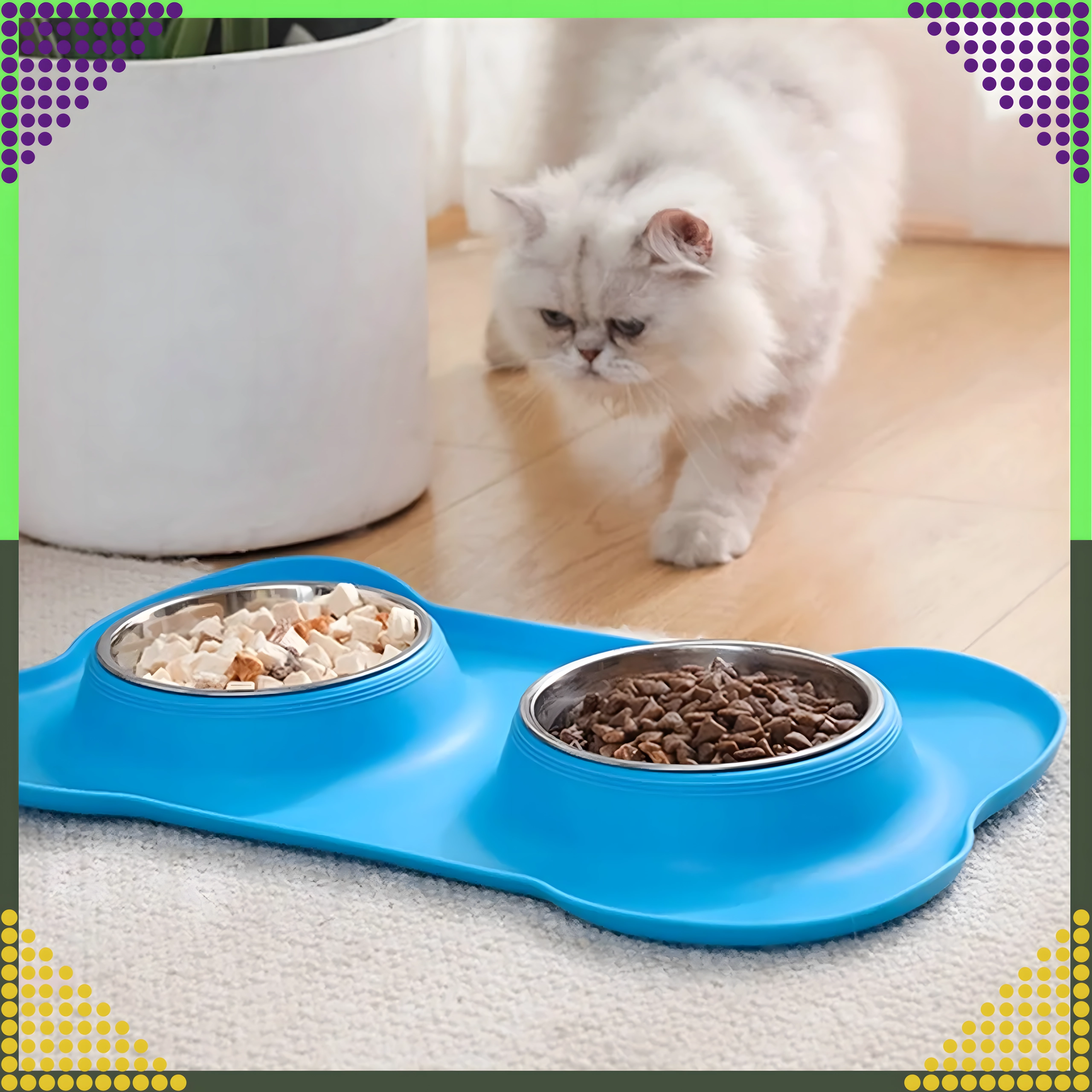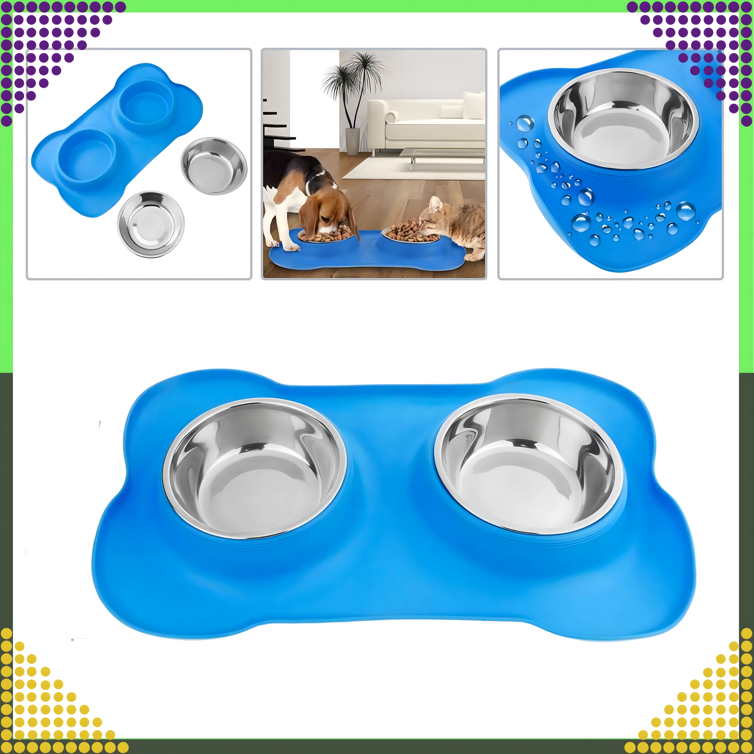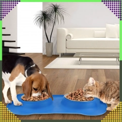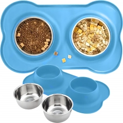 Gør fodringen renere og mere bekvem. Den dobbelte skål med solid silikone-måtte holder det hele på plads, opfanger spildte foderkugler og vanddråber, og takket være de indsatser i rustfrit stål er den let at rengøre – også i opvaskemaskinen.