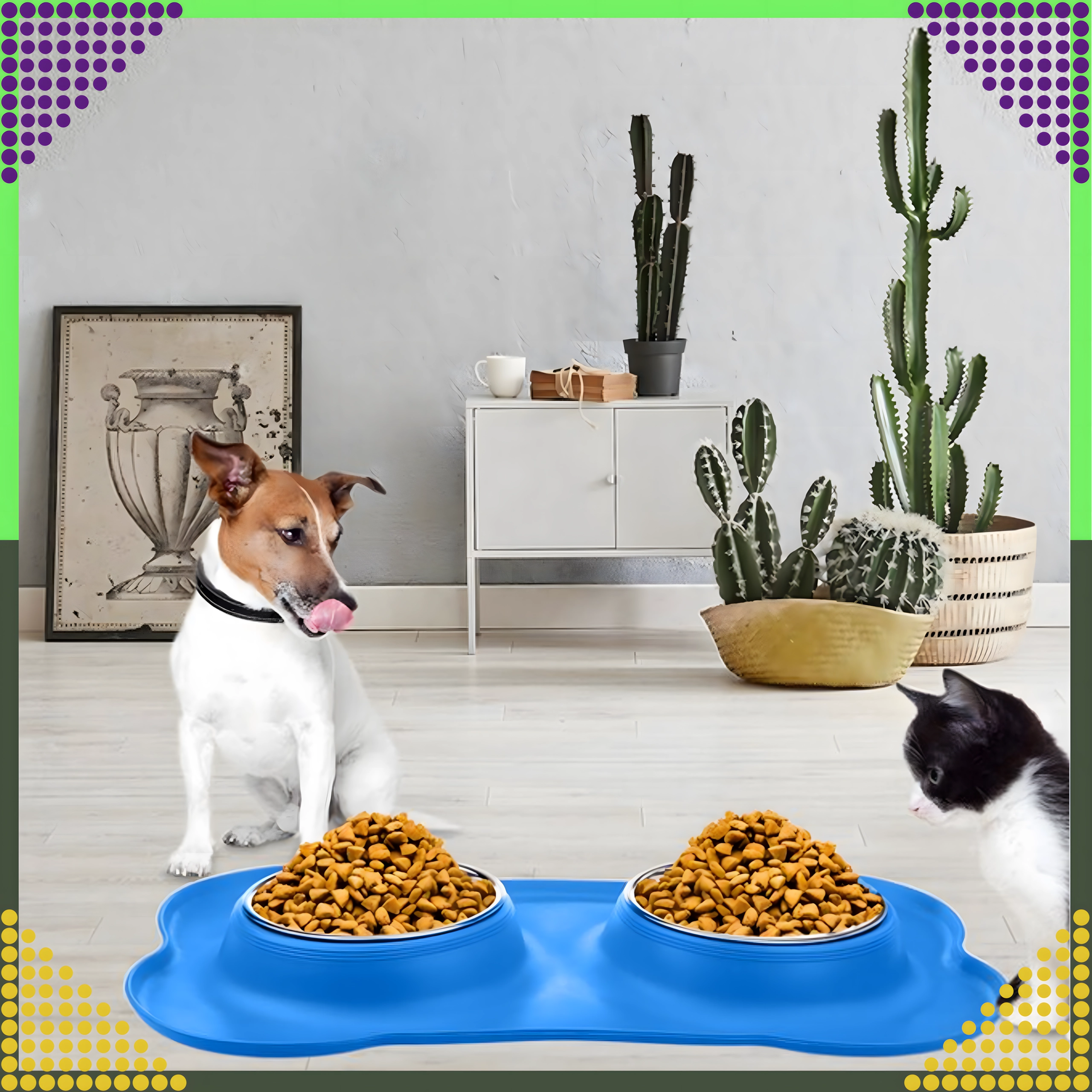 Den brede silikonebase holder skålene stabilt på plads og opfanger både foderkugler og vanddråber for et renere fodringsområde.
