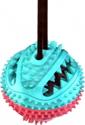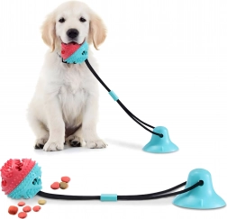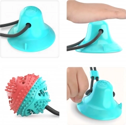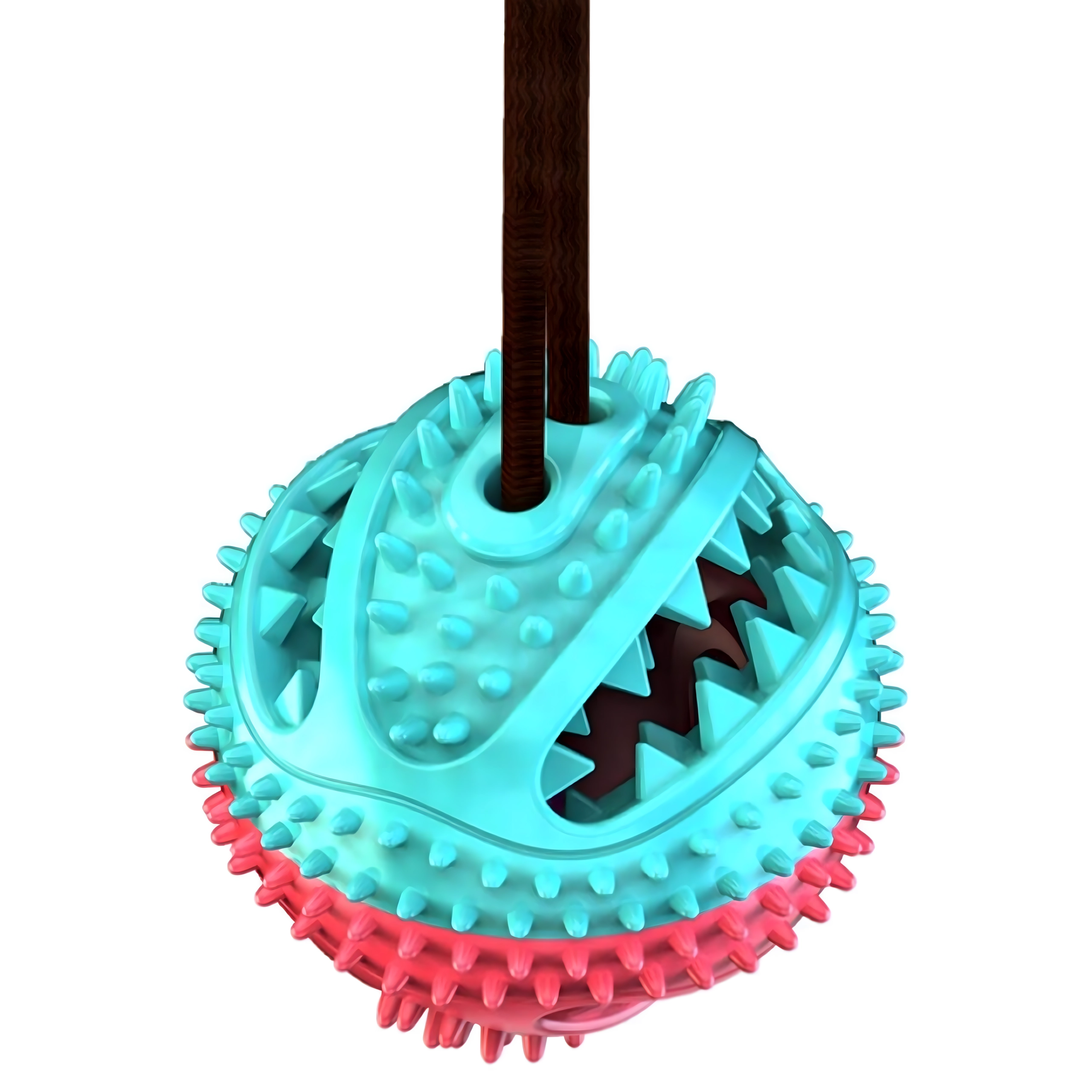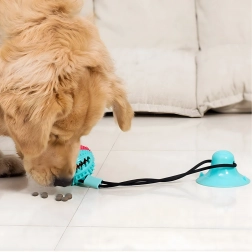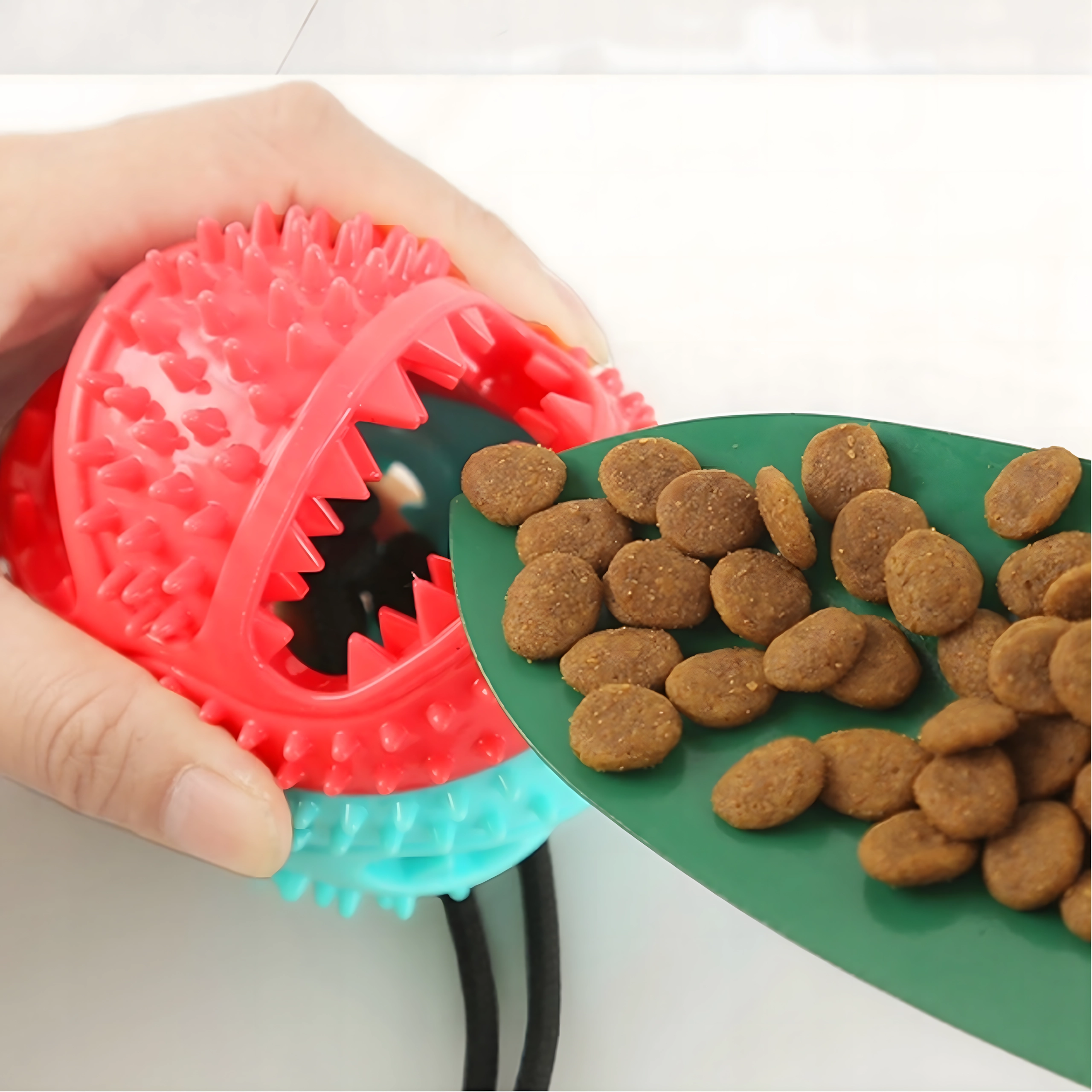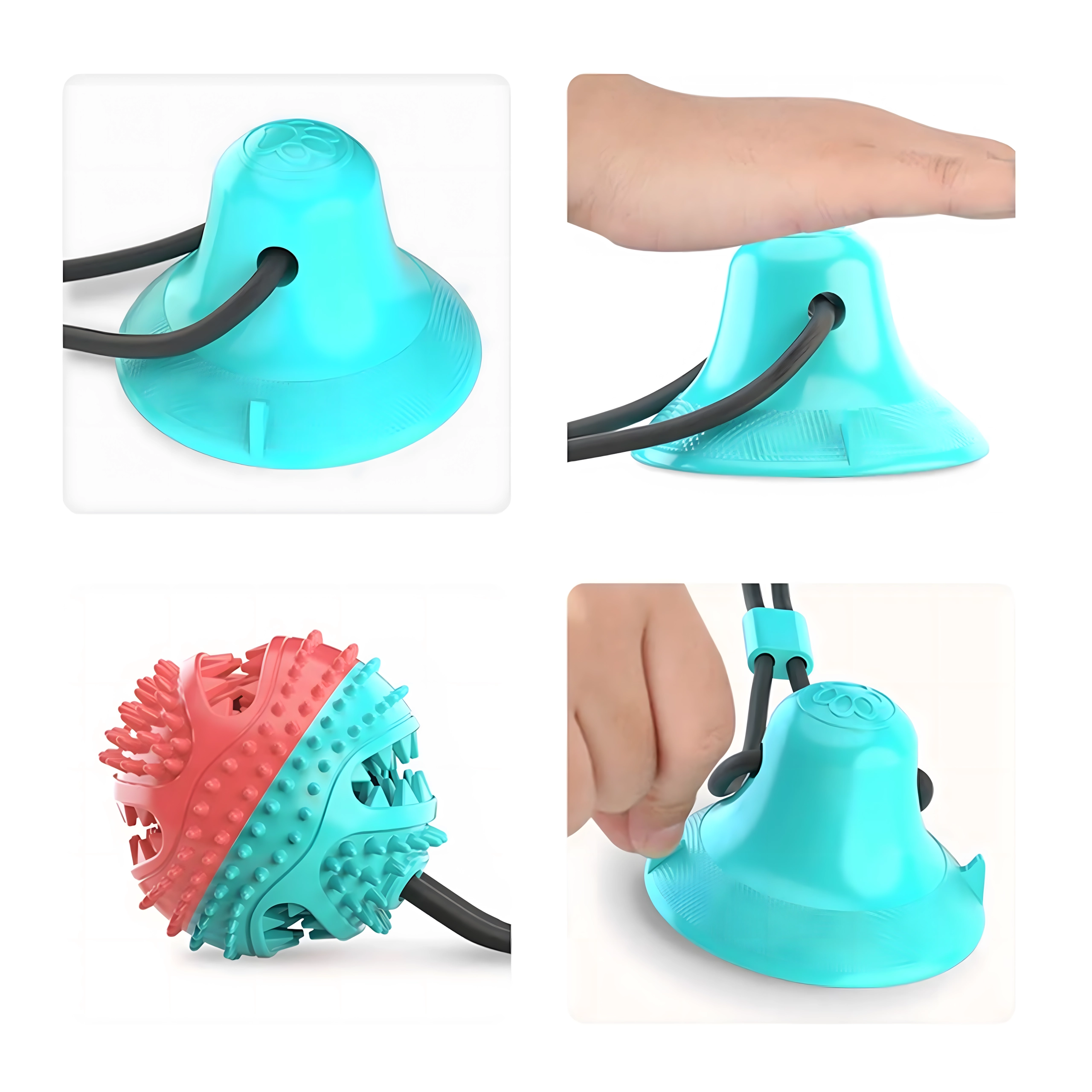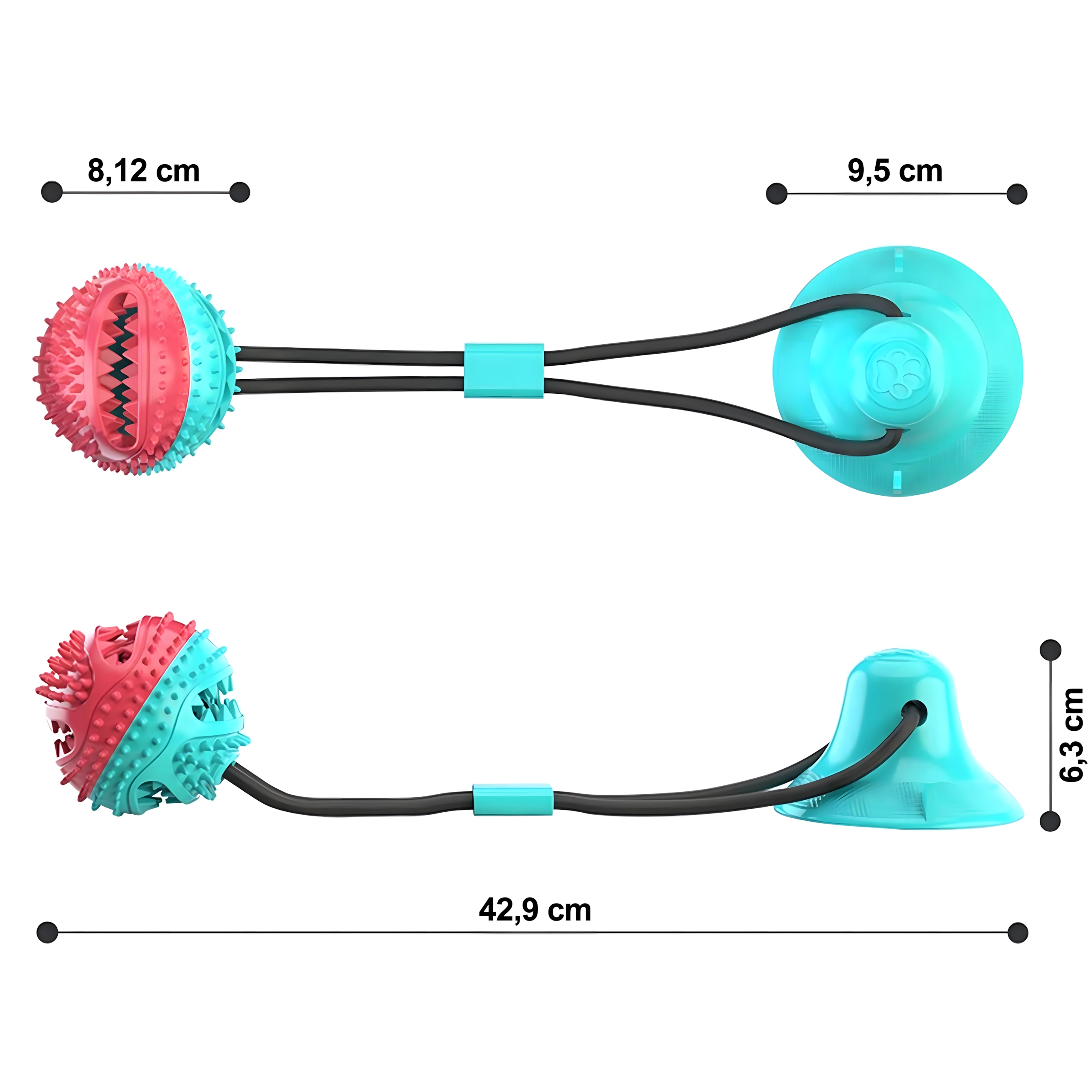 Denne interaktive legetøj med sugekop kombinerer en godbold med et reb til trække- og tyggeleg. Sugekoppen fastgøres let på en glat overflade, så hunden kan lege sikkert uden din assistance. Den piggede struktur på bolden hjælper ved hvert bid med at reducere tandplak og pleje gummerne. Åbningen til godbidder understøtter langsommere foderindtag og forlænger legen.