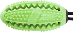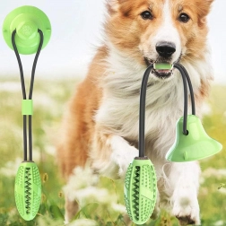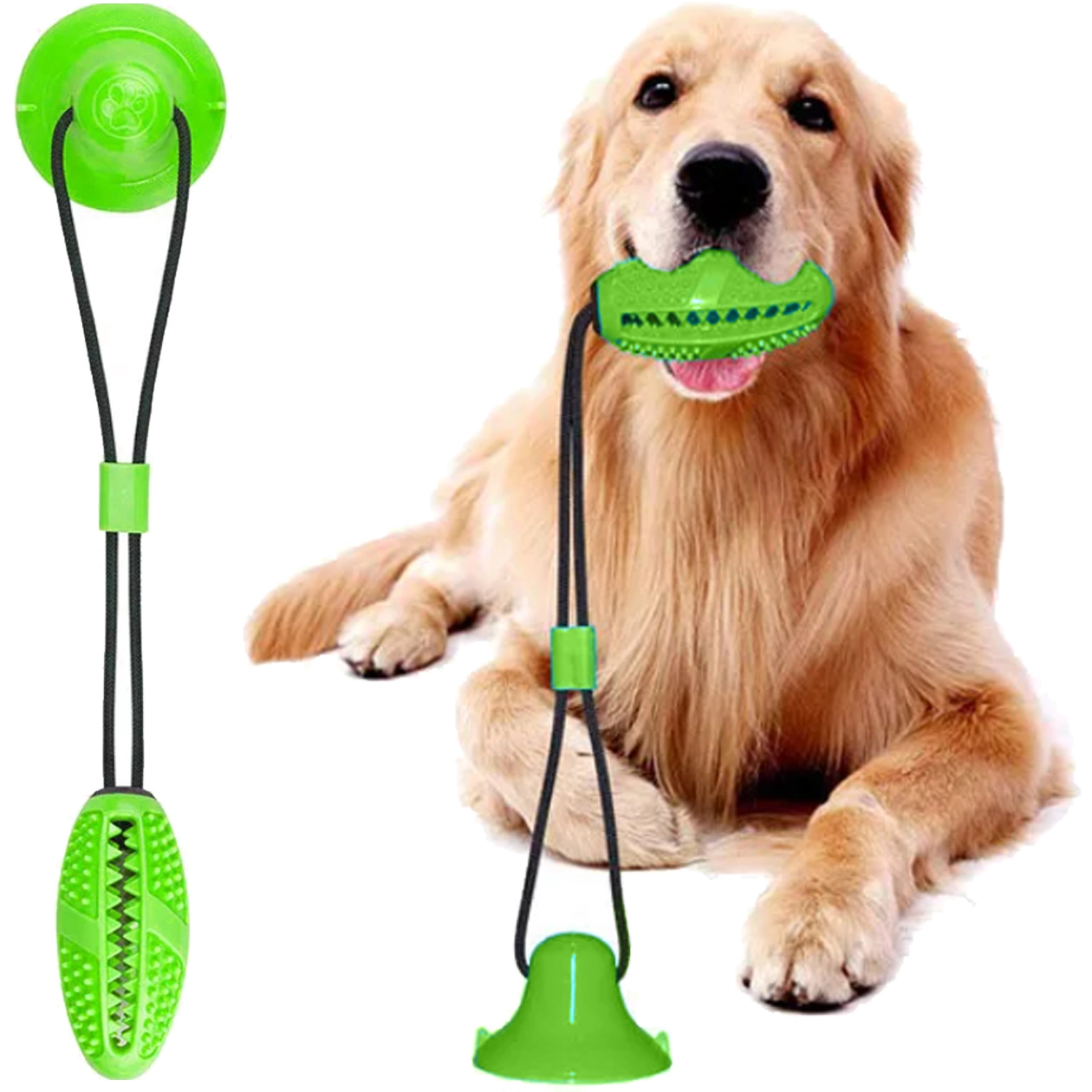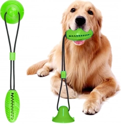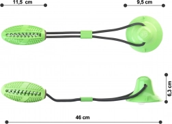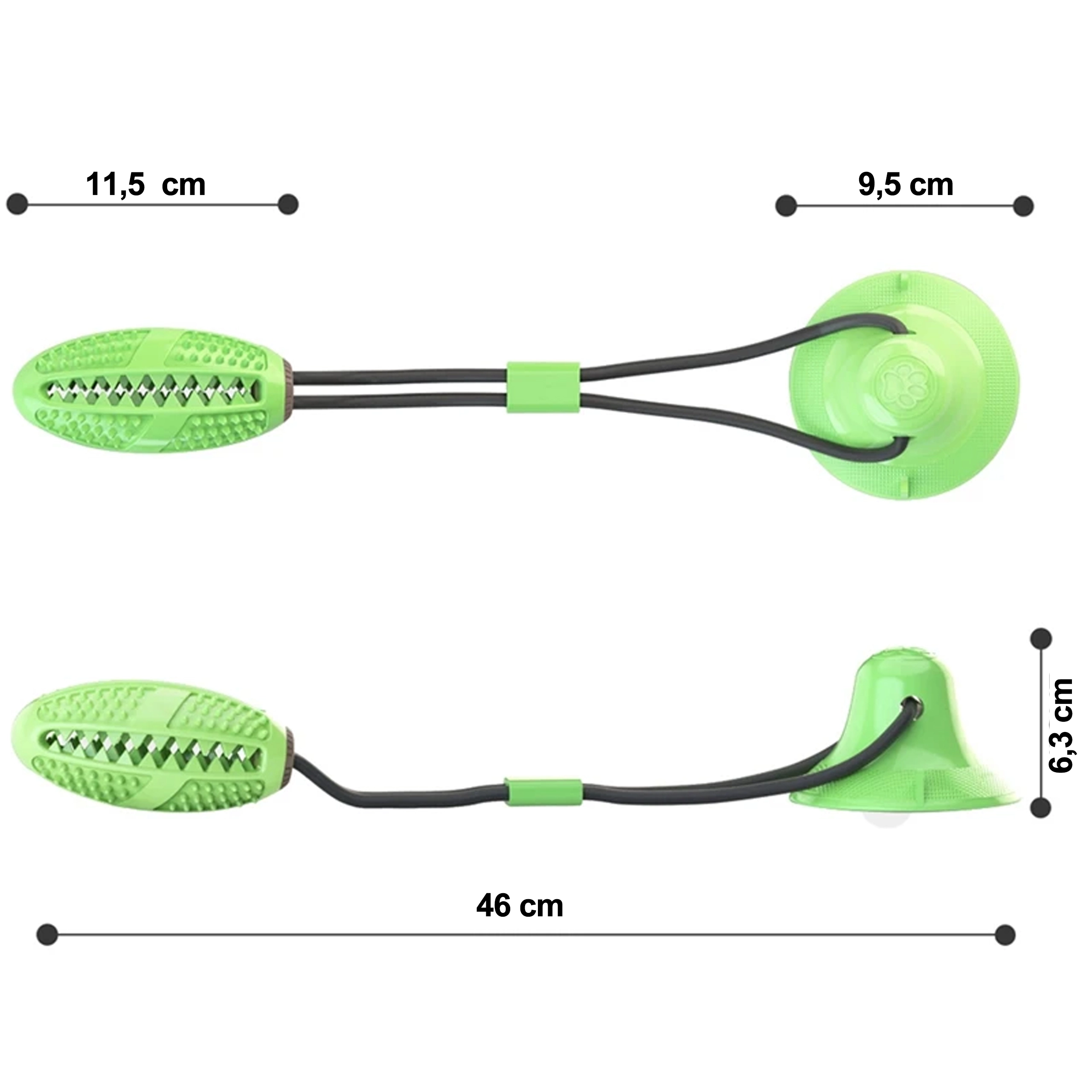Det interaktive tyggelegetøj med sugekop er designet til hundens naturlige behov for at bide samt mental stimulering. Den stærke sugekop holder på glatte overflader og giver hunden mulighed for selvstændigt at trække og hive, mens det robuste reb og den fleksible forbindelse sikrer sikker og langvarig underholdning. Den teksturerede overflade med knopper og ribber renser tænder, massérer gummer og hjælper med at reducere tandsten under tygning.