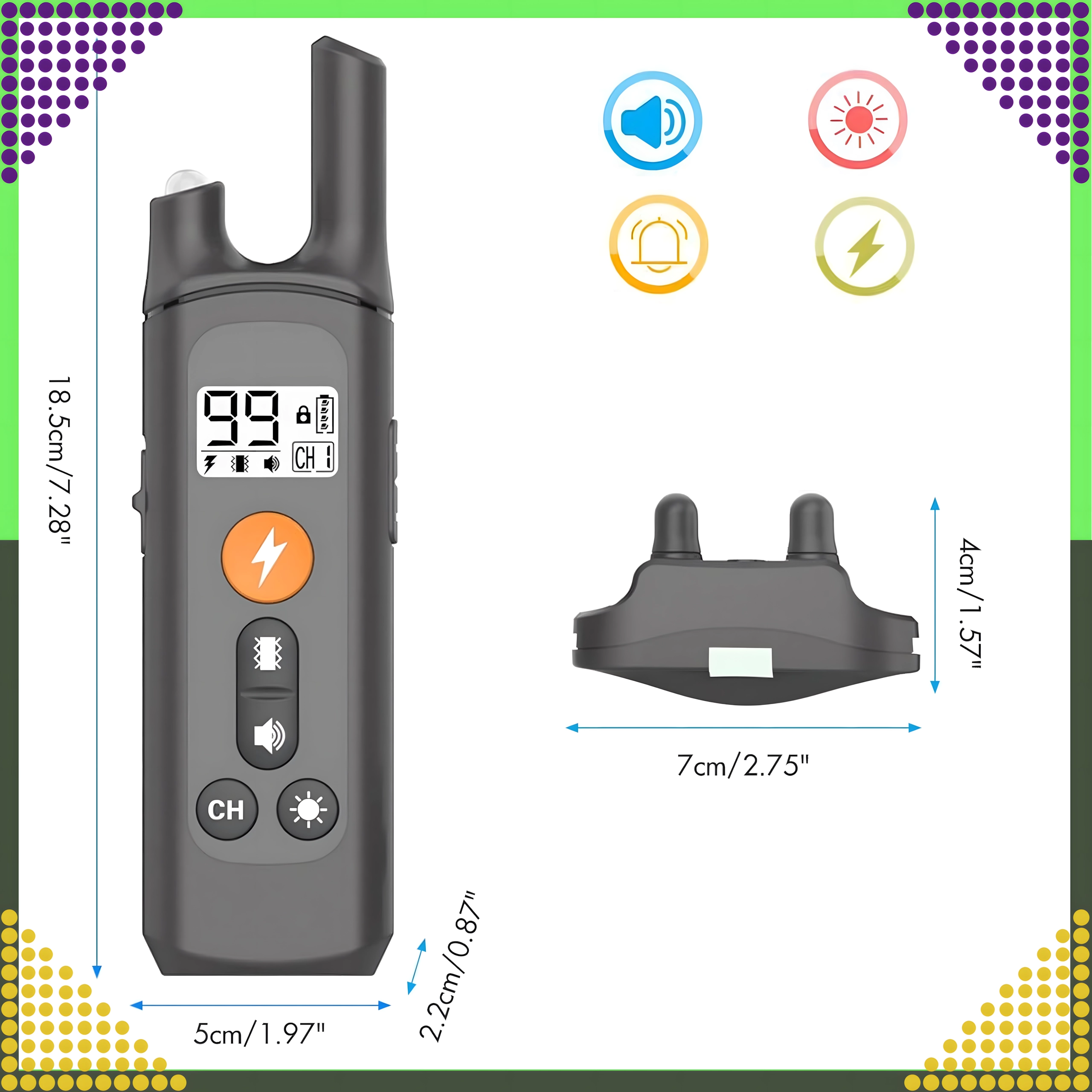 Fire tilstande – stød, vibration, lys og lyd – hjælper med skånsomt at korrigere uønsket adfærd, reducere gøen eller flugt og styrke daglig lydighed. Justerbar rem (op til ca. 70 cm) passer til de fleste racer.