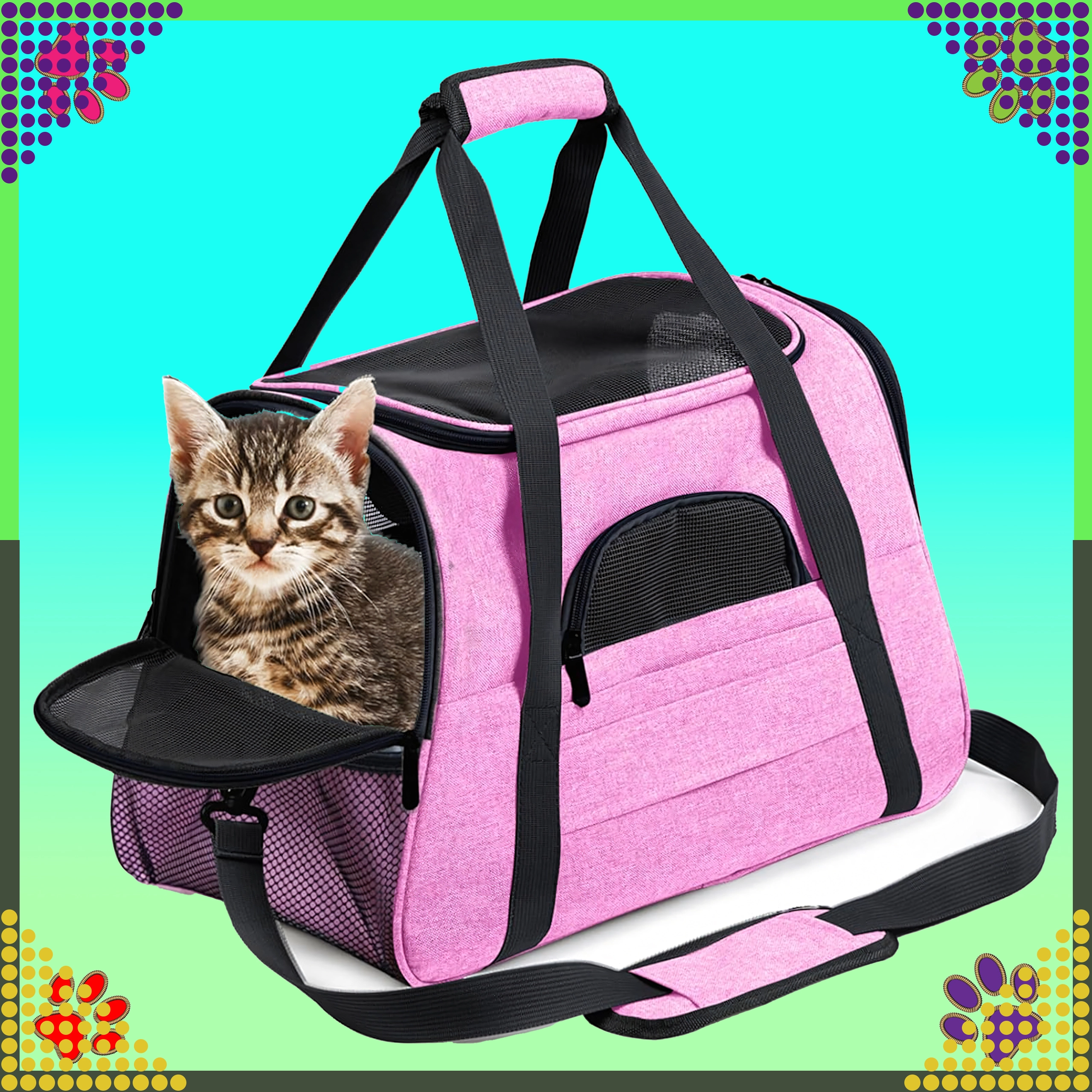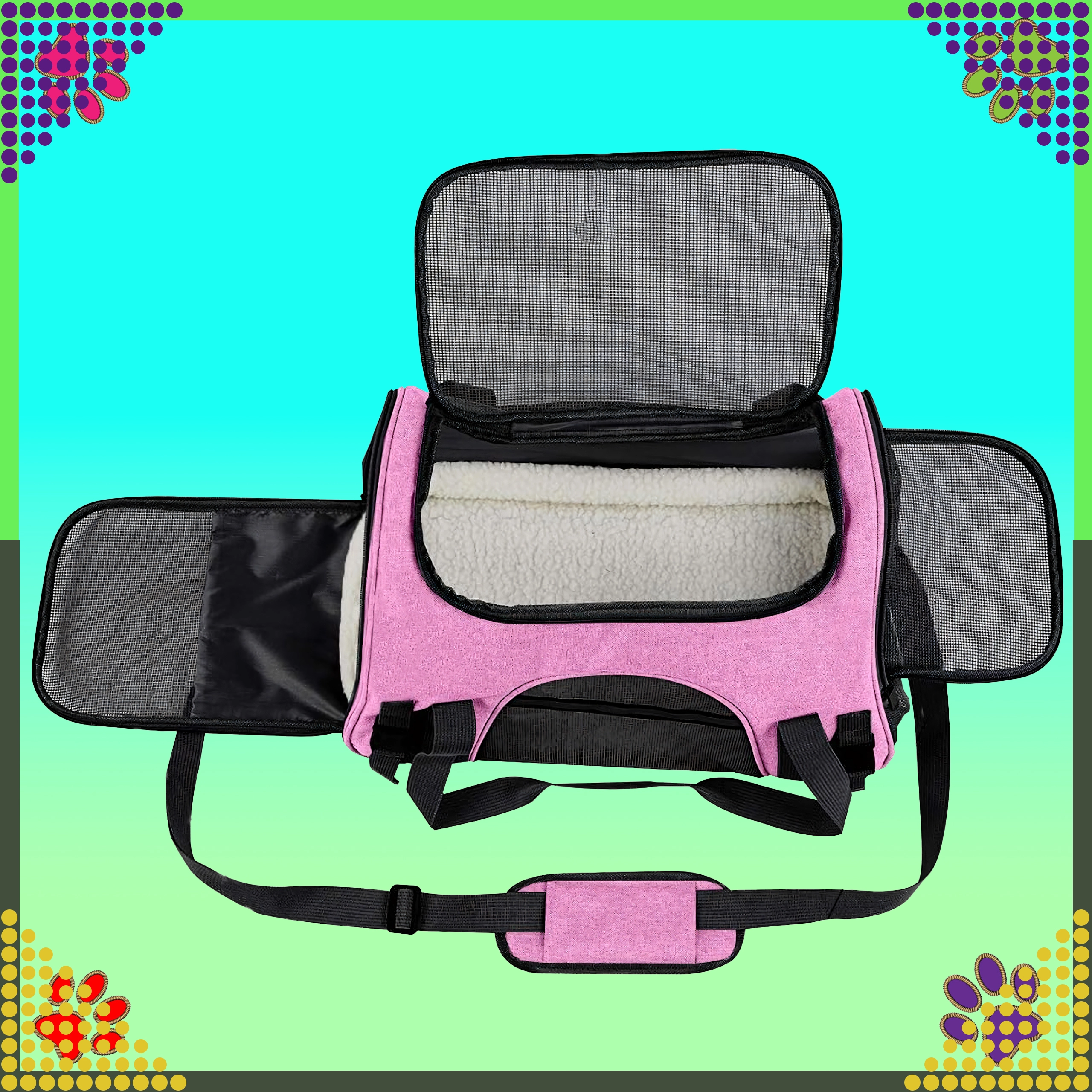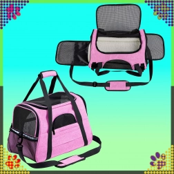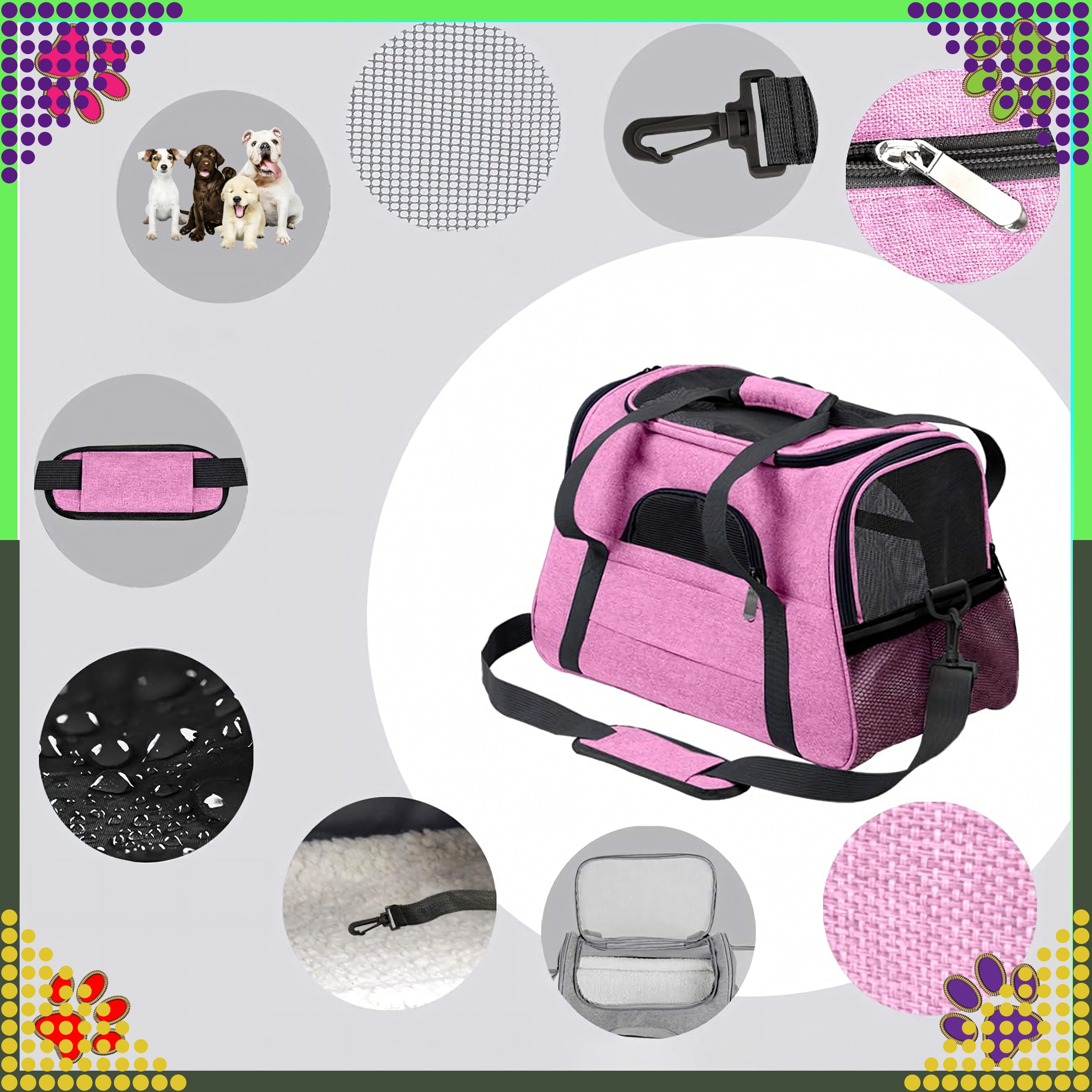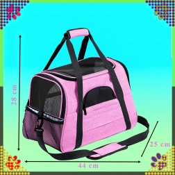 Den praktiske transporttaske til dyr kombinerer komfort, sikkerhed og nem vedligeholdelse. Takket være kvalitetspolyester er den modstandsdygtig over for pletter og skader, absorberer ikke ubehagelige lugte og bevarer sit udseende selv ved hyppig brug. Det rosa design vil glæde stilbevidste ejere og giver dyret et roligt rum under rejsen.