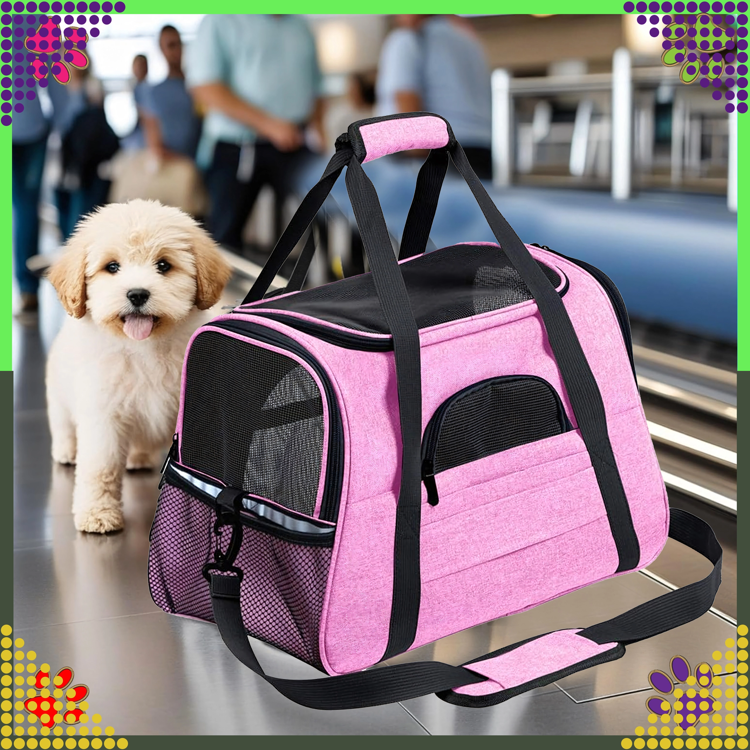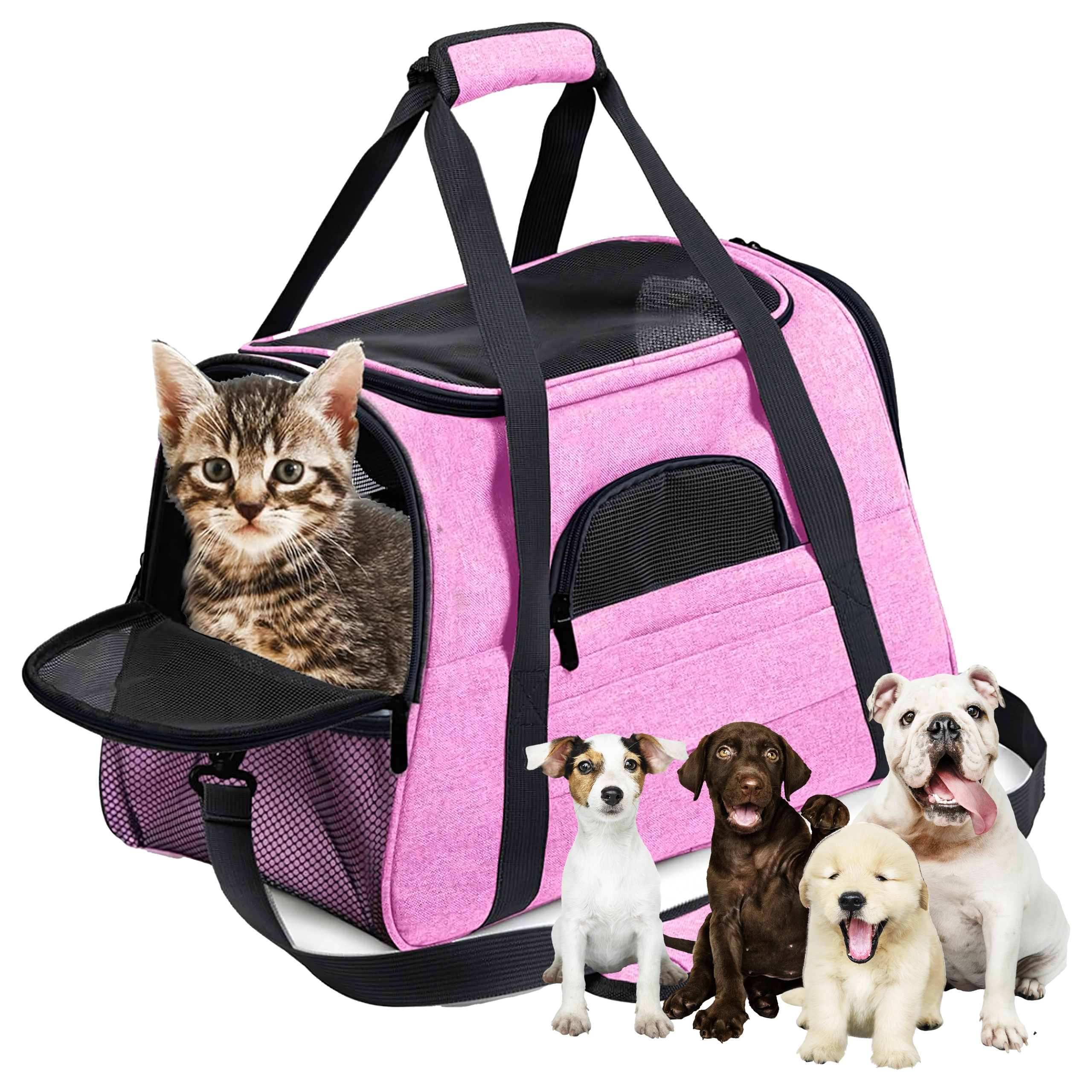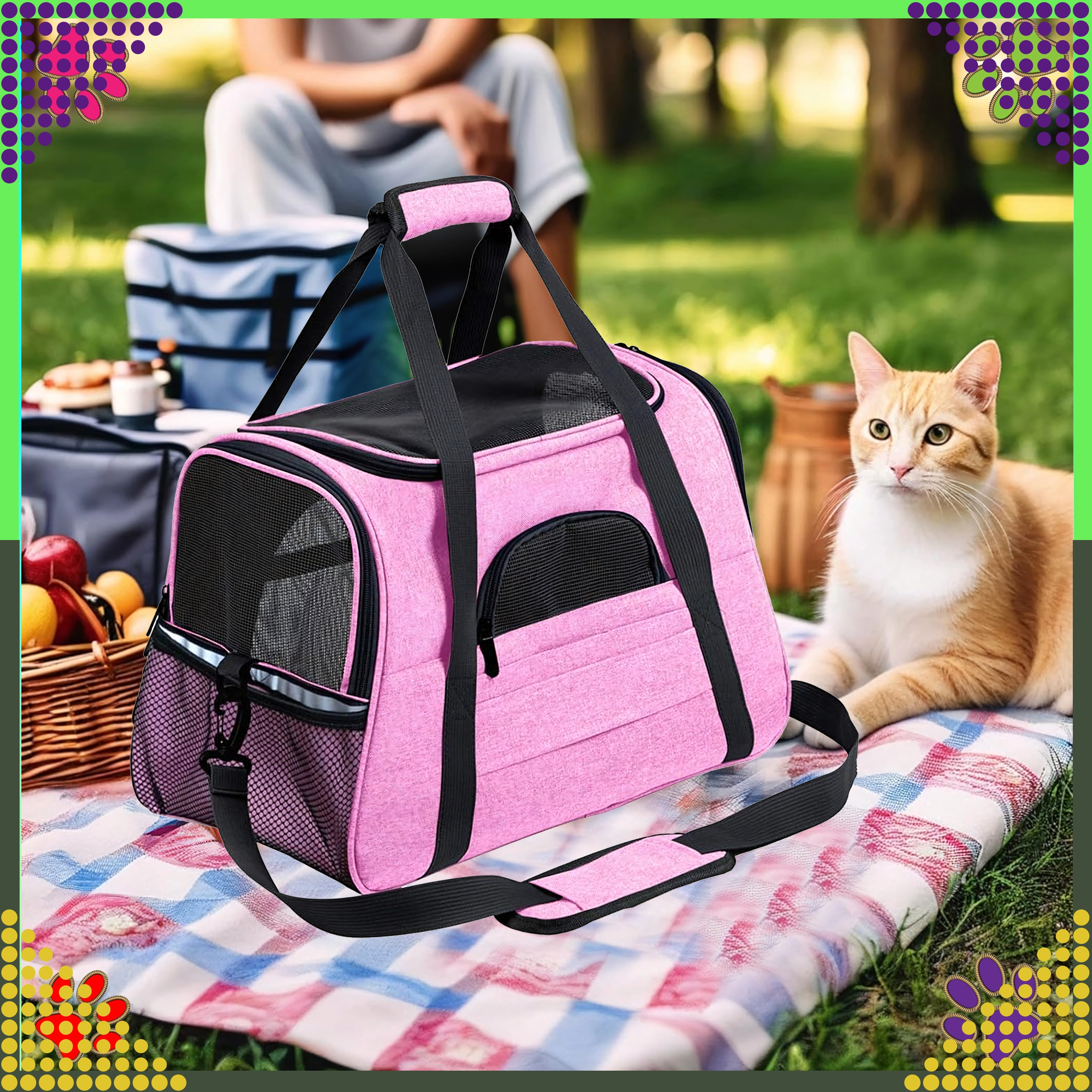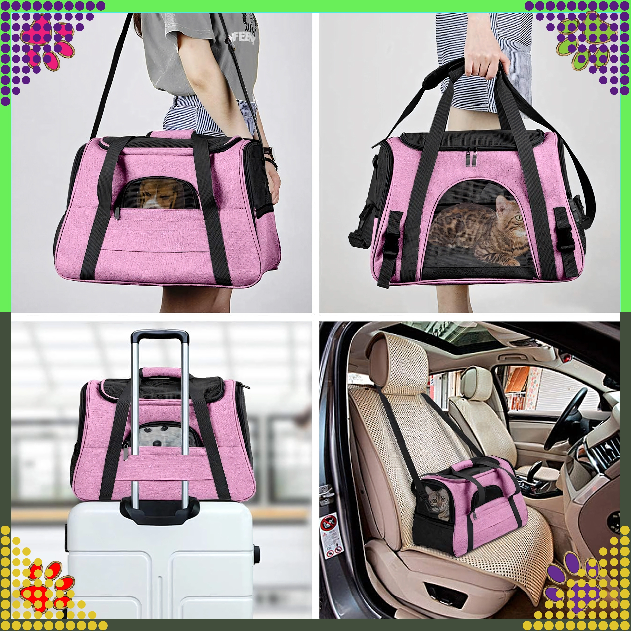 Den praktiske transporttaske til dyr kombinerer komfort, sikkerhed og nem vedligeholdelse. Takket være kvalitetspolyester er den modstandsdygtig over for pletter og skader, absorberer ikke ubehagelige lugte og bevarer sit udseende selv ved hyppig brug. Det rosa design vil glæde stilbevidste ejere og giver dyret et roligt rum under rejsen.