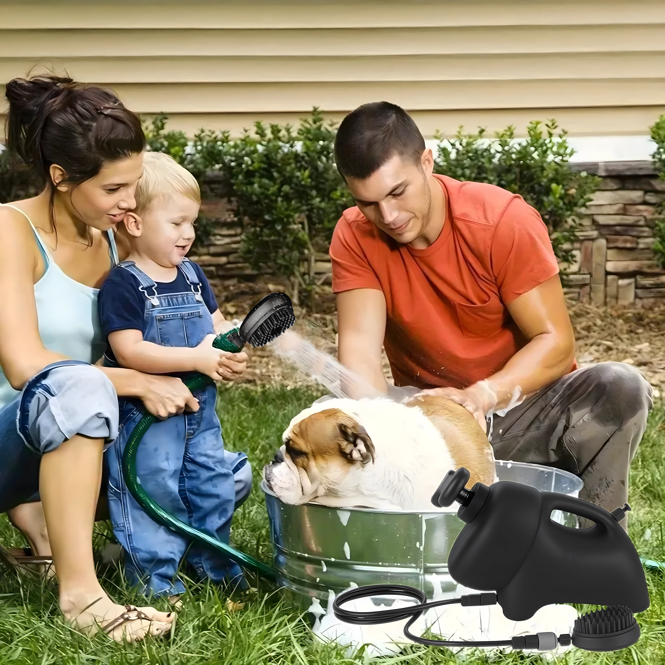 Den bærbare vasker til hunde og katte med 8 l kapacitet kombinerer bekvem udendørs vask med skånsom pelspleje. Det integrerede brusehoved med gummibørster forener afskylning og blid børstning, hvilket effektivt fjerner snavs og løs pels og samtidig giver en behagelig massage.