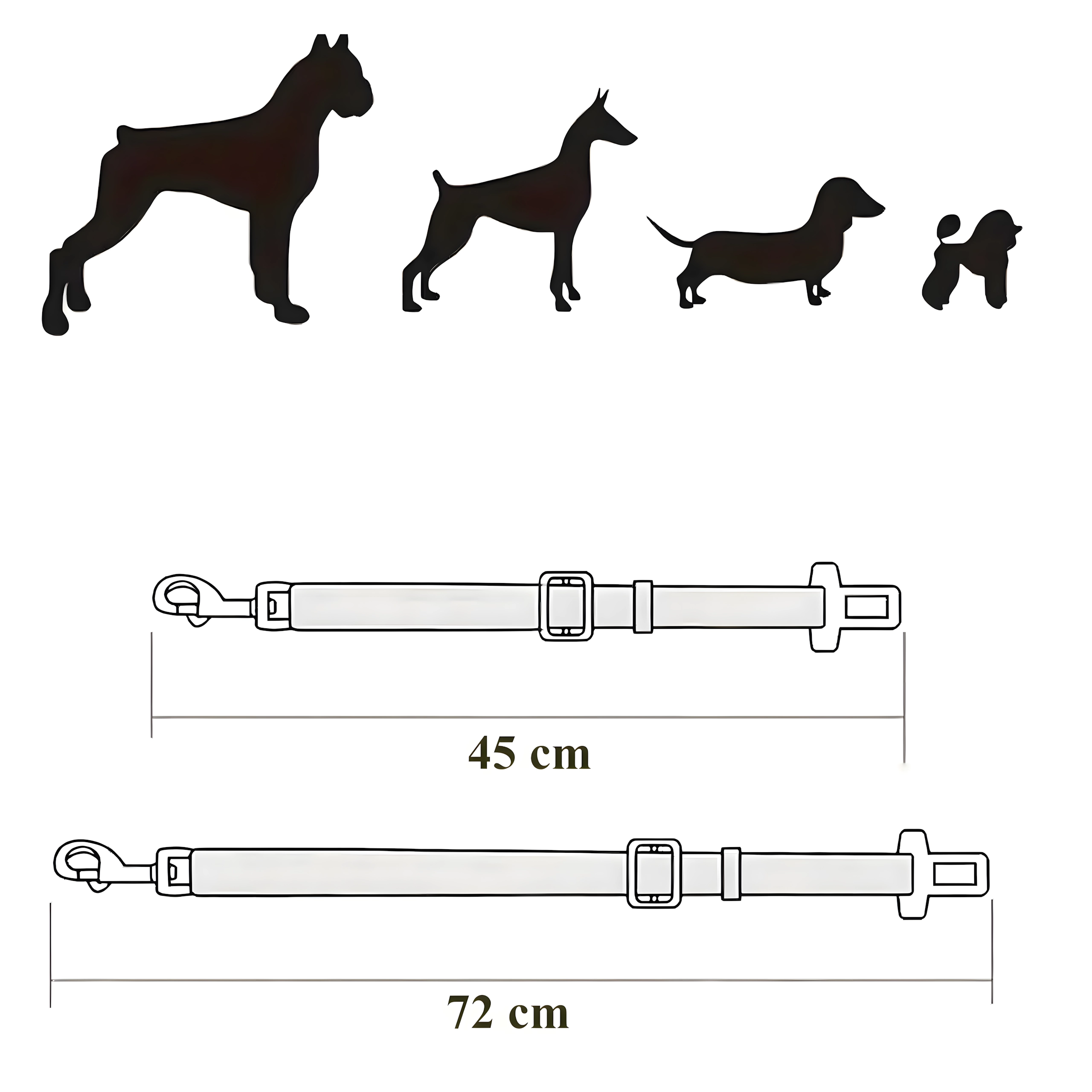 Bæltet er lavet af en stærk nylonrem og tilbyder trinløs længdejustering 45–72 cm for optimal frihed og komfort. Vi anbefaler at bruge det udelukkende sammen med en sele for maksimal sikkerhed og komfort under kørslen.
