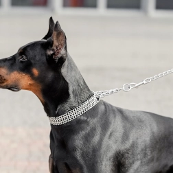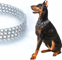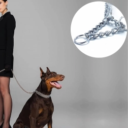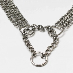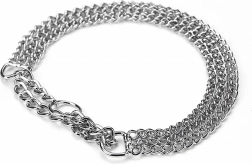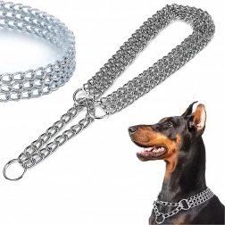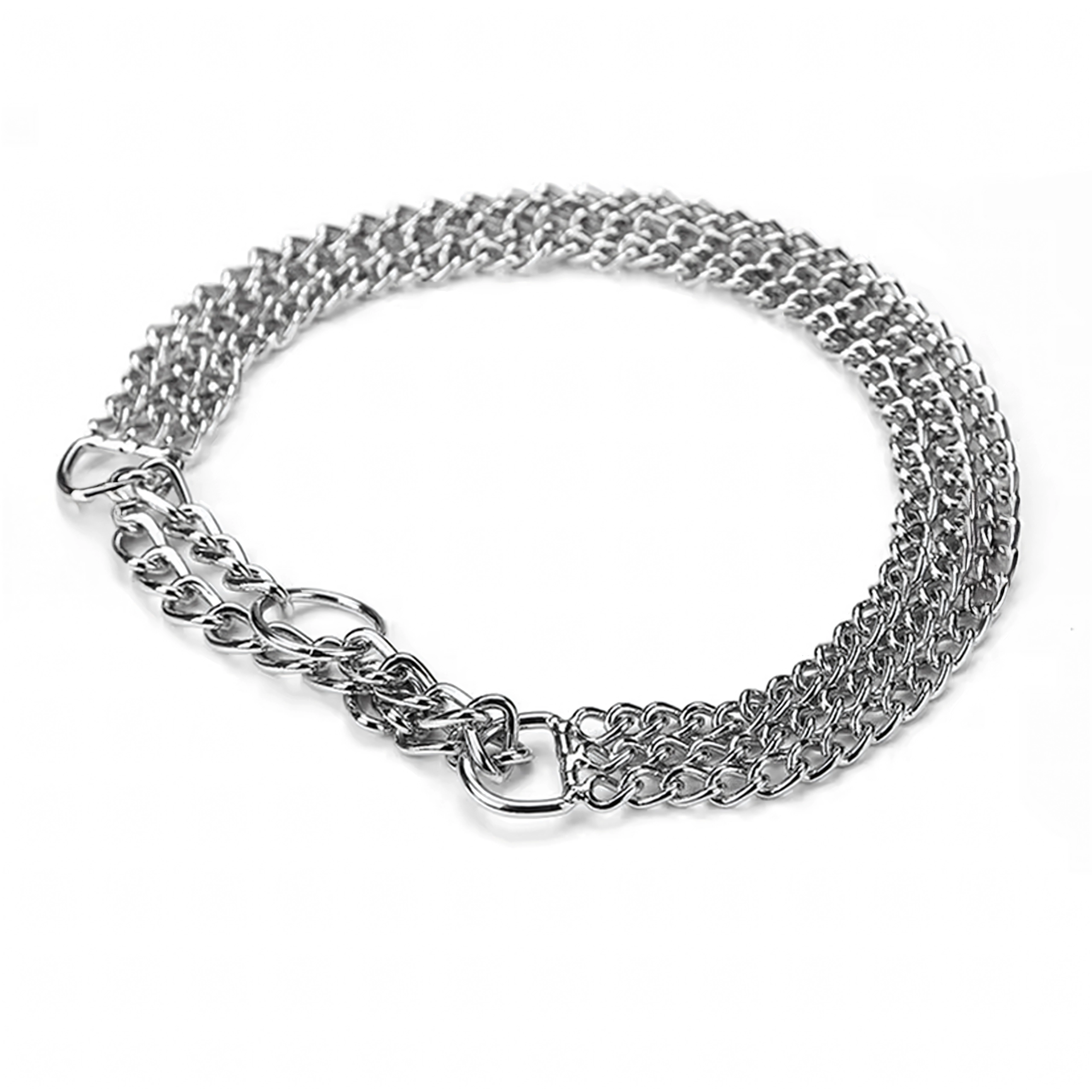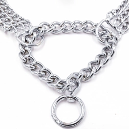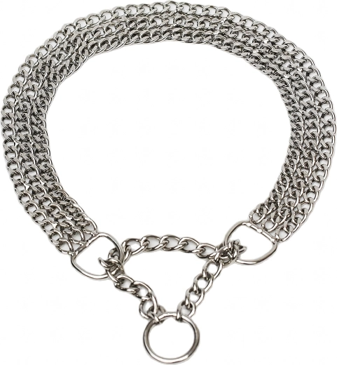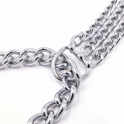 Dette kædehalsbånd med kvælerfunktion er lavet af kvalitets forkromet stål, som kendetegnes ved høj styrke, korrosionsbestandighed og en glat overflade for hundens komfort. Den tredobbelte kæde fordeler trykket jævnt og giver præcis og følsom kontrol under træning.