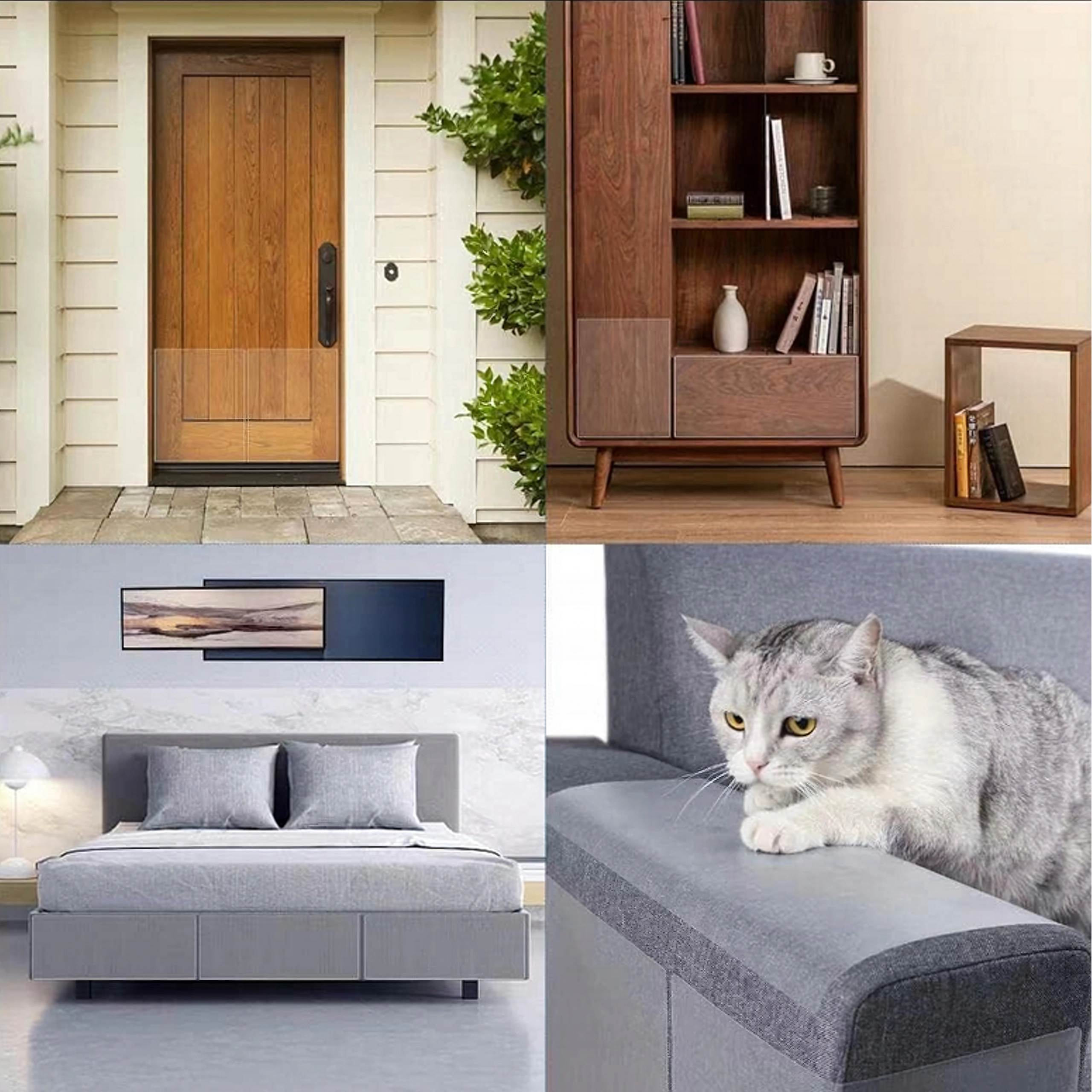 Takket være det fleksible materiale klæber den perfekt til både plane og let buede flader. Den beskytter polstrede møbler, døre, sengekanter og møbler i træ, samtidig med at indretningens udseende bevares. Filmen er holdbar, vaskbar og sidder godt ved korrekt montering, men kan stadig fjernes skånsomt og genbruges.