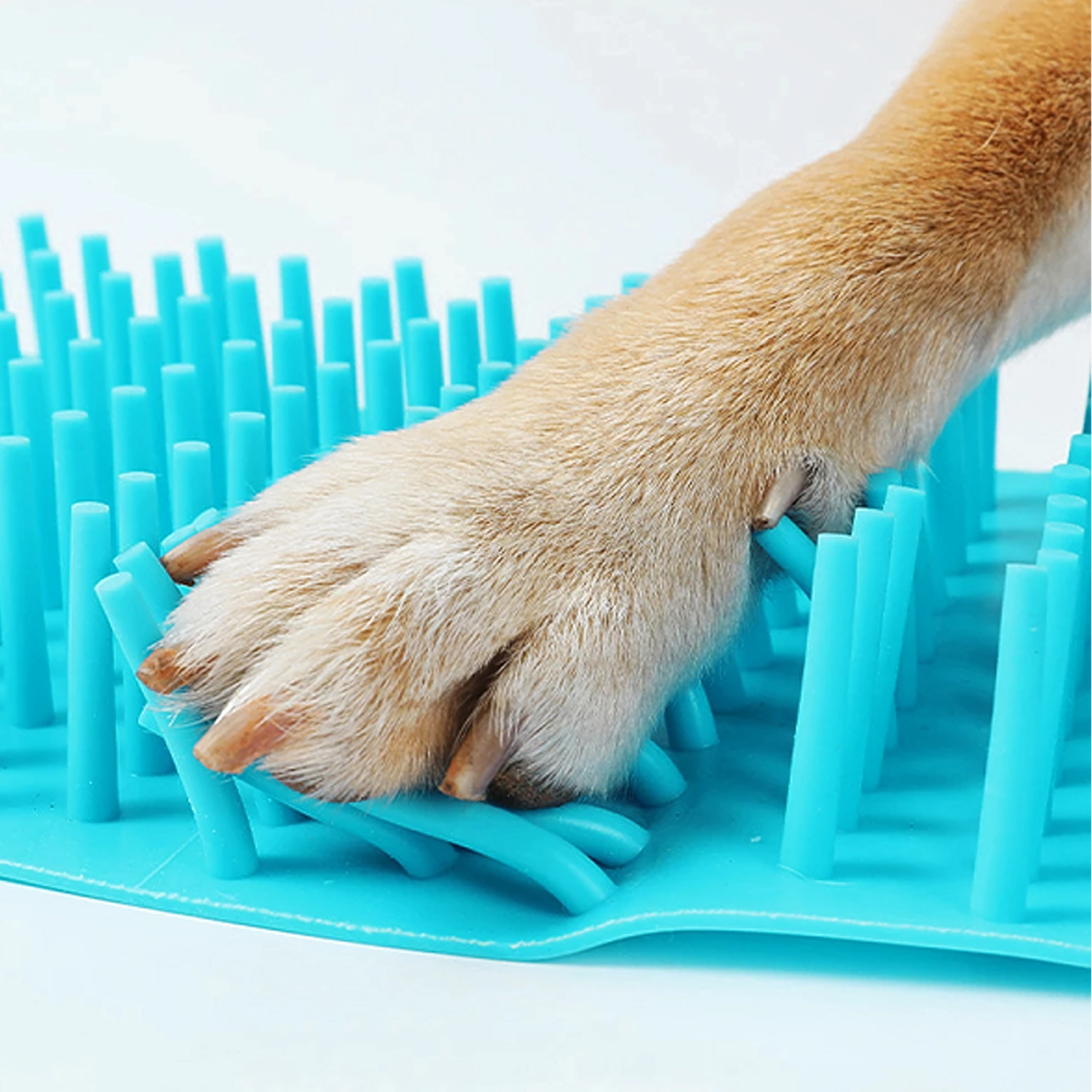 Tætte, bløde silikonerbørster løsner nænsomt mudder og sand fra trædepuderne og mellem tæerne uden irritation.