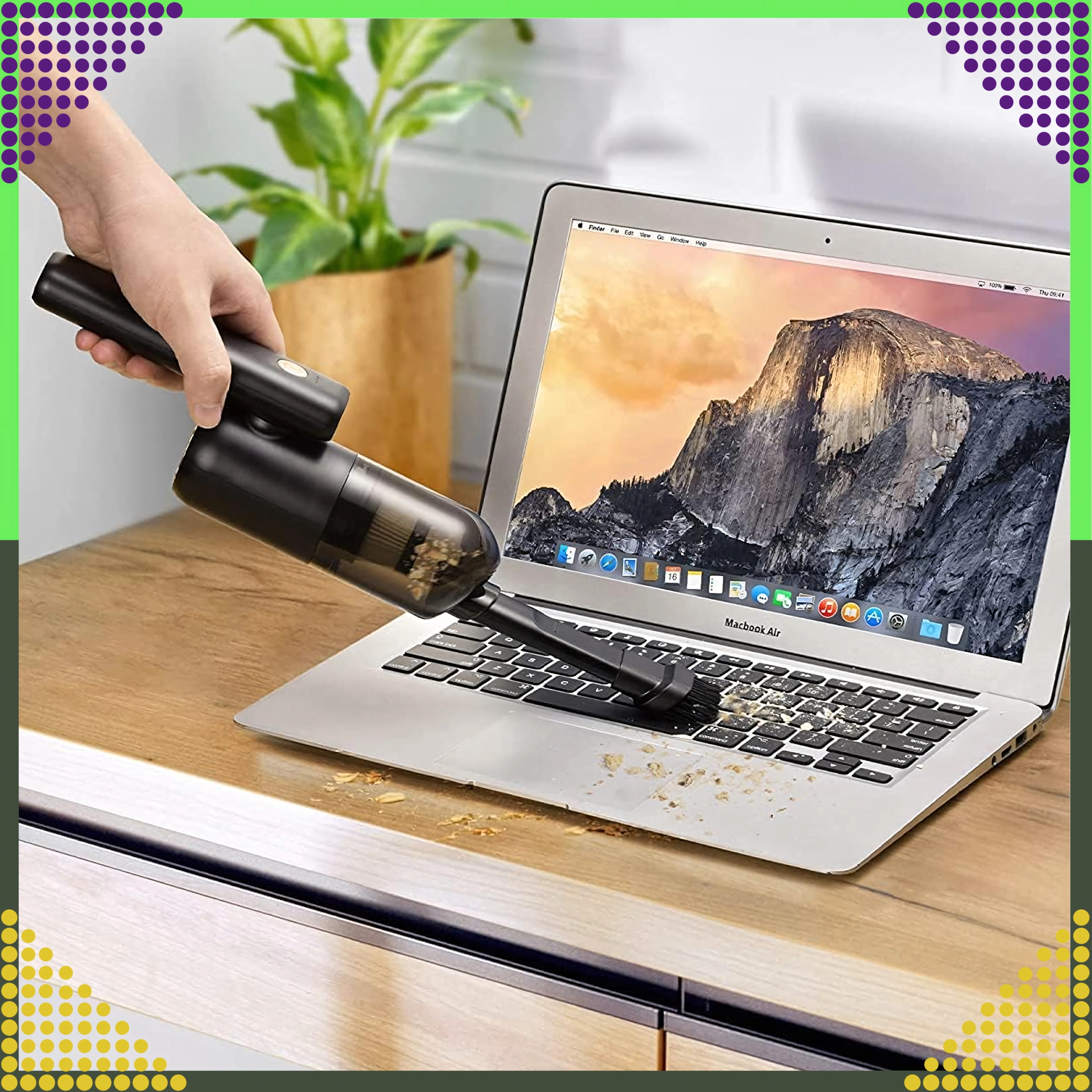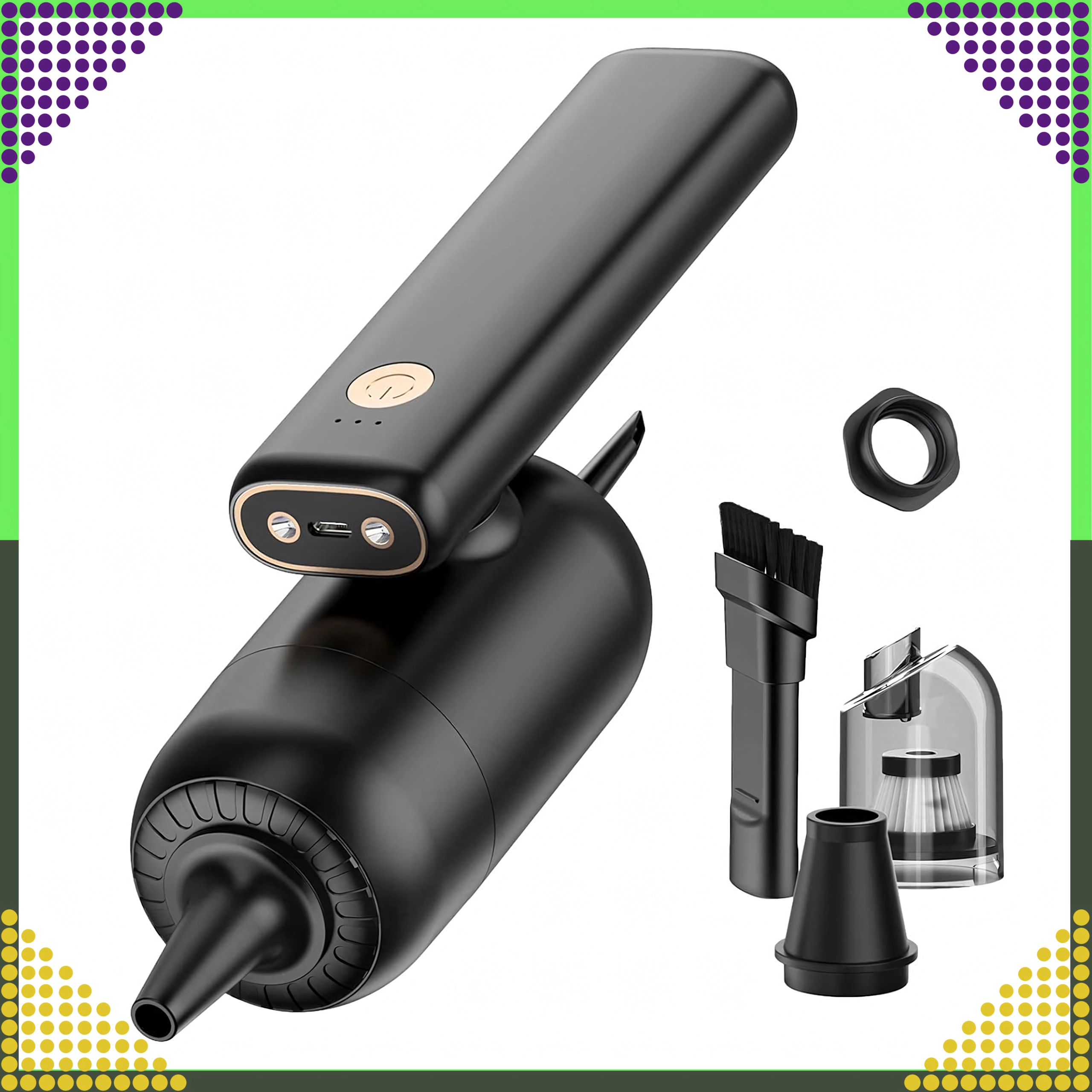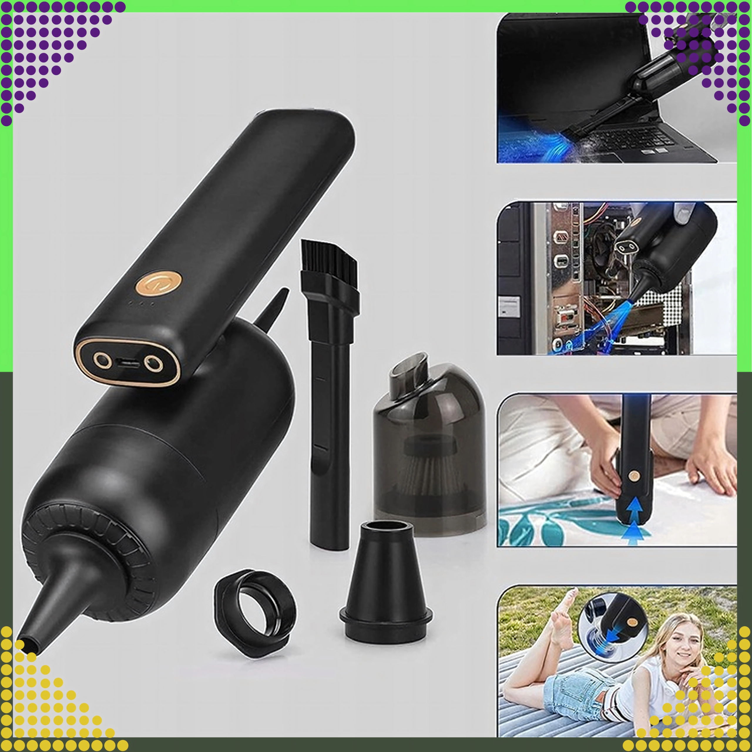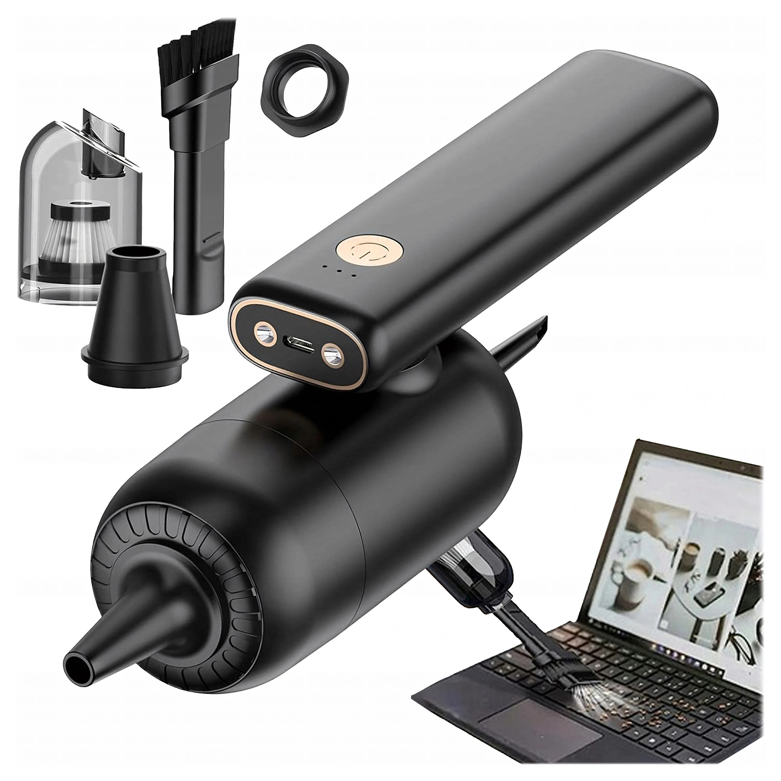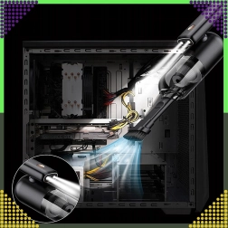 Med børstetilbehør og LED‑lys fjerner den støv fra tastaturer, PC‑kabinetter og smalle fuger uden risiko for at beskadige komponenter.