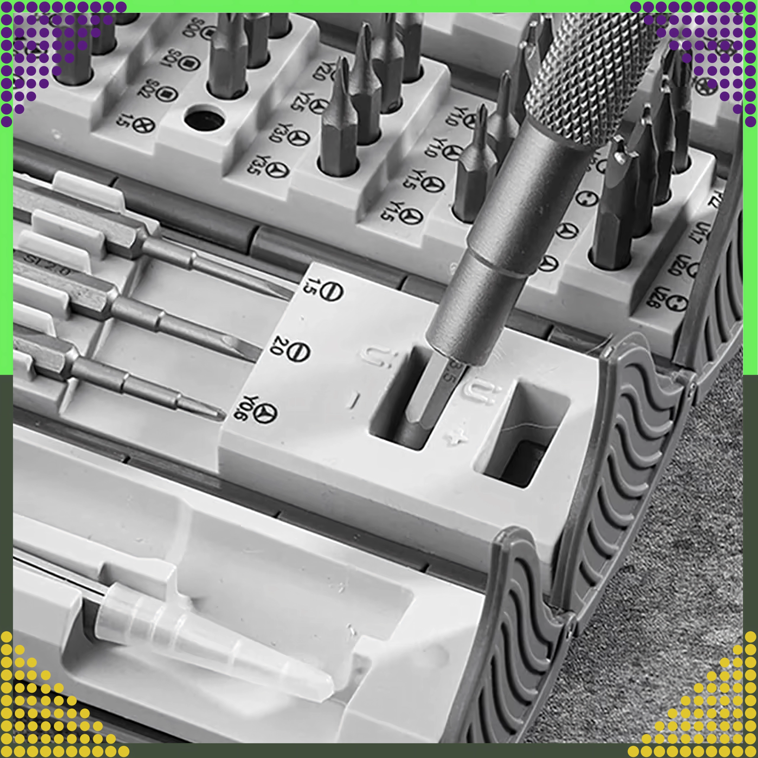 Det brede udvalg af bits og tilbehør dækker de fleste opgaver ved service af elektronik (telefoner, bærbare computere, spilkonsoller), finmontage (ure, briller, kameraer) samt almindeligt gør-det-selv-arbejde i hjemmet. Der medfølger et praktisk etui til overskuelig opbevaring og nem transport.