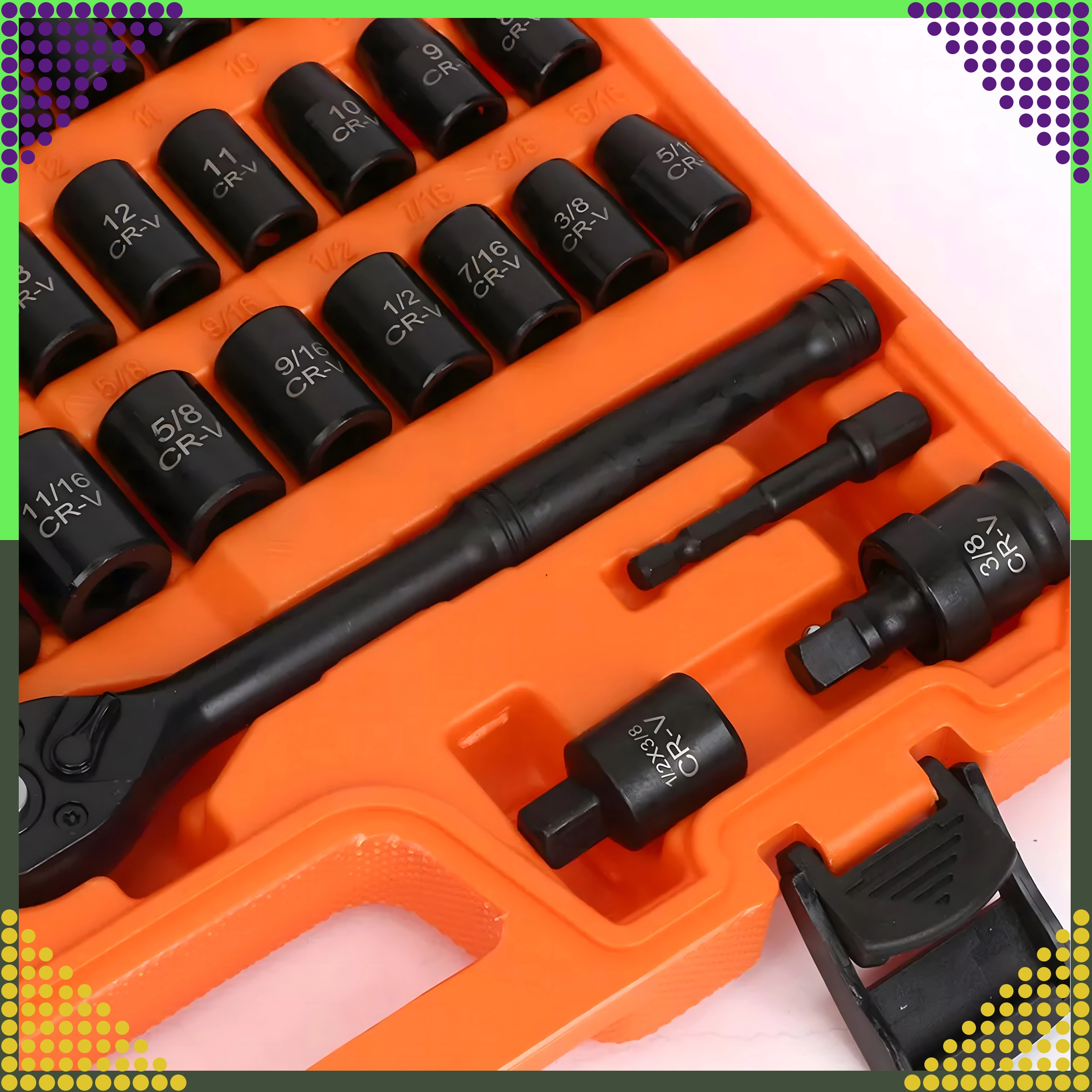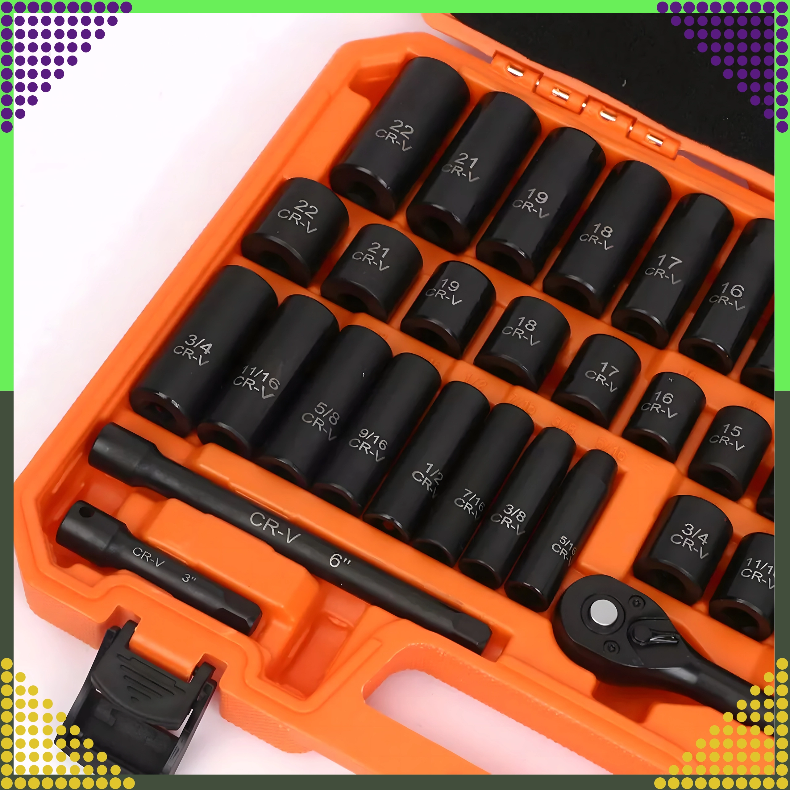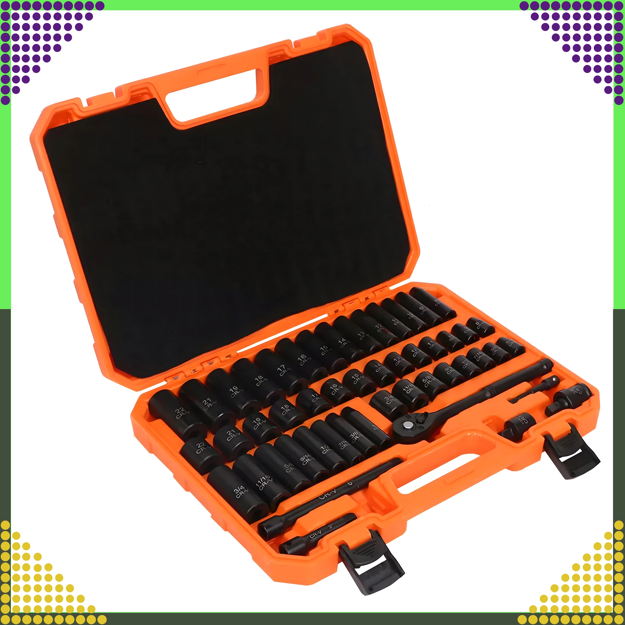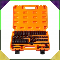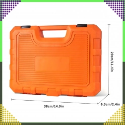 Overskueligt arrangerede metriske og SAE-toppe, skralde, forlængere og adaptere i en holdbar orange kuffert for nem transport.