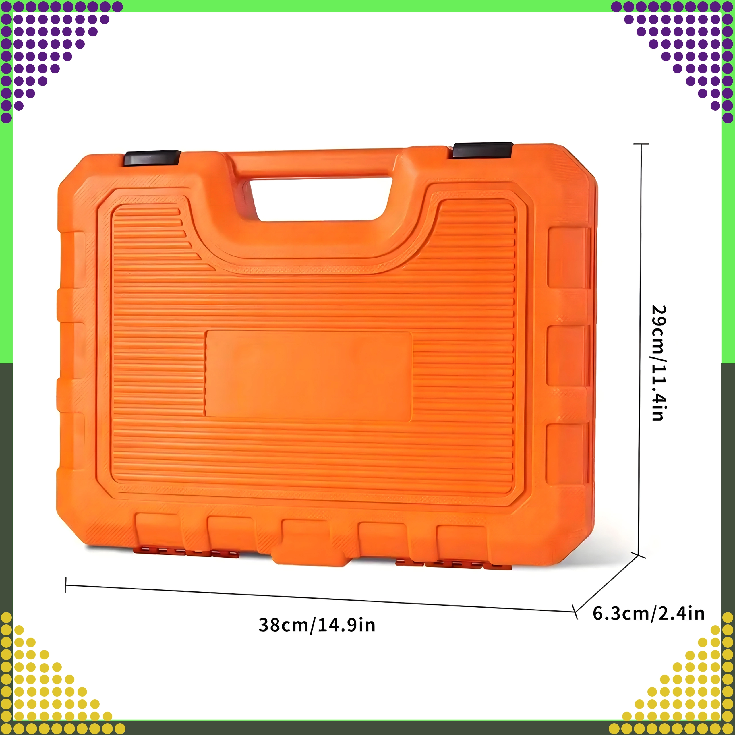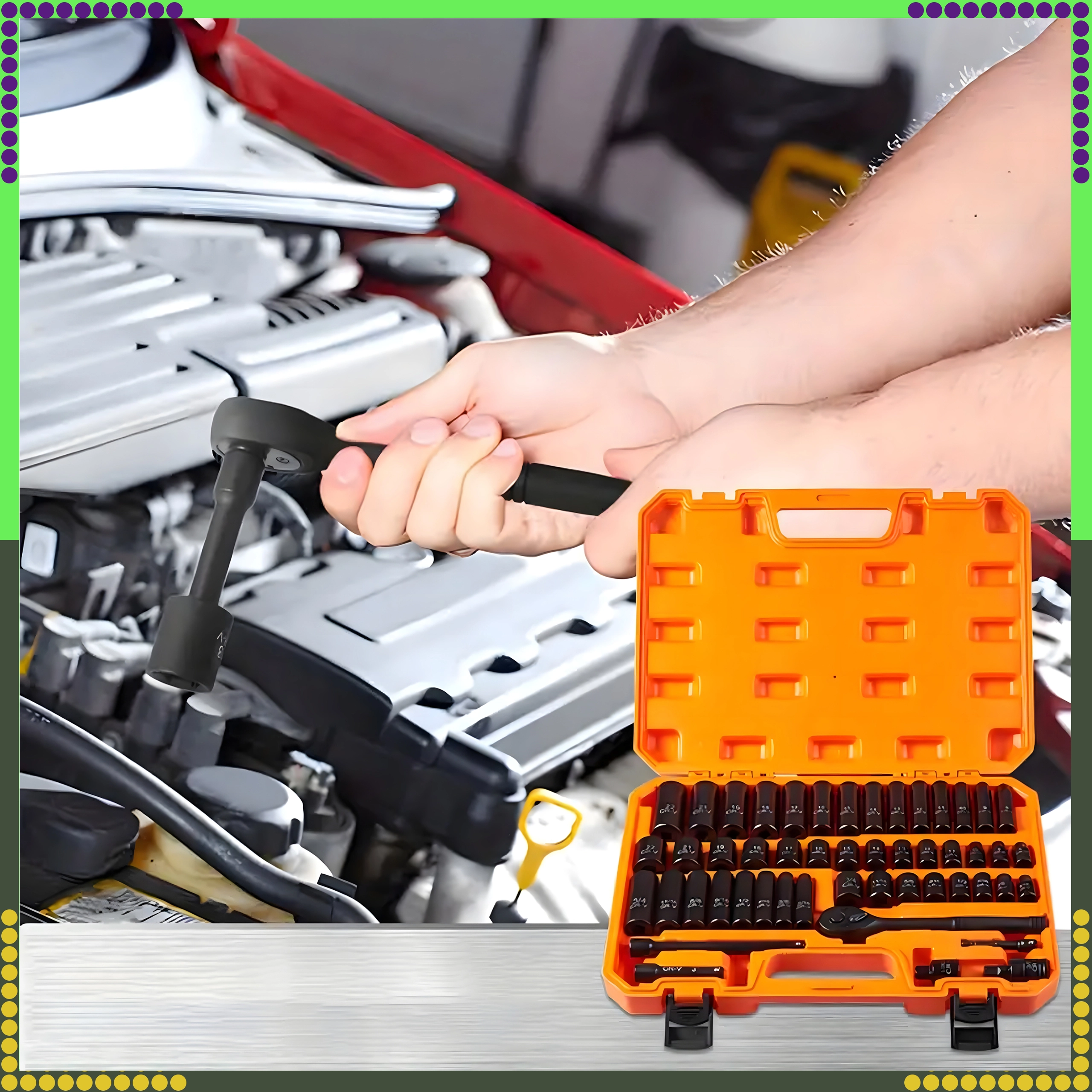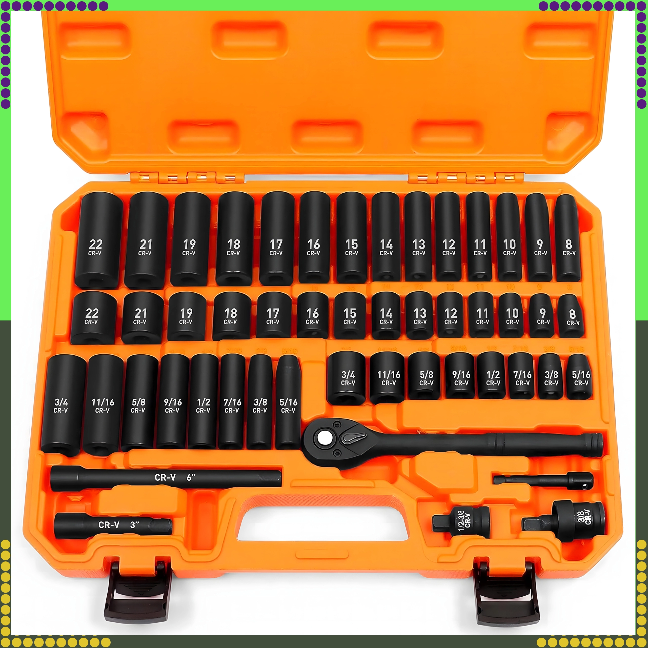 Overskueligt arrangerede metriske og SAE-toppe, skralde, forlængere og adaptere i en holdbar orange kuffert for nem transport.