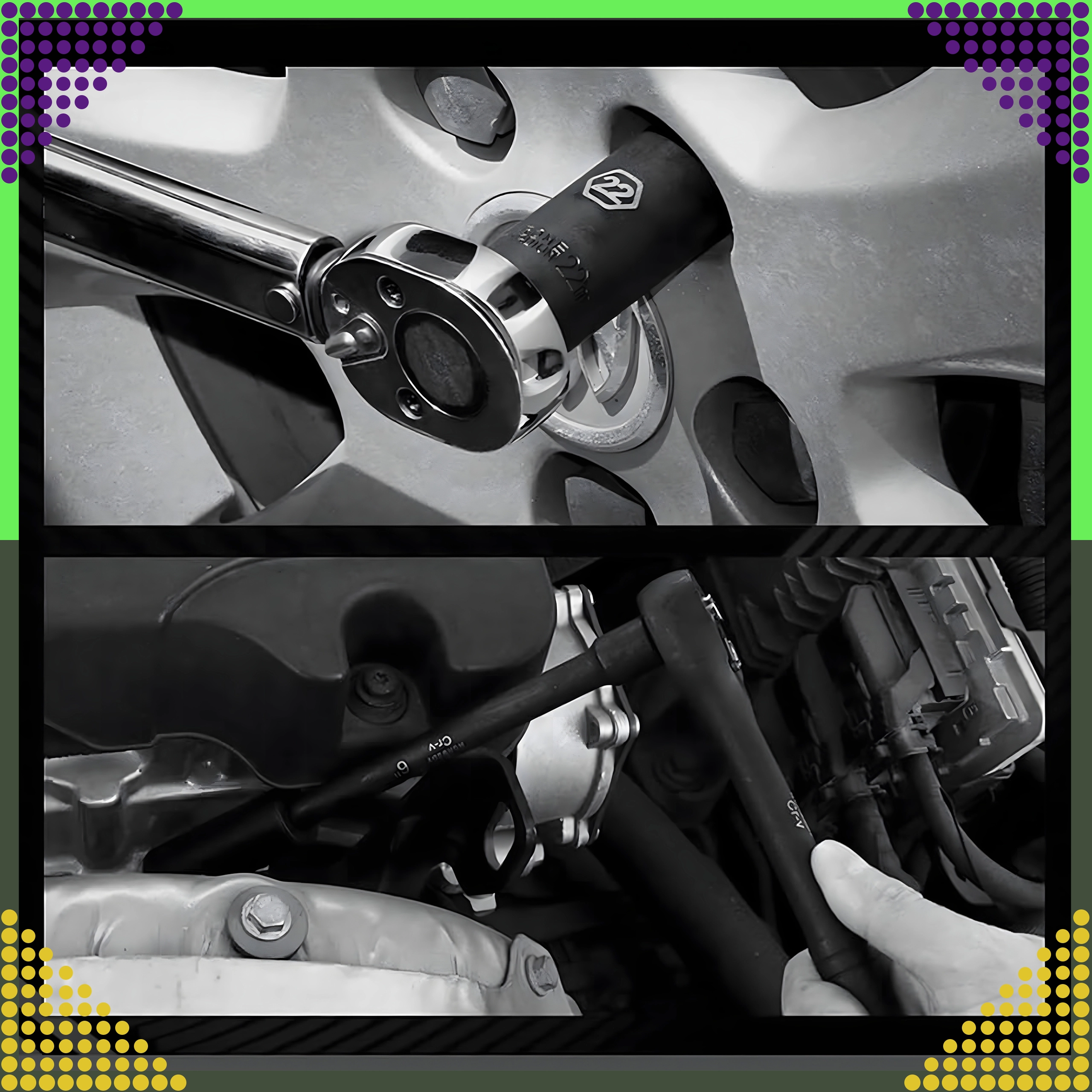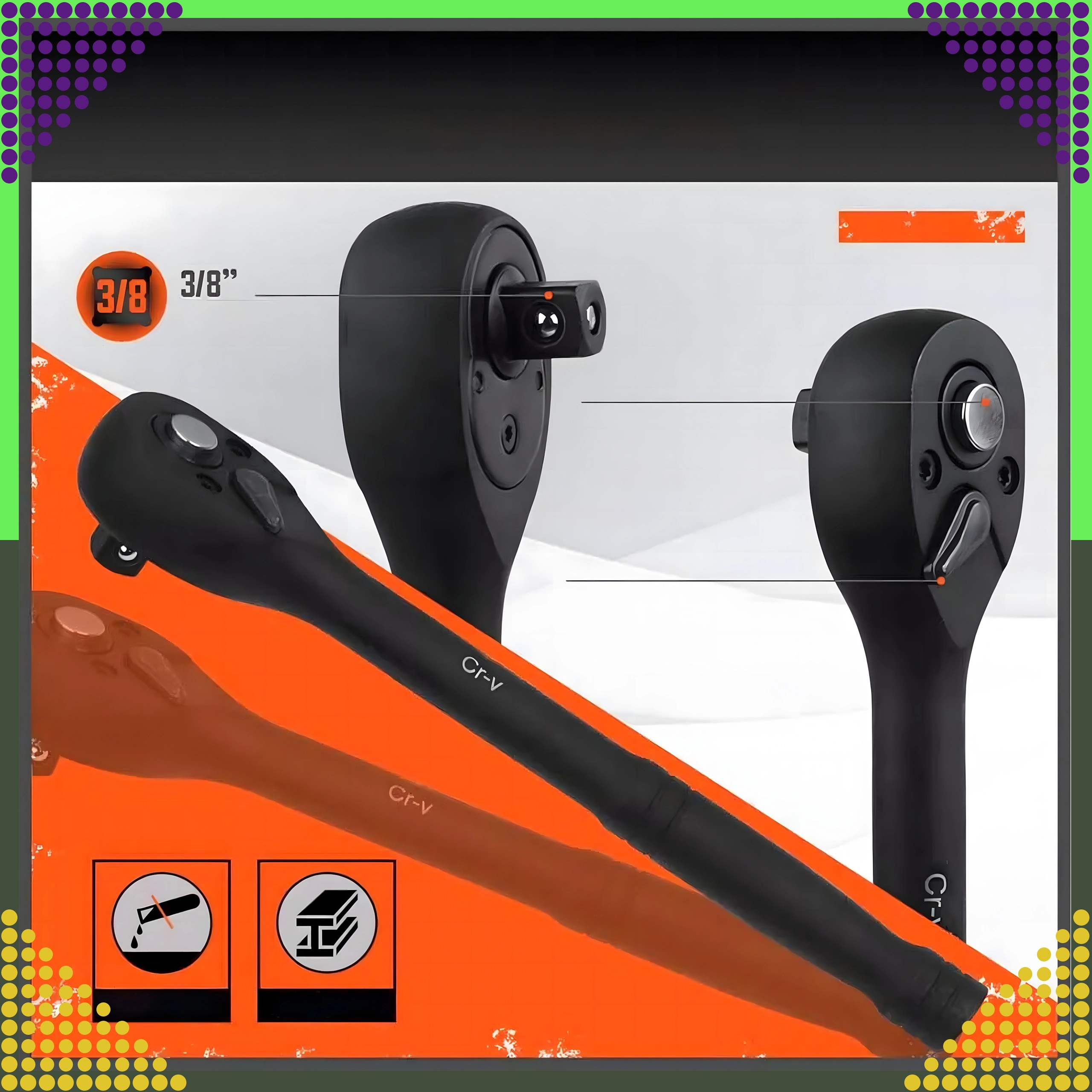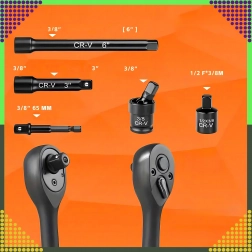 Skralde 3/8'' og tilbehør muliggør bekvem til- og afspænding selv i motorrum eller andre snævre områder.