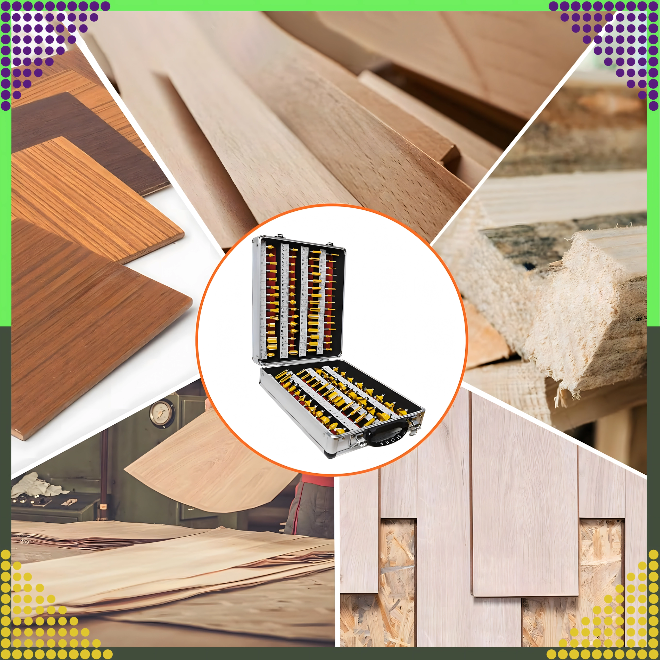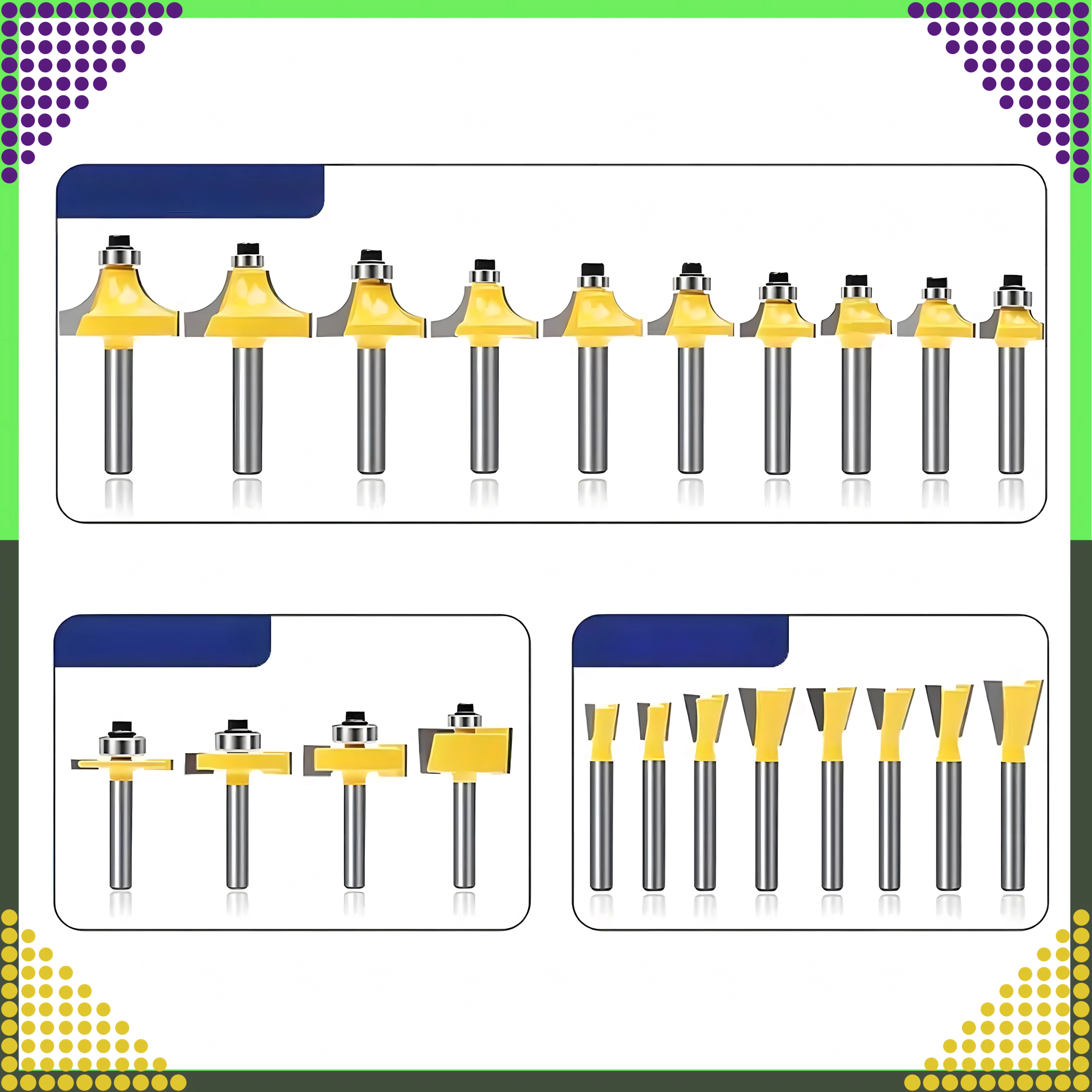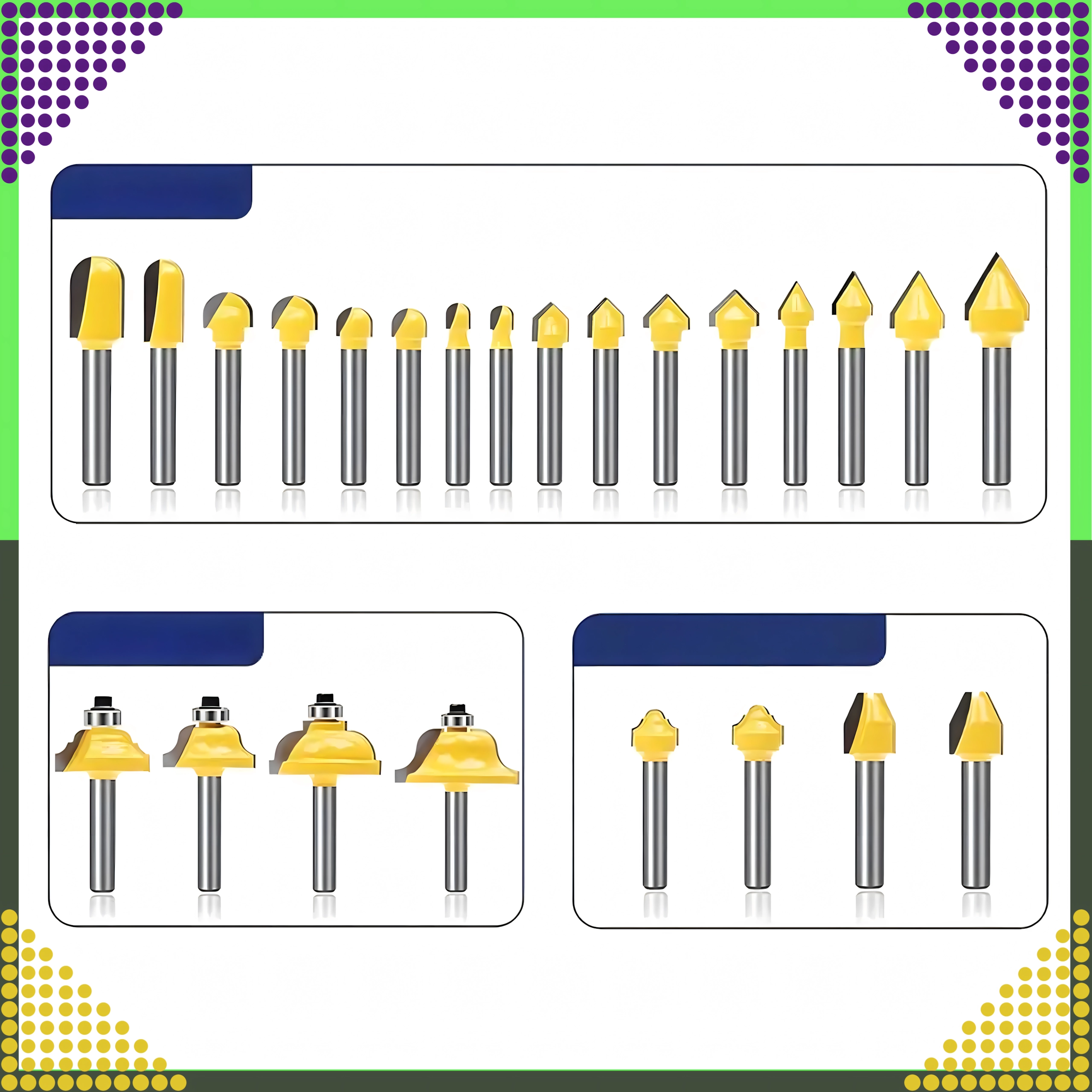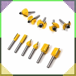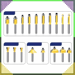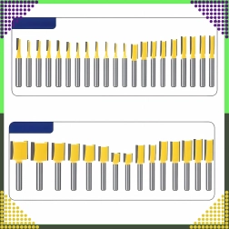 Sættet omfatter lige, afrundings-, affasnings-, kopierings- og andre profiler til kanter, notfræsning og formgivning af træ.