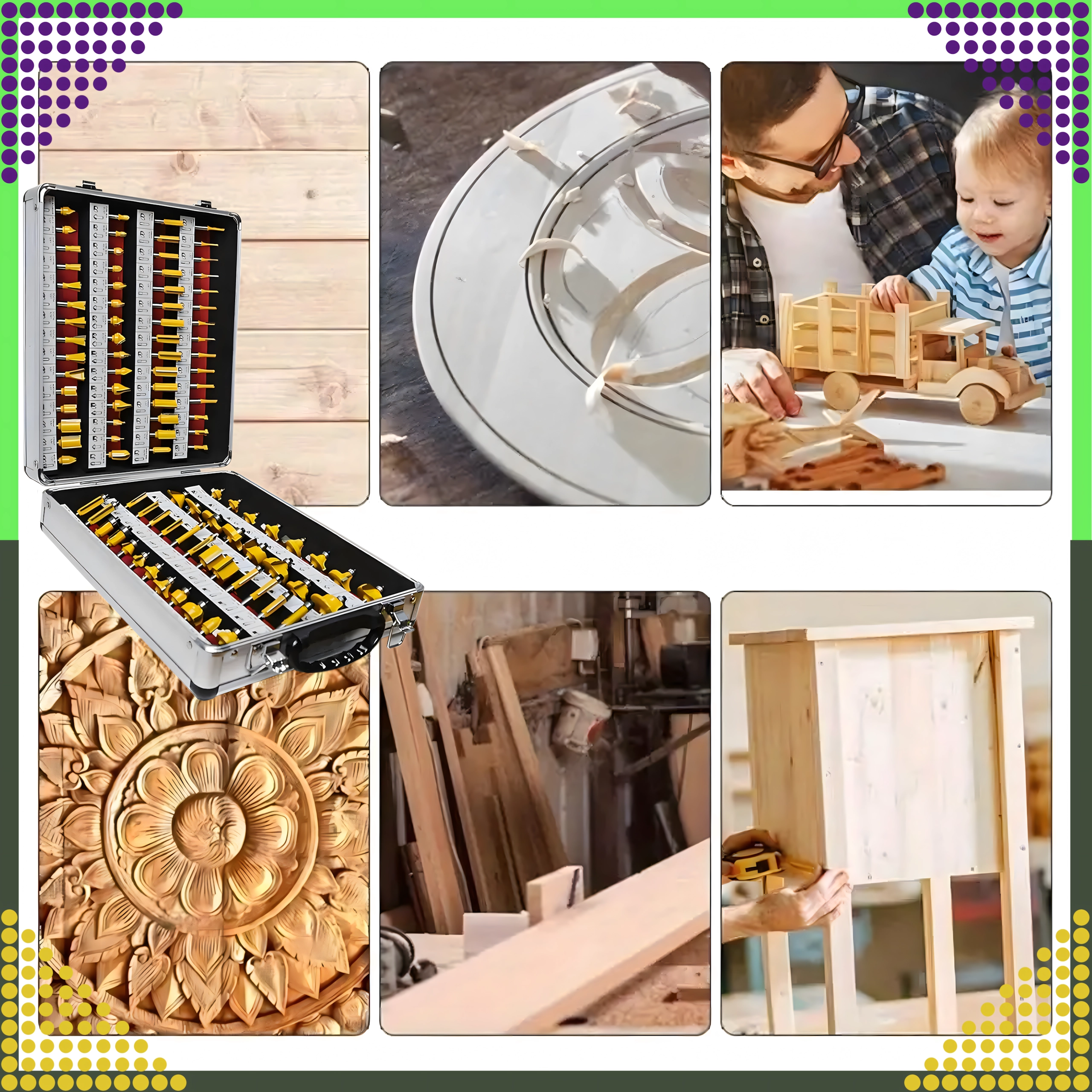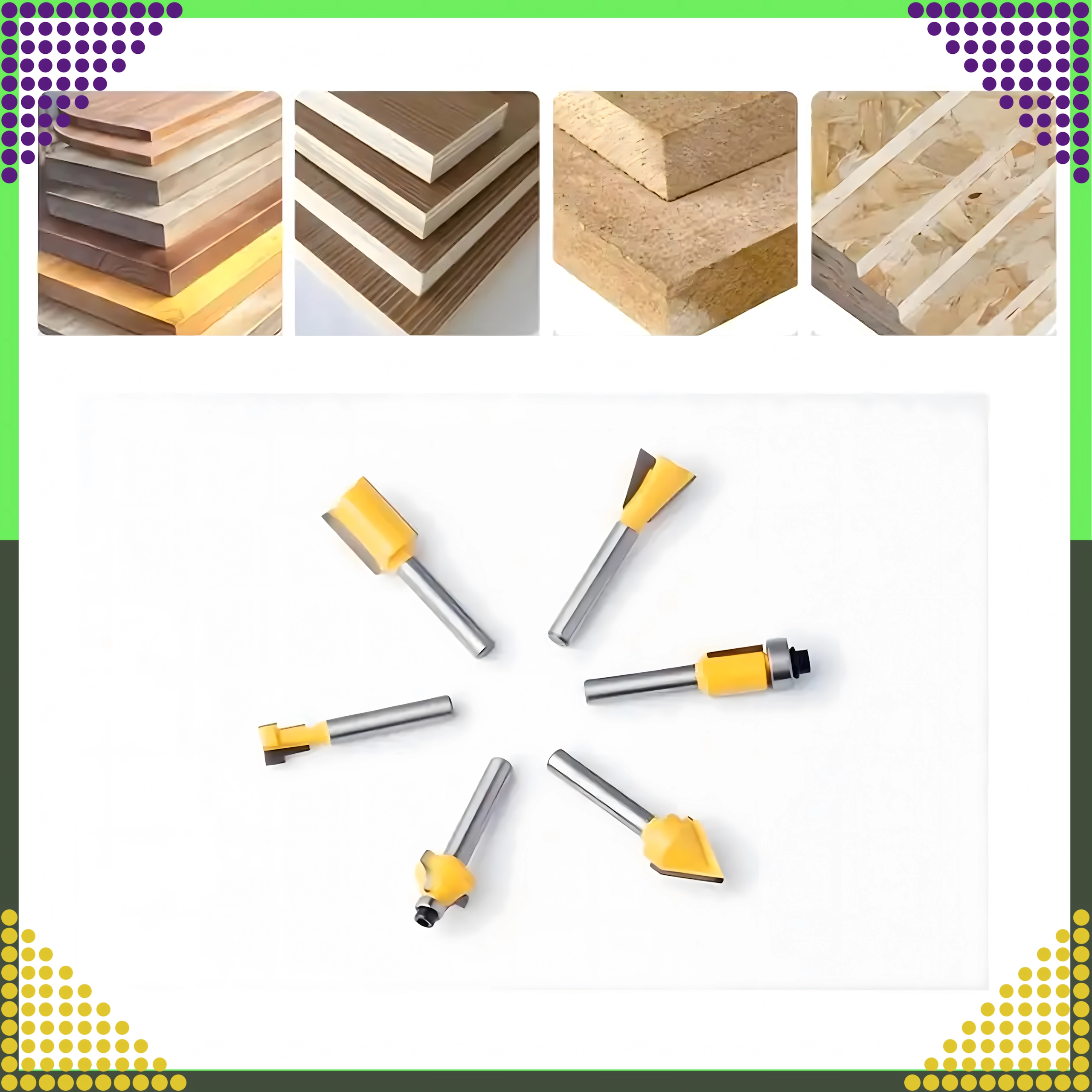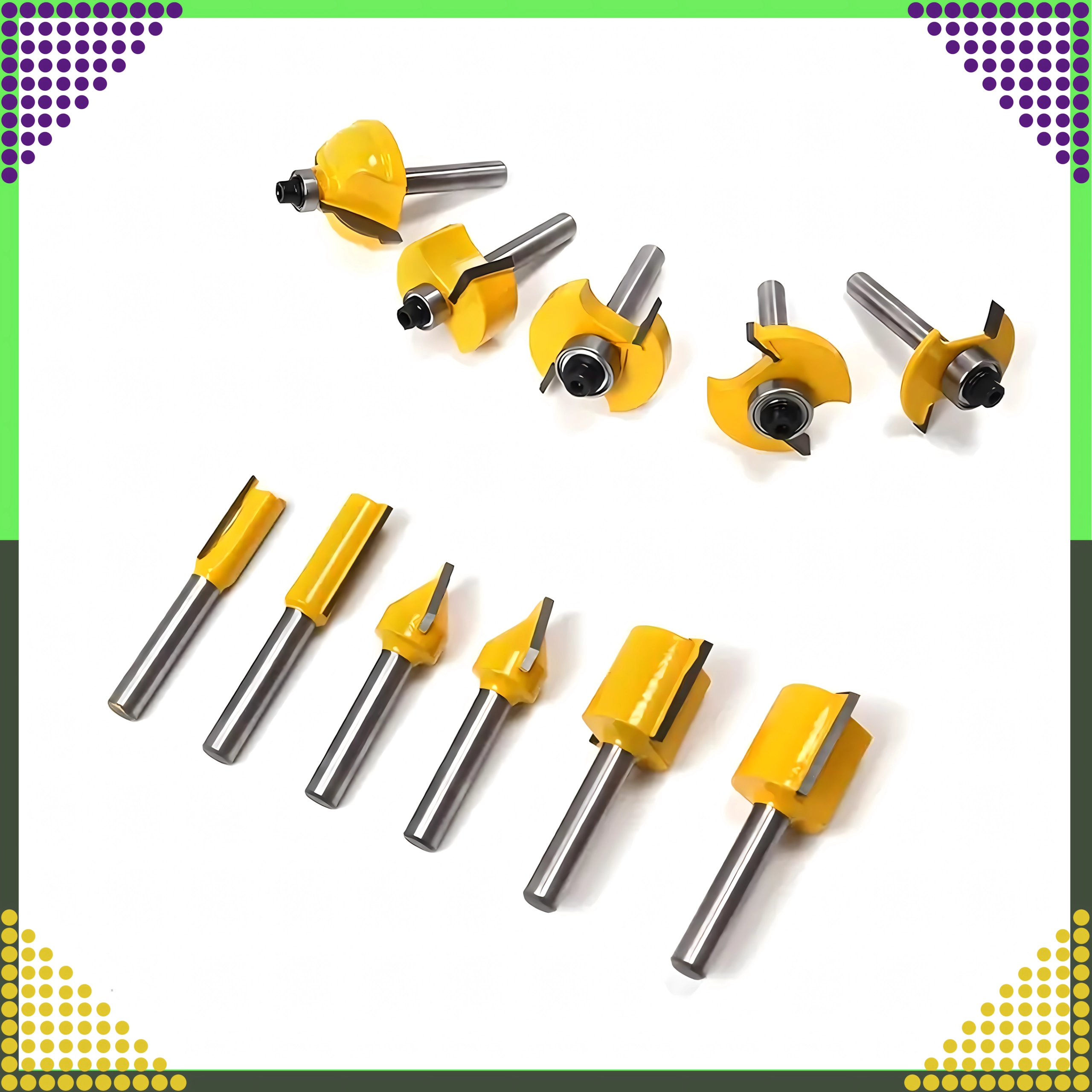 Sættet omfatter lige, afrundings-, affasnings-, kopierings- og andre profiler til kanter, notfræsning og formgivning af træ.