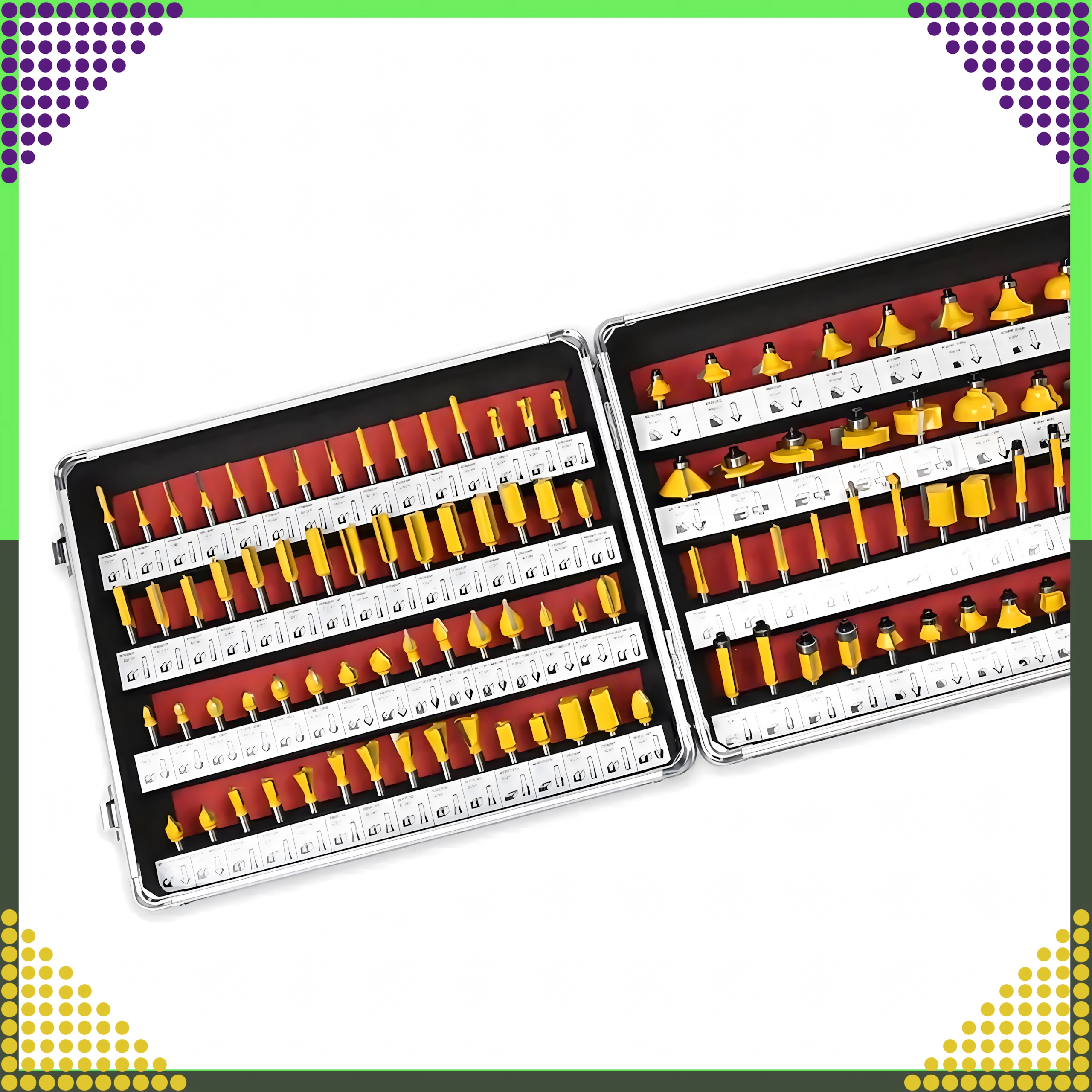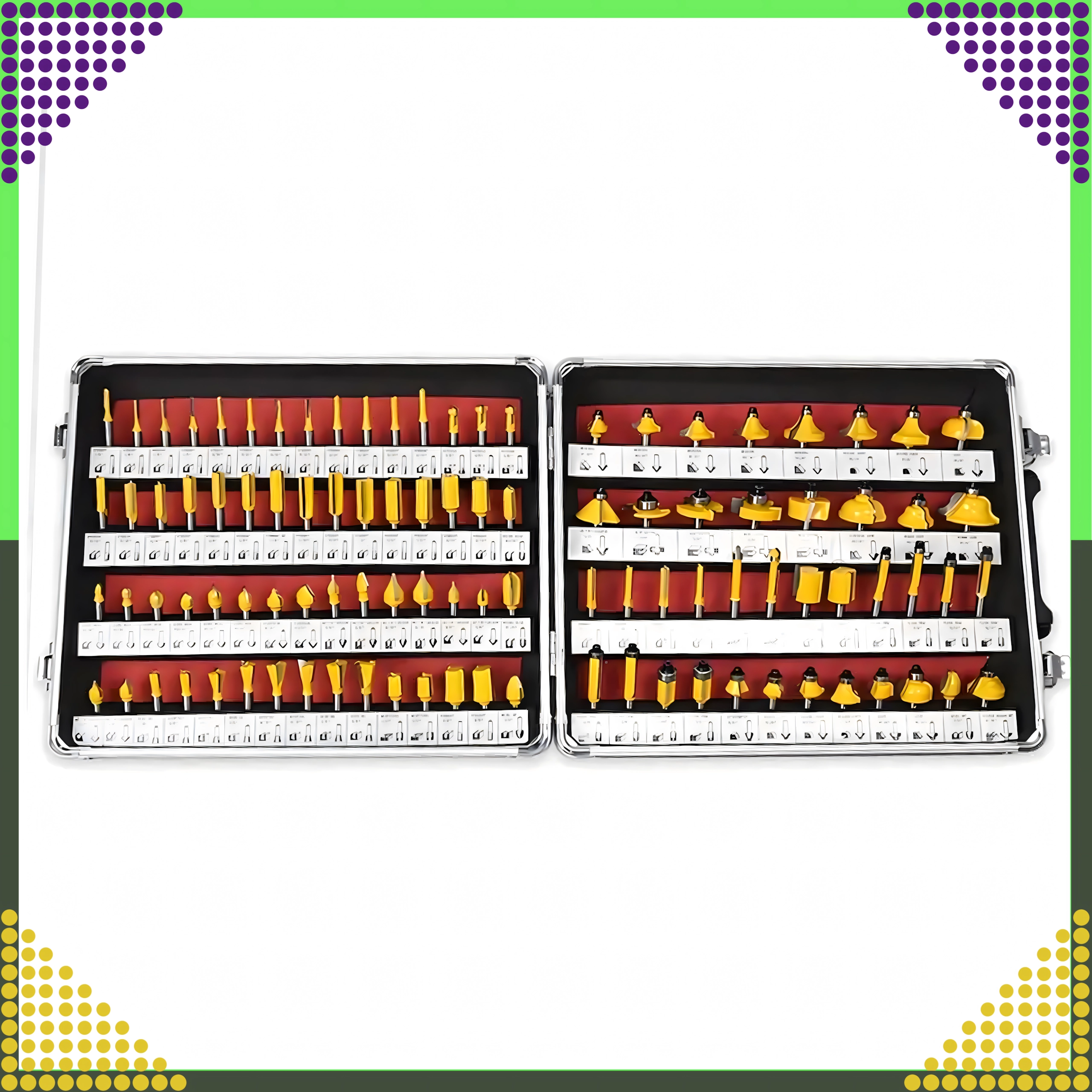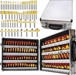 Komplet sæt med 100 profilerede træfræsere med 1/4" (6,35 mm) skaft i en praktisk aluminiumskuffert. Ideel til professionelle og hobbybrugere. Tilbyder et bredt udvalg af profiler til kanter, notfræsning, affasning og afrunding. Carbidskær for rene snit og lang levetid, overskuelig mærkning for hurtig udvælgelse.