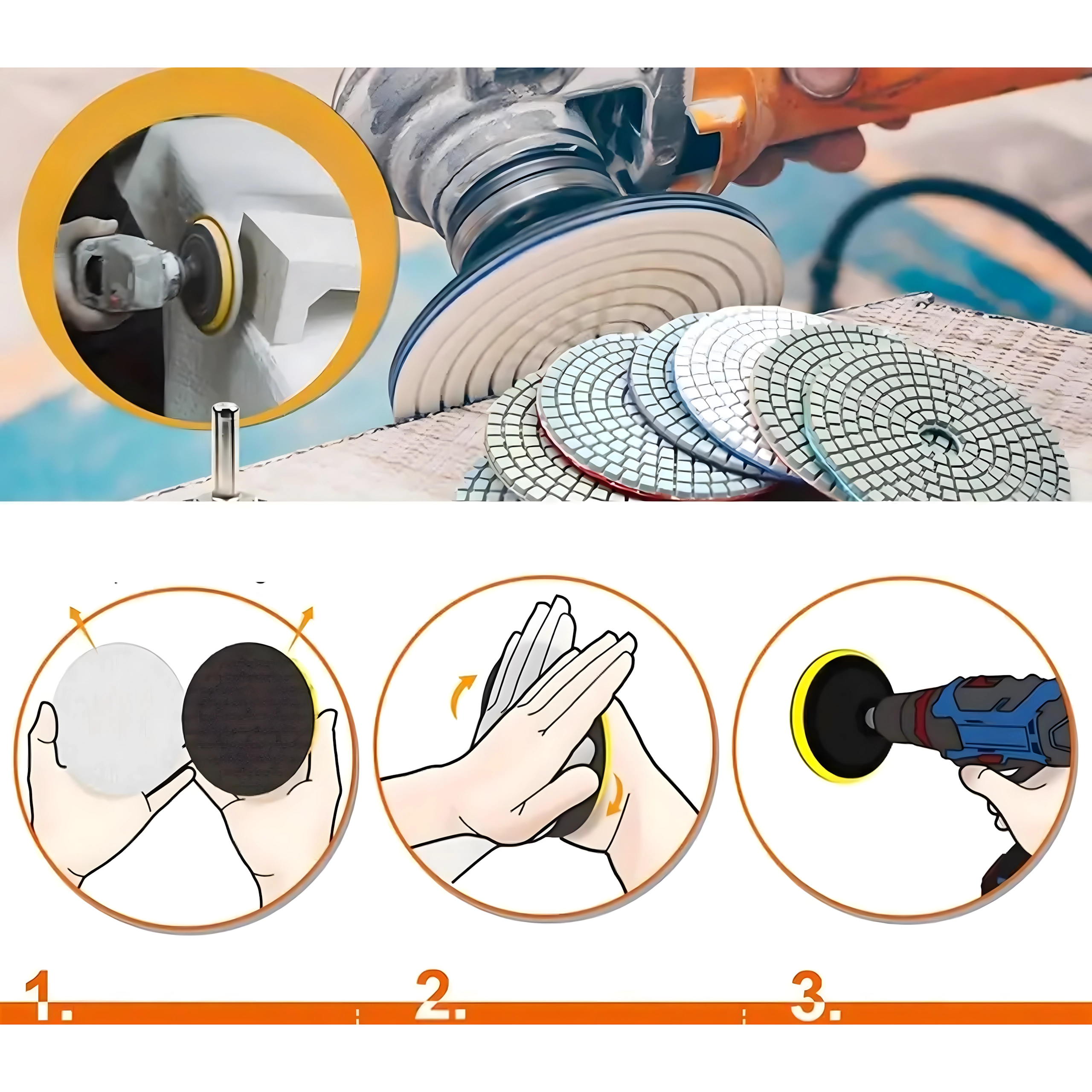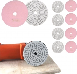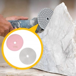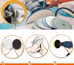Egnede materialer: gres, keramik, natursten, granit, marmor og andre hårde overflader. Velcro sikrer hurtig montering og udskiftning af skiver på bagskiver og kompatible slibere/polermaskiner. Arbejde vådt og tørt øger alsidigheden og forbedrer slutresultatet.