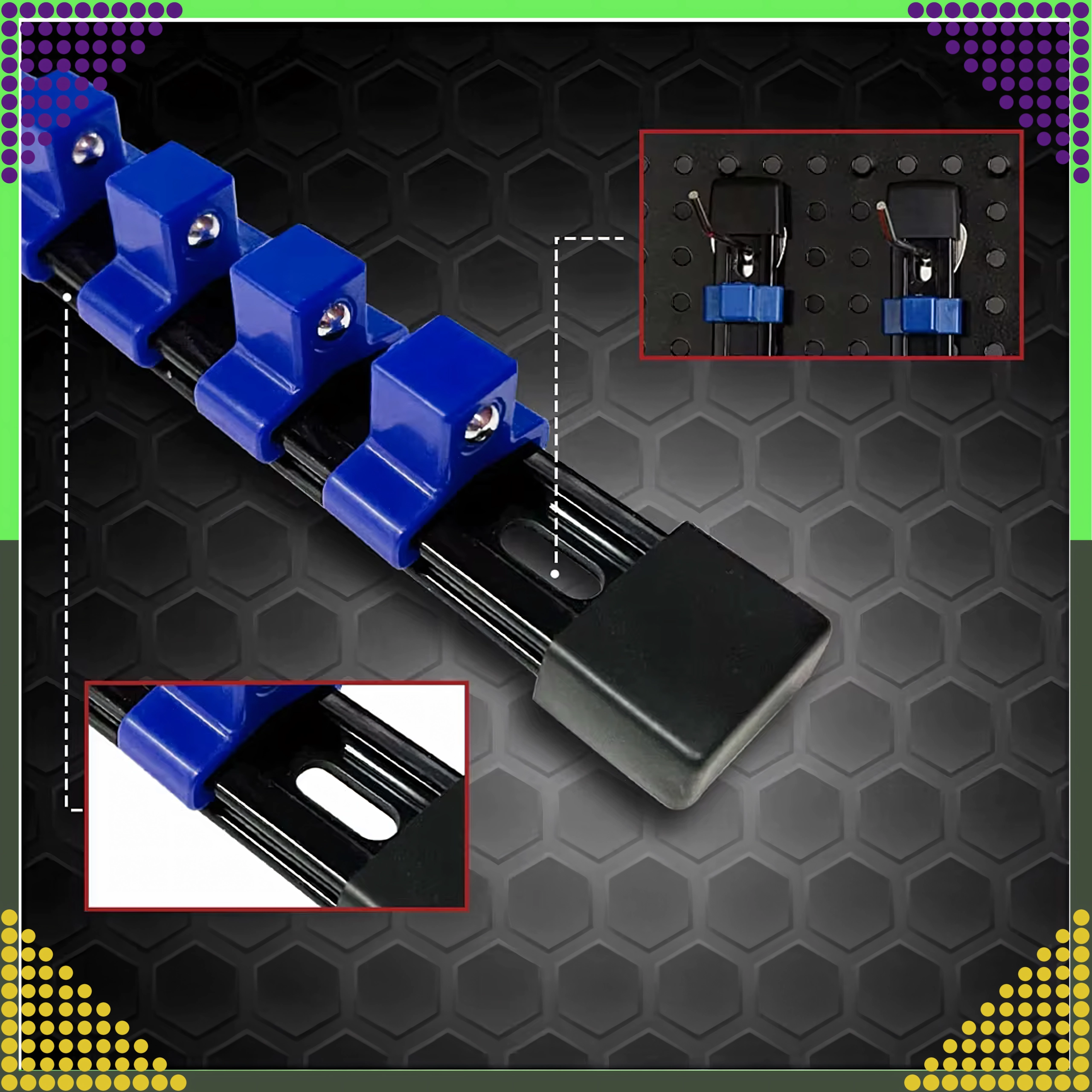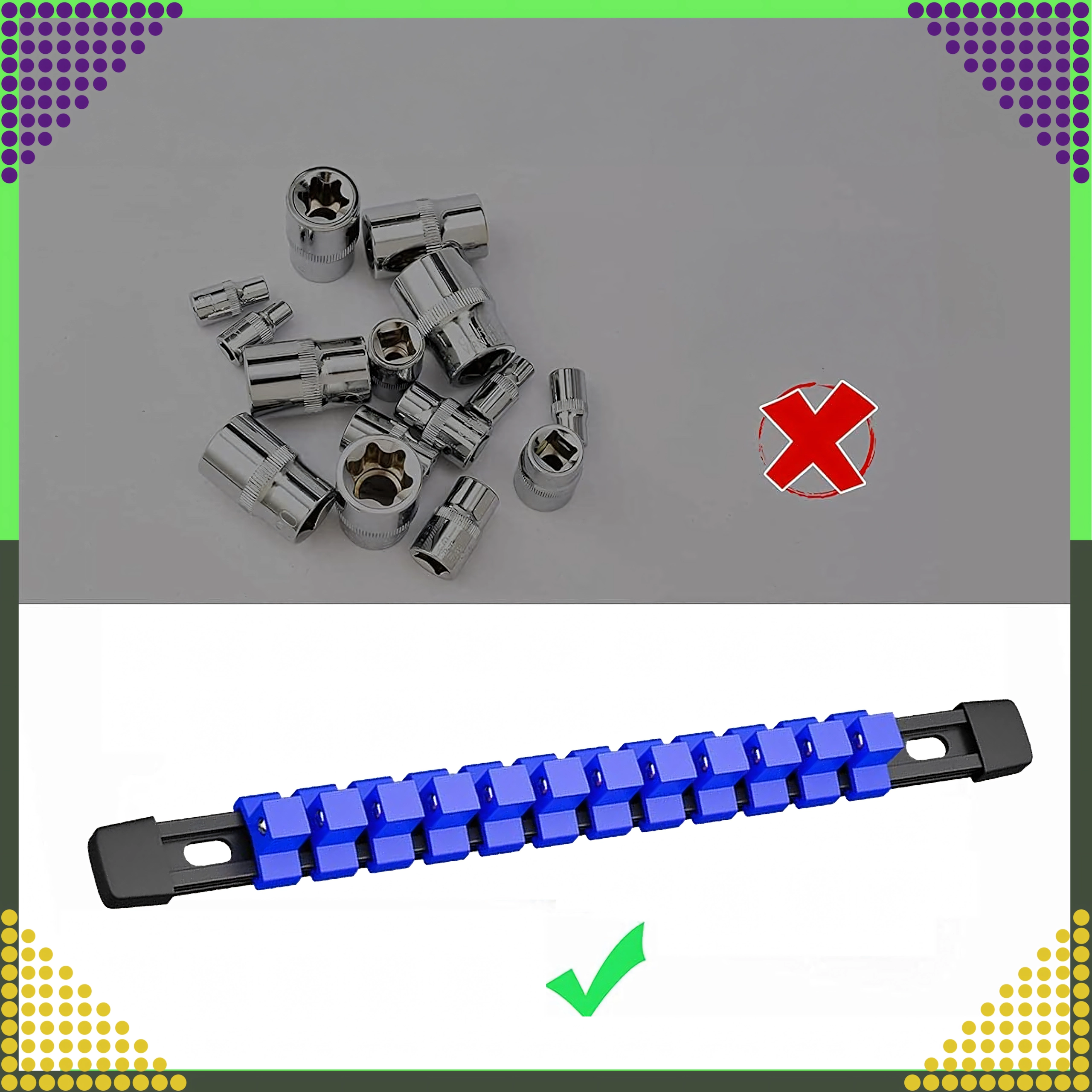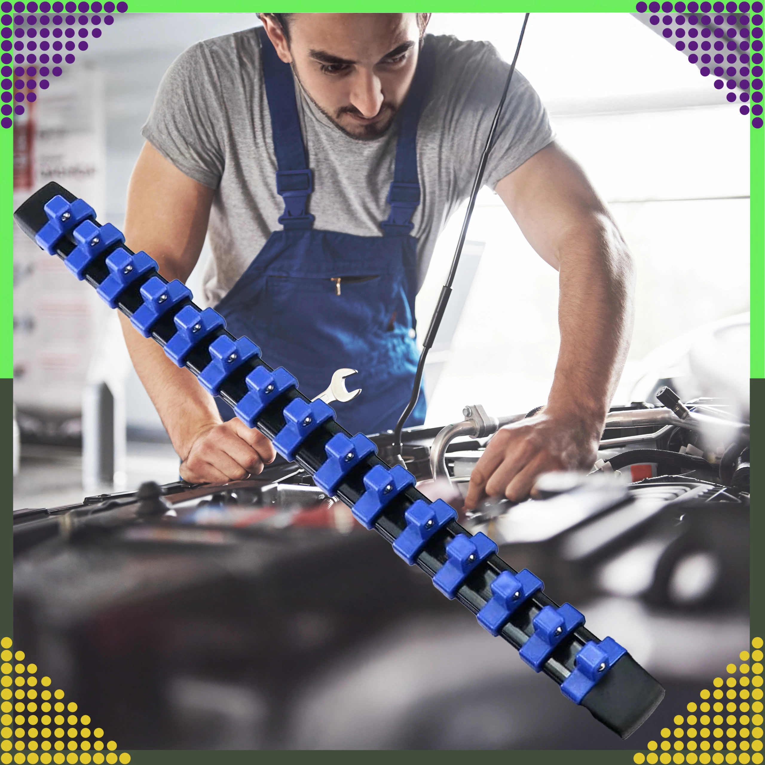 Organisatoren er ideel til mekanikere, gør-det-selv-folk og serviceteknikere, der kræver hurtig orientering og pålidelig fastgørelse af værktøjet. De justerbare klips gør det nemt at ændre afstanden efter toppenes størrelse.