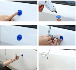 Du skal blot lime den valgte tap på bulen, koble pulleren på og trække jævnt, indtil pladen vender tilbage til sin oprindelige form. Reparationen er ikke-invasiv, hurtig og uden risiko for lakskader. Ideel til døre, skærme, tærskler og kofangere.