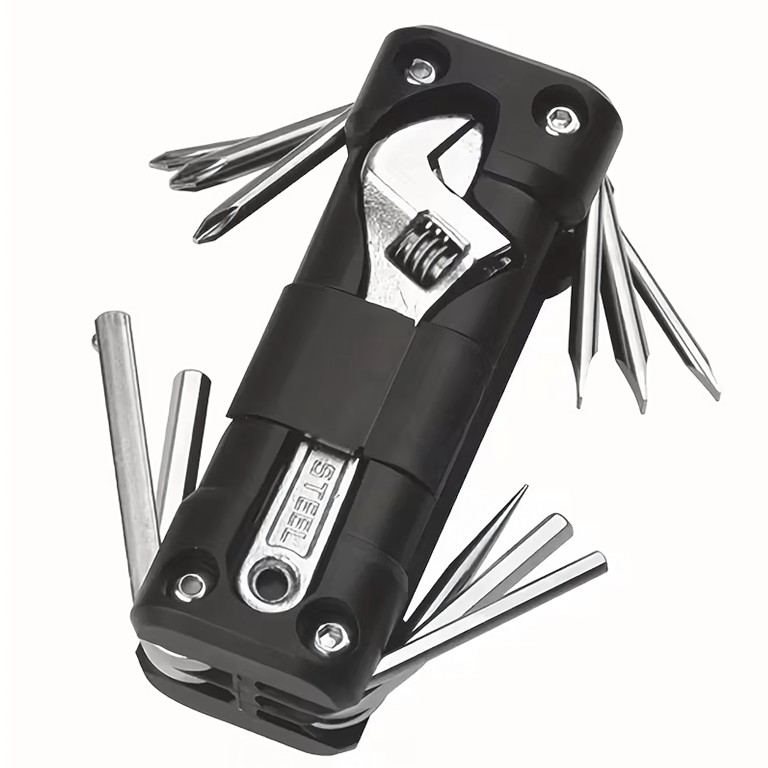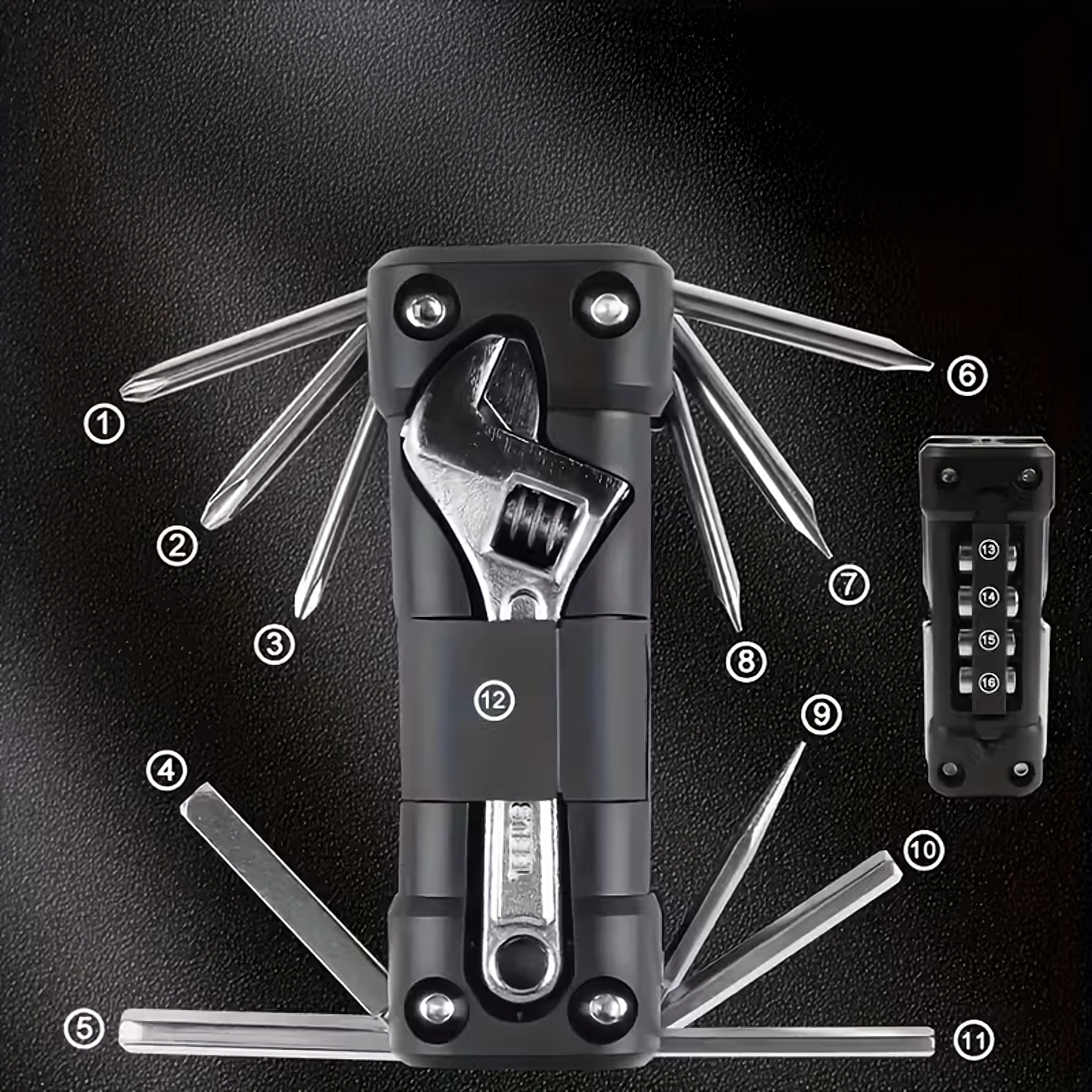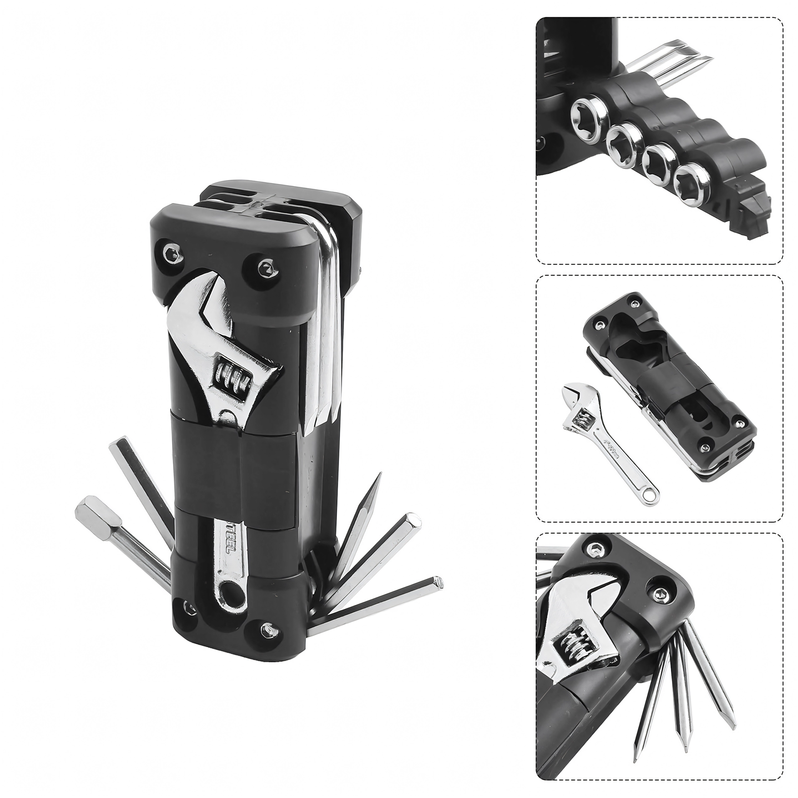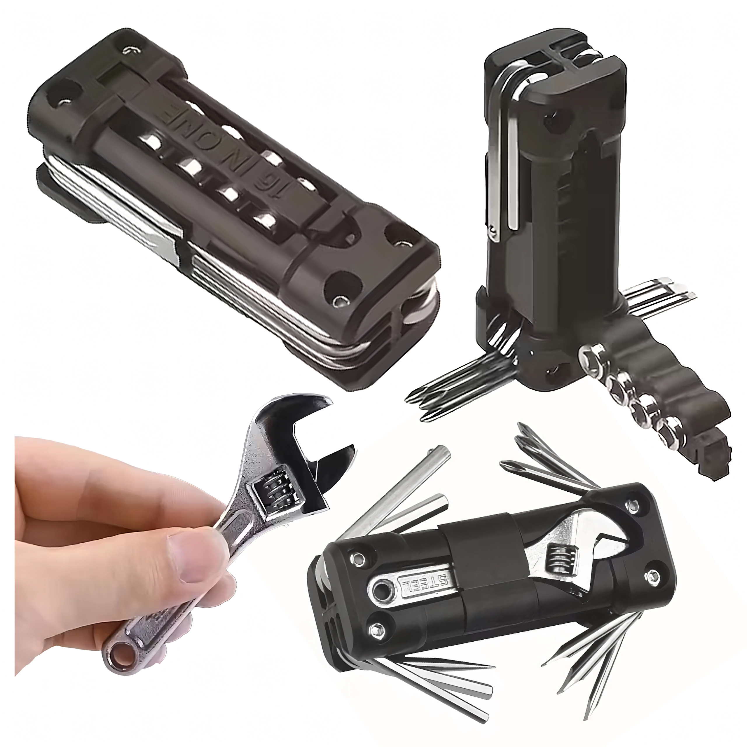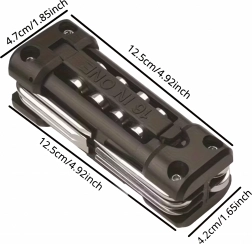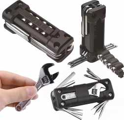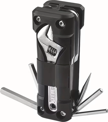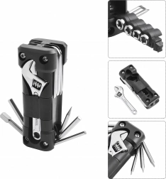 Det universelle 13-i-1 multitool tilbyder alt nødvendigt til tilspænding af skruer og hurtige justeringer på farten og derhjemme. Robuste metalværktøjer og et ergonomisk hus sikrer sikkert greb og lang levetid. Takket være den sammenklappelige konstruktion passer det nemt i lommen, sadeltasken eller handskerummet i bilen.