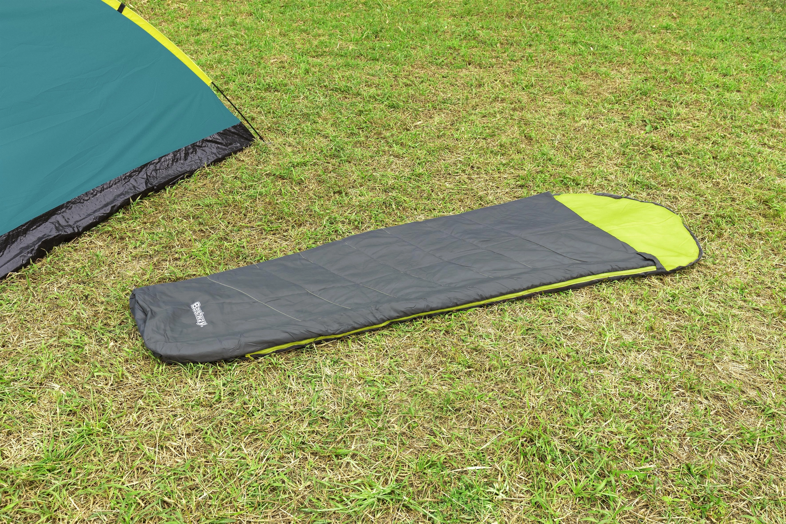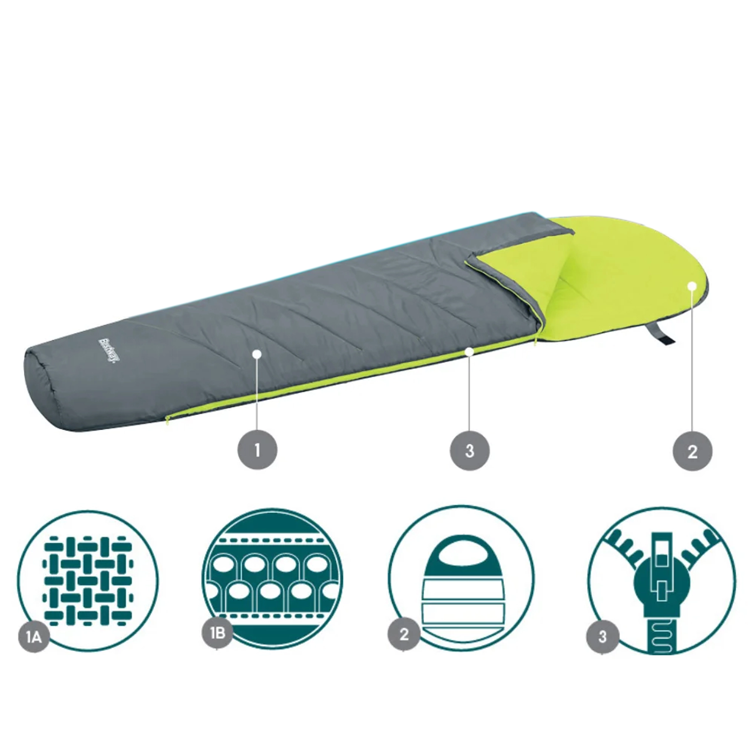 Nyd en rolig nattesøvn i naturen med Bestways sovepose i mumieform, der kombinerer lav vægt, holdbare materialer og pålidelig varmeisolering. Den halvcirkelformede hætte beskytter hoved og hals mod kulde, mens det robuste ydre materiale i polyester 170T modstår fugt og slid.