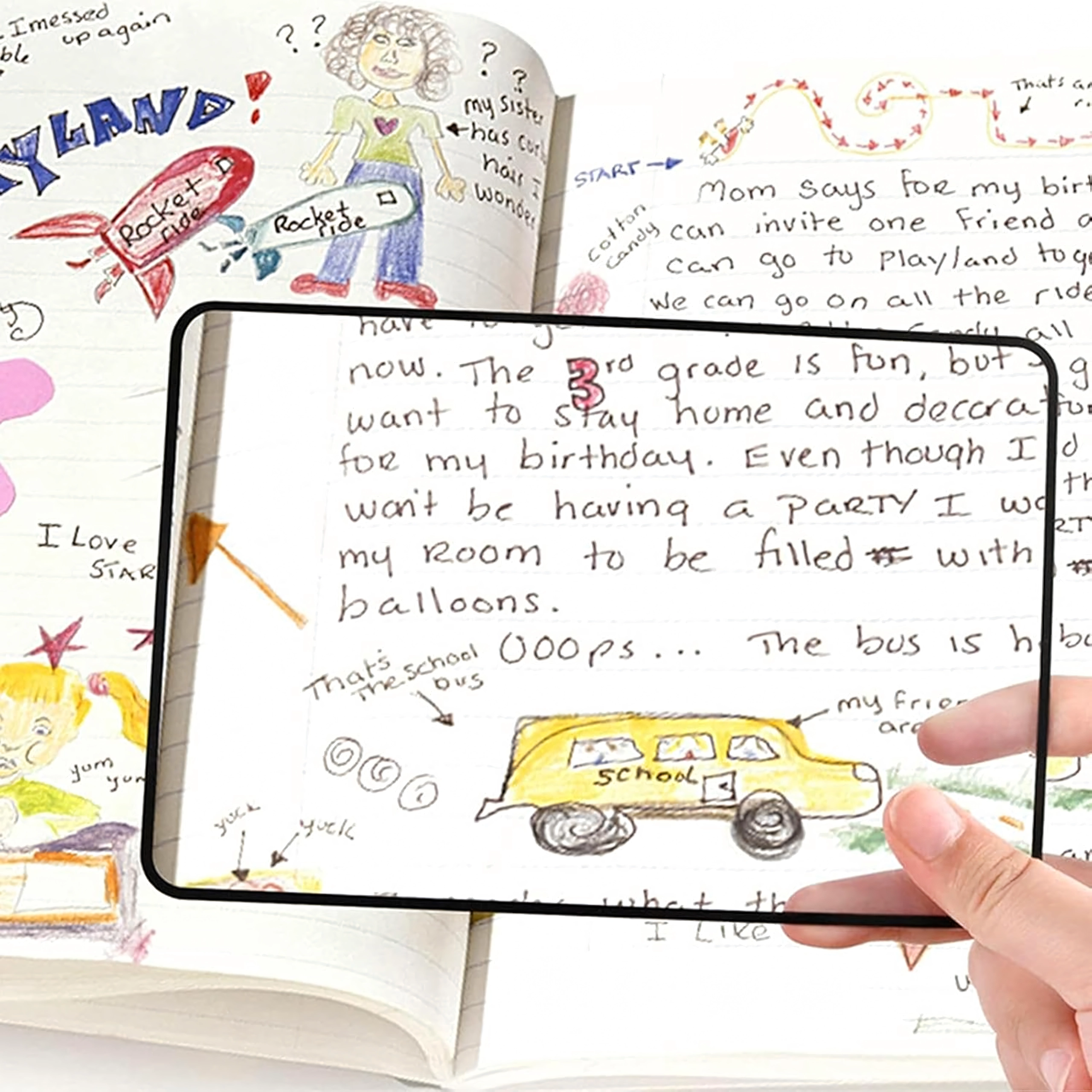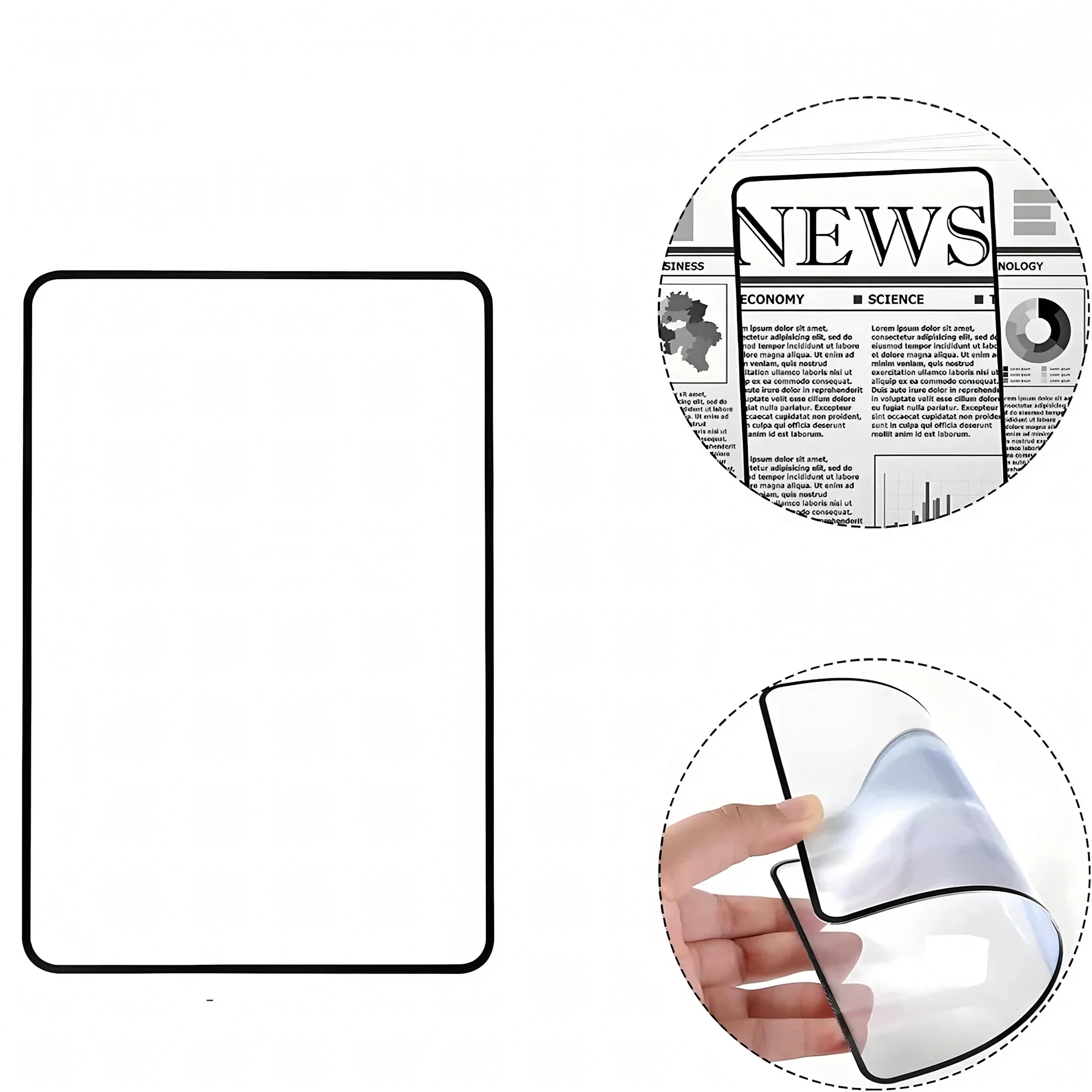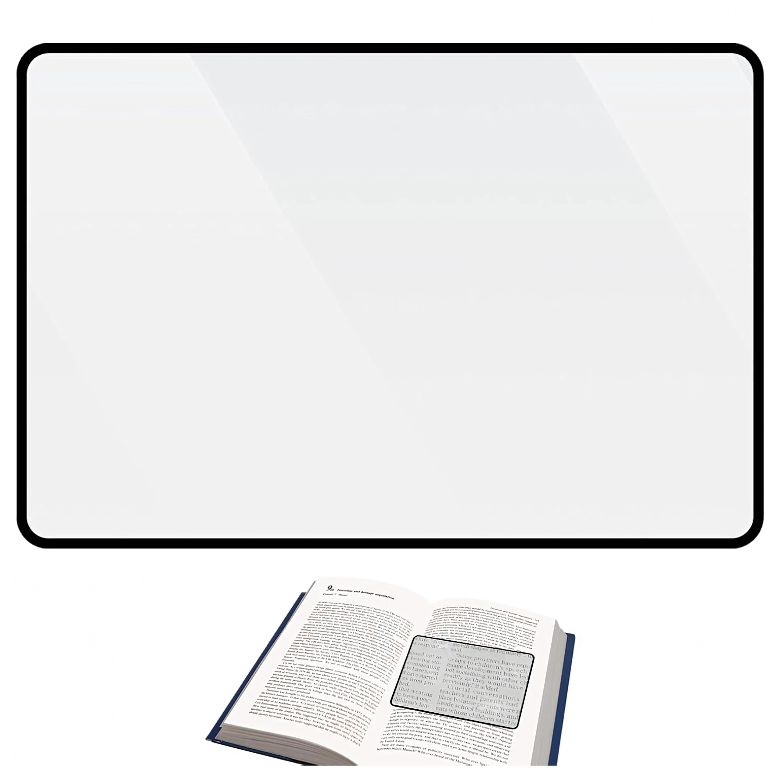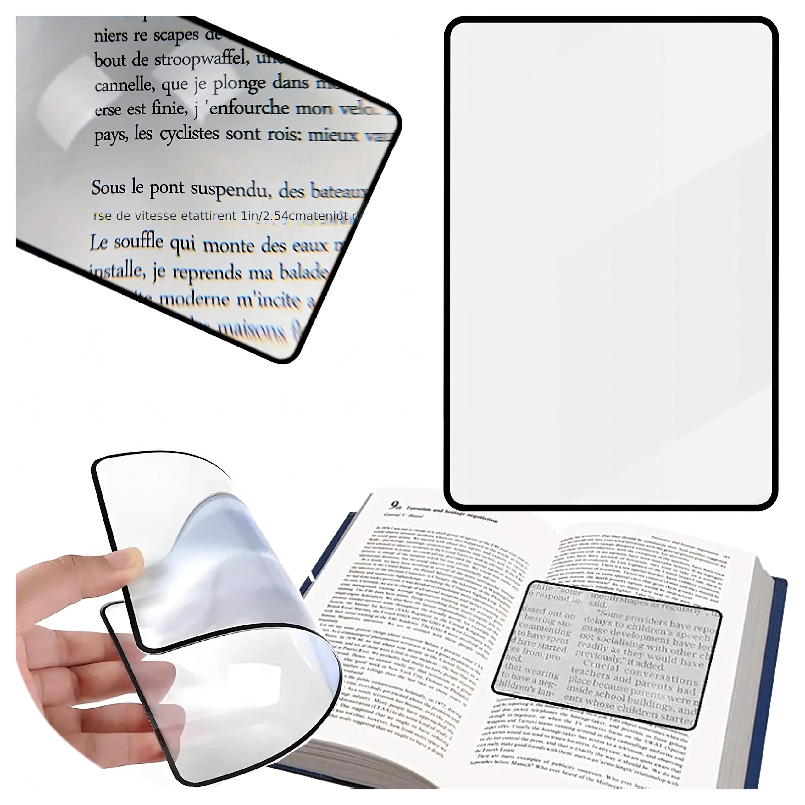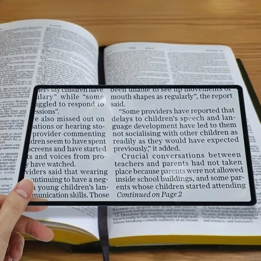 Praktisk sideforstørrelsesglas med fleksibelt plastlinsesheet forstørrer tekst og detaljer med op til 200 %. Takket være det slanke design med let ramme ligger det godt i hånden, kan lægges direkte på siden og giver læsning uden at anstrenge øjnene.